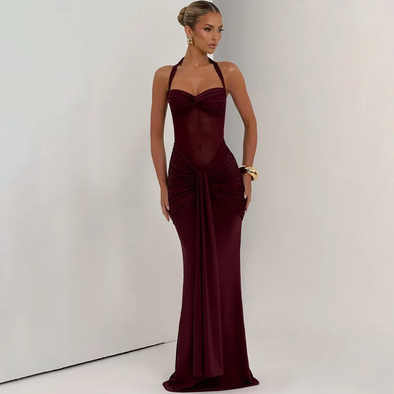 Women's Summer Yellow Halter Backless Maxi Dress High Waist with Pleats Draped Decoration Anti-Static Nylon Solid Pattern