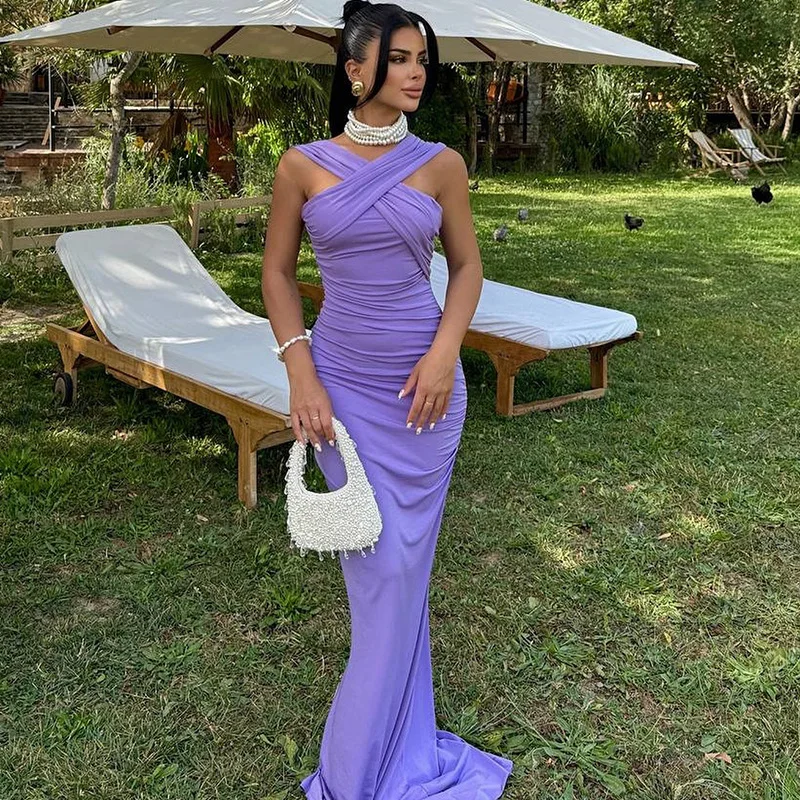 ZYHT 73849 European Wholesale Fashion Casual One Shoulder Ruched Maxi Dress Side Slit Pleated Long Sleeve Dresses for Women