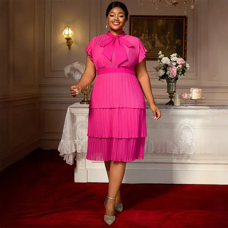 Women's Casual Summer Midi Dress Short-Sleeved Loose Chiffon Tie Bow Natural Waist Woven Pleated Rose Pattern Breathable