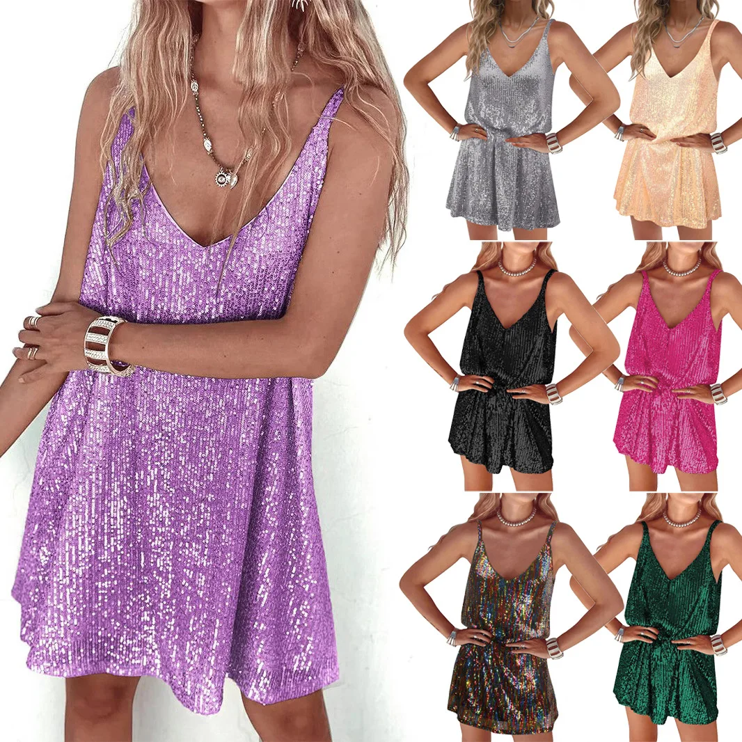 Women's Summer V-Neck Sequin Dress XL Size Loose A-Line with Natural Waistline Anti-Static Ready to Wear Sexy Girl Look
