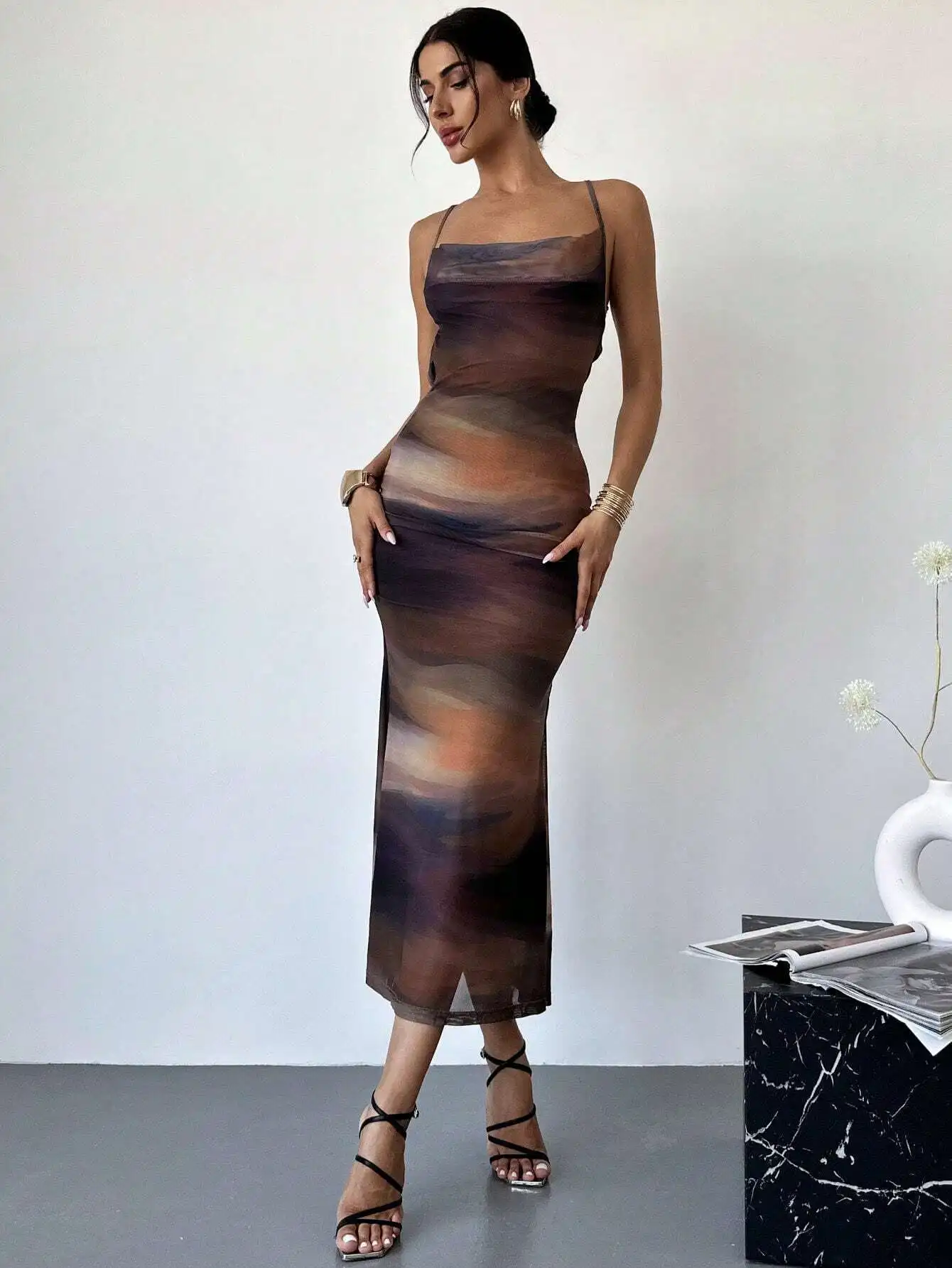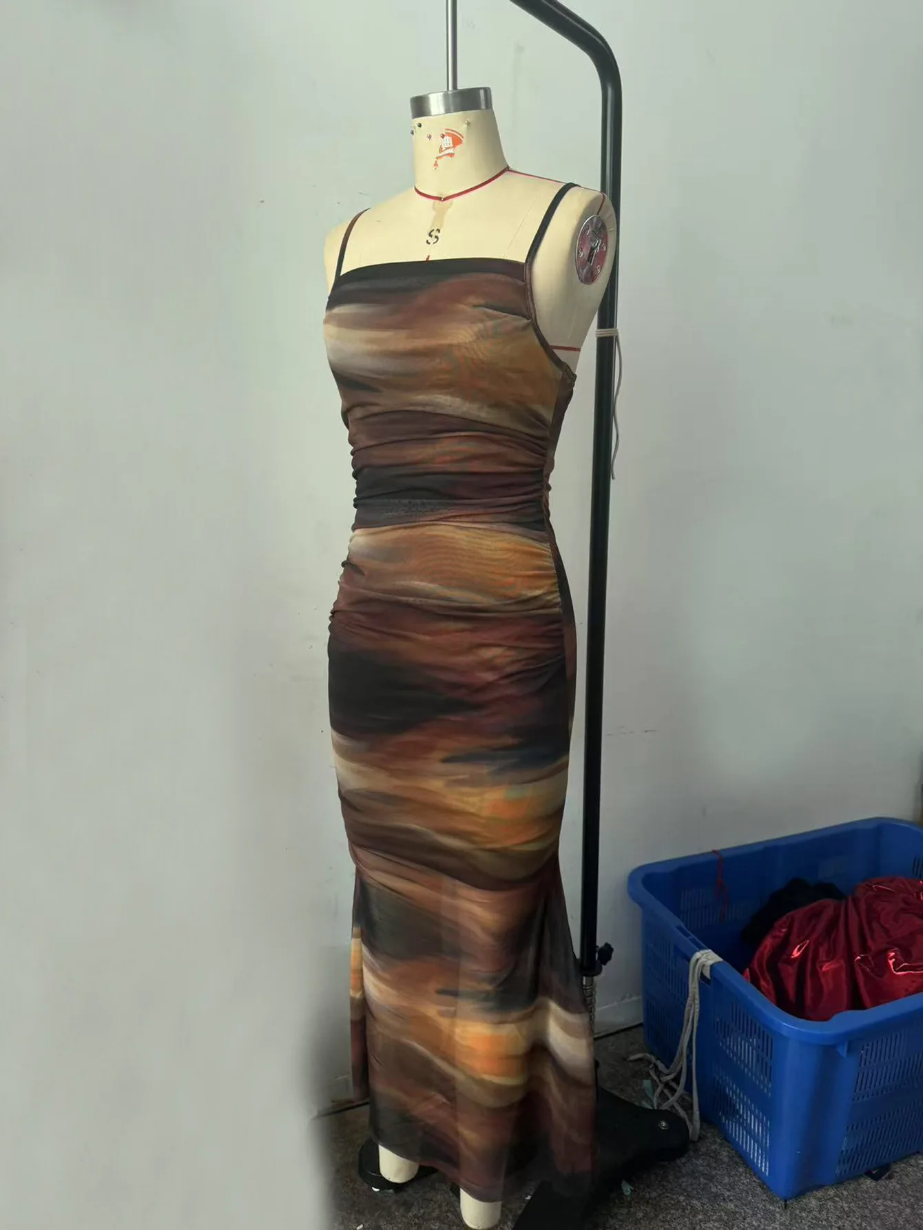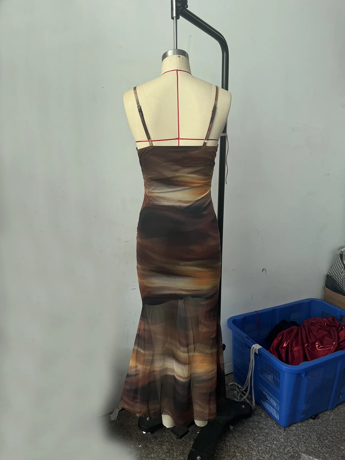 Women's Woven Breathable Tie Dye Ruched Fishtail Maxi Dress Mesh Weft Party Ruffle Cami Dresses