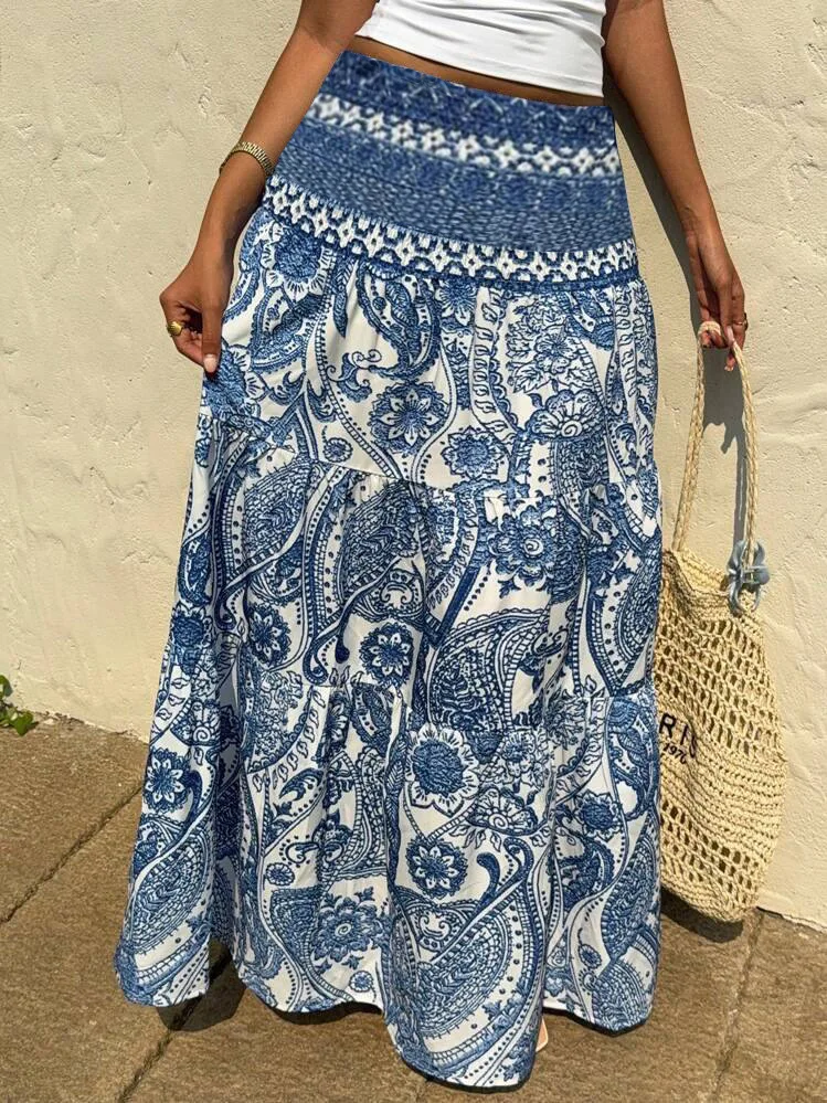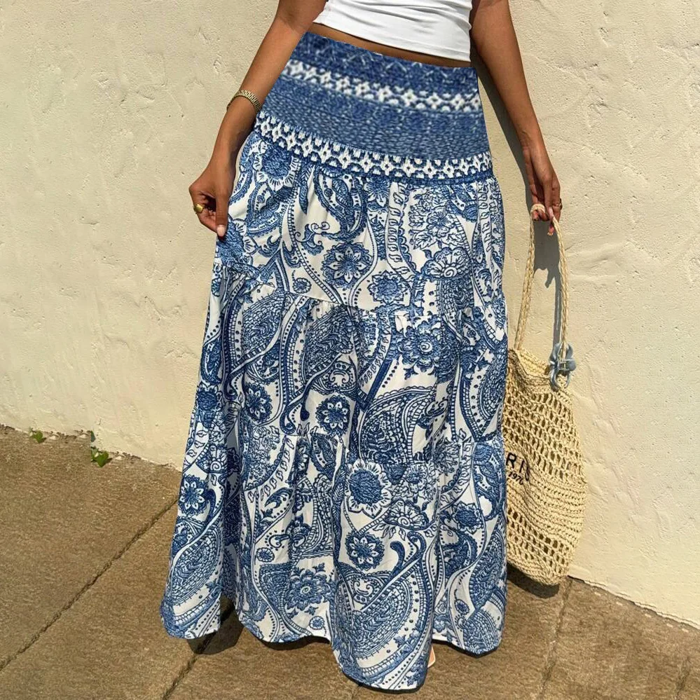 Women's Casual A-Line Floral Long Skirt High-Waisted with Elastic Floral Vintage Style for Spring Season Worsted Fabric