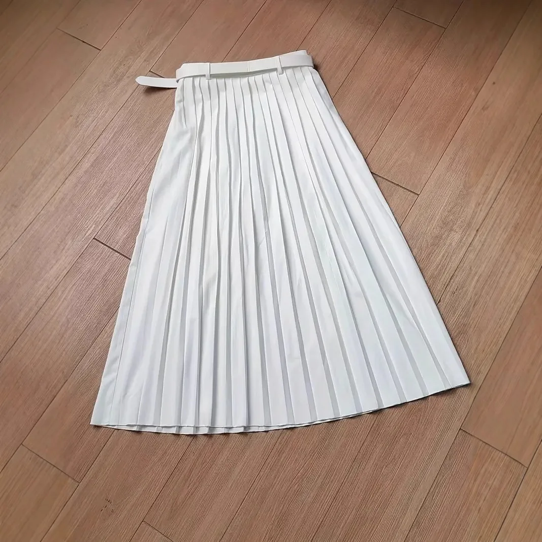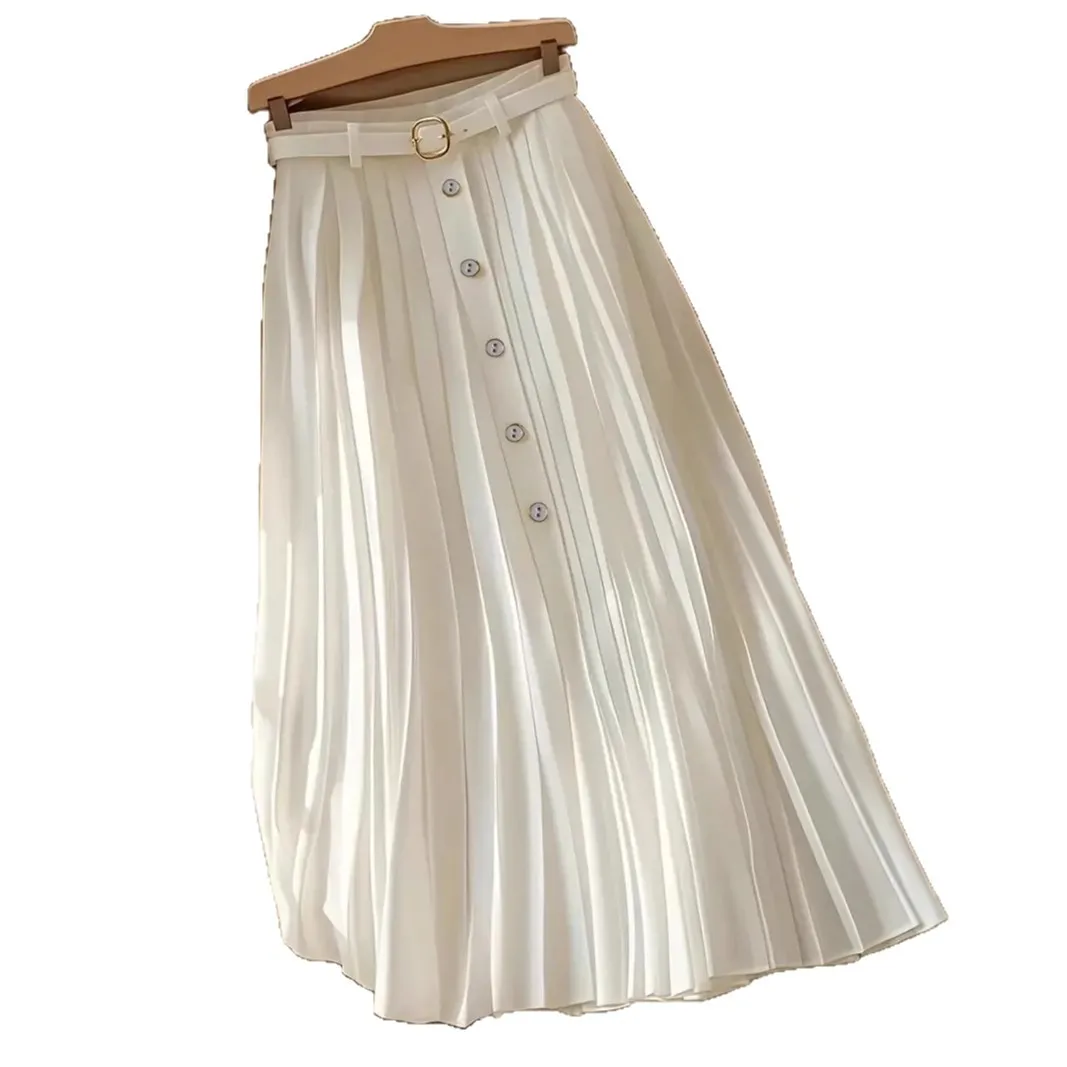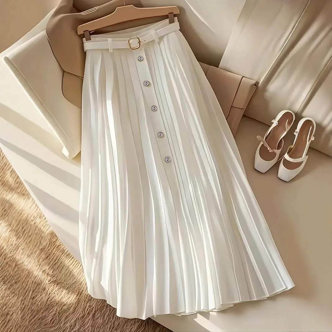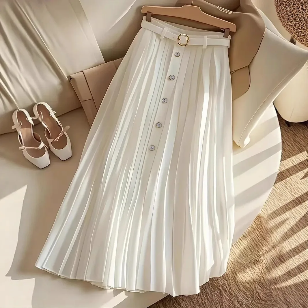 2025 Elegant Vintage Midi Skirt with Pleats Soft and Breathable Belt Soft and Breathable Elegant Temperament