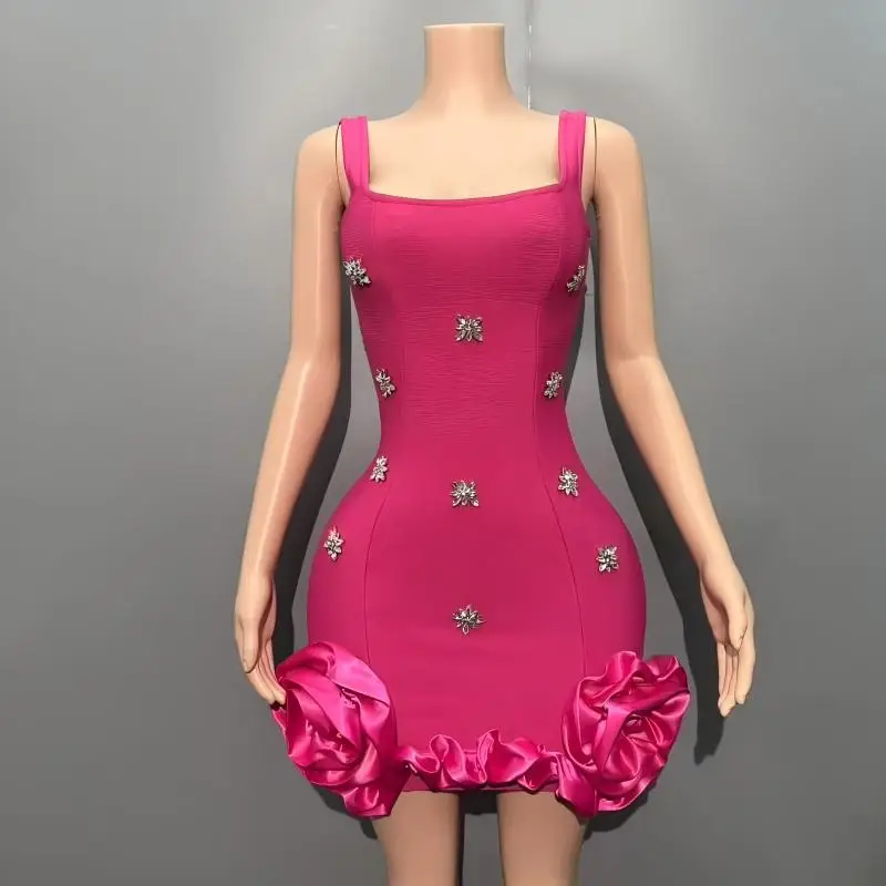 High Quality Women's Sexy Mini Dress Bodycon Empire Club Birthday Gowns Floral Rhinestone Decor pink Prom Dresses