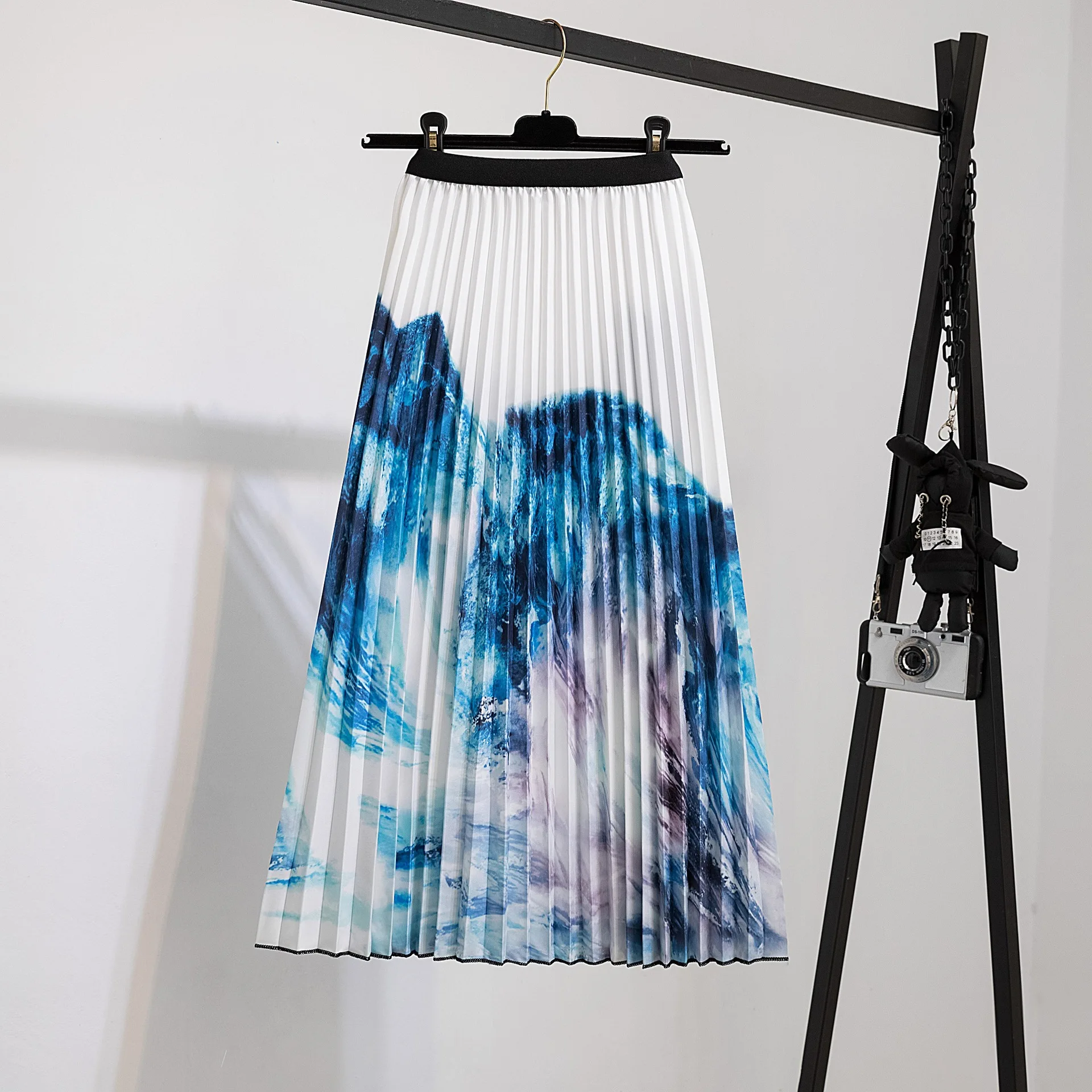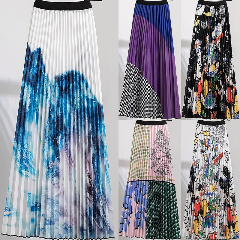 Online Wholesale Supplier European Digital Printing Pleated Skirts for Women Elastic Waist New Cross-Border Supply Faldas Largas