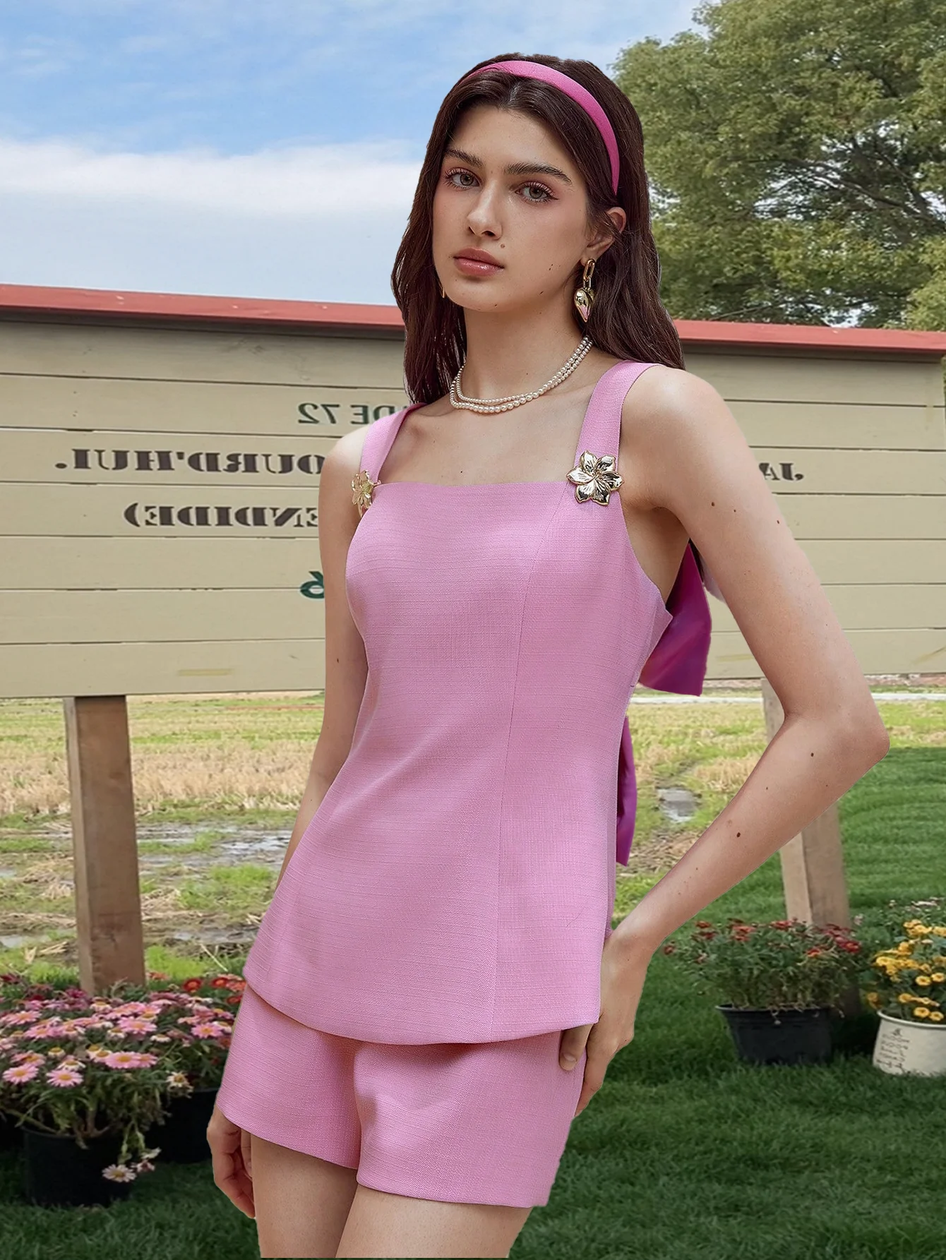 2025 Summer Celebrity Jumpsuit Bowknot Backless pink Shorts slip Dress Two Pieces Set