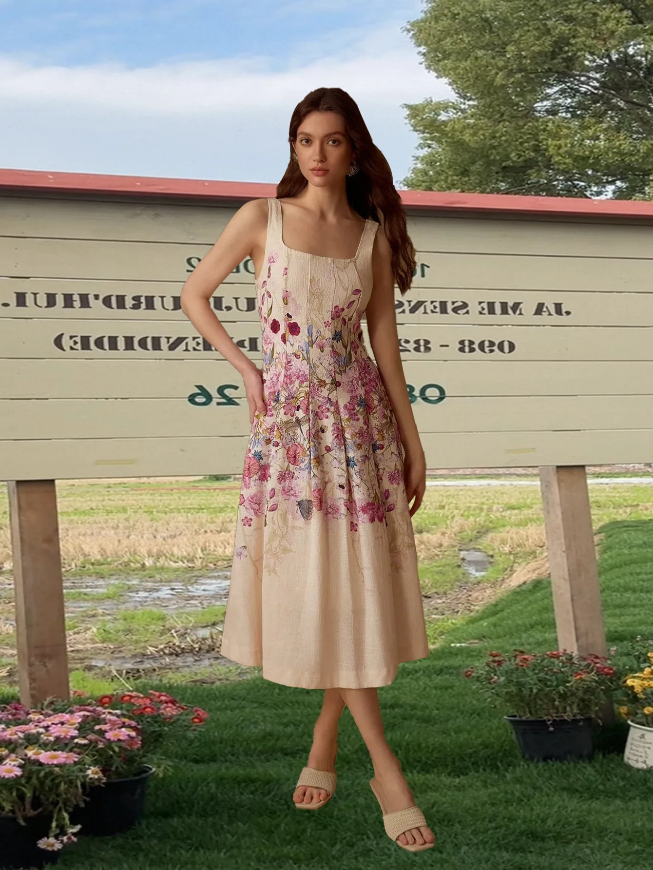 ZYHT 73957 Hot Selling Women Lady Printed Satin Beige Mermaid Fish Tail Floor Length Party Cocktail Evening Dress Gown