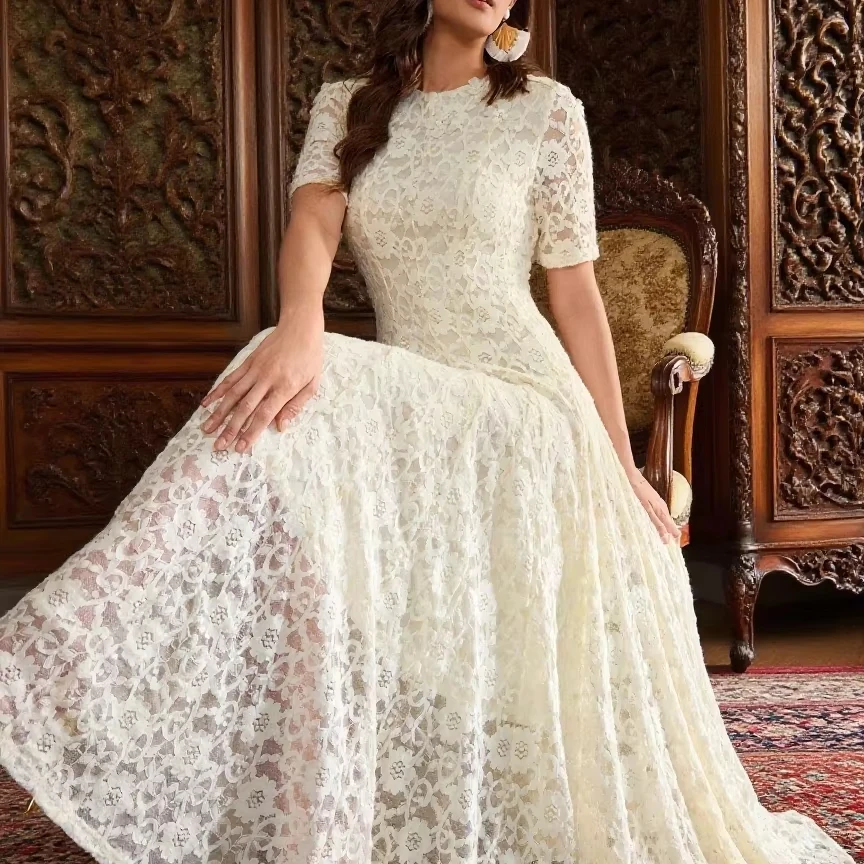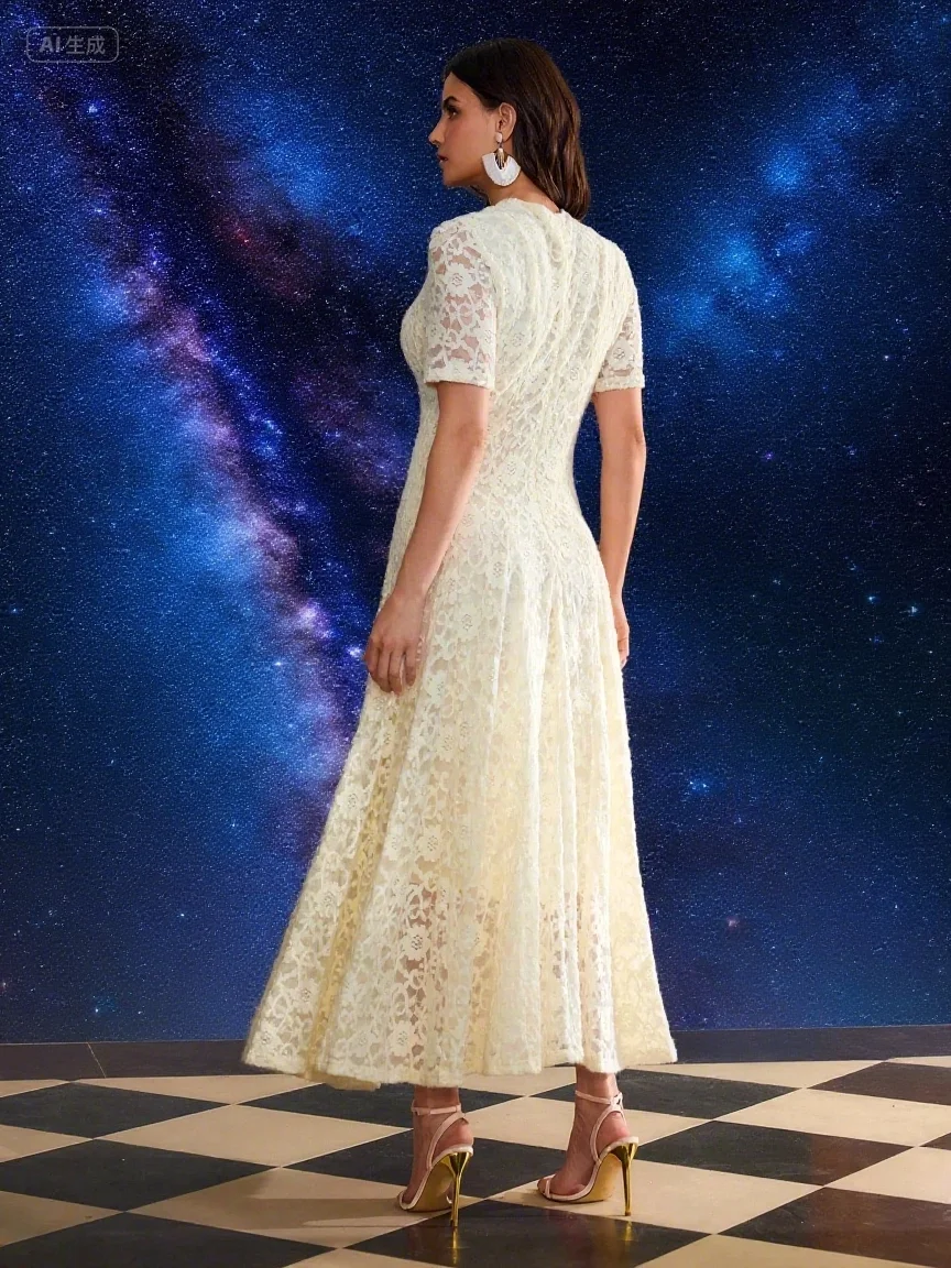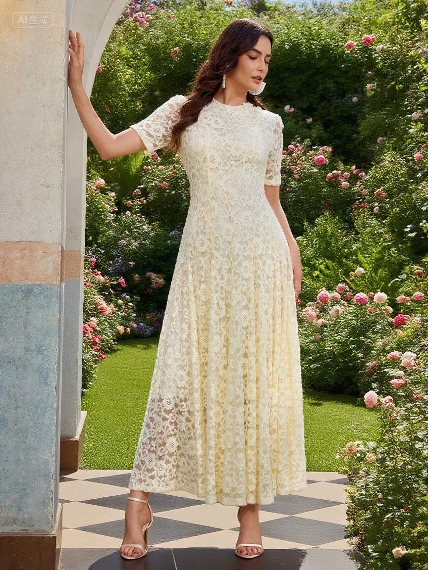 2025 Summer Vintage Style Women Fashion Solid Midi-Length Neck Short Sleeve Slim Fit Opening Design Buckle Maxi Dresses Digital