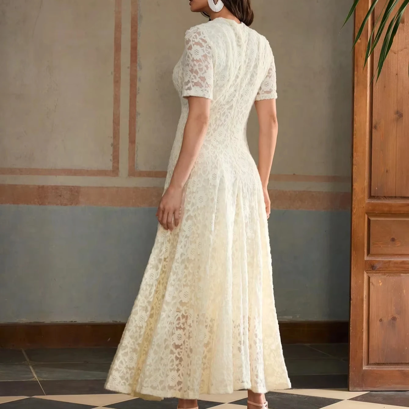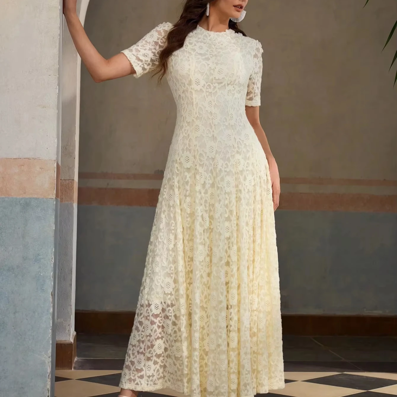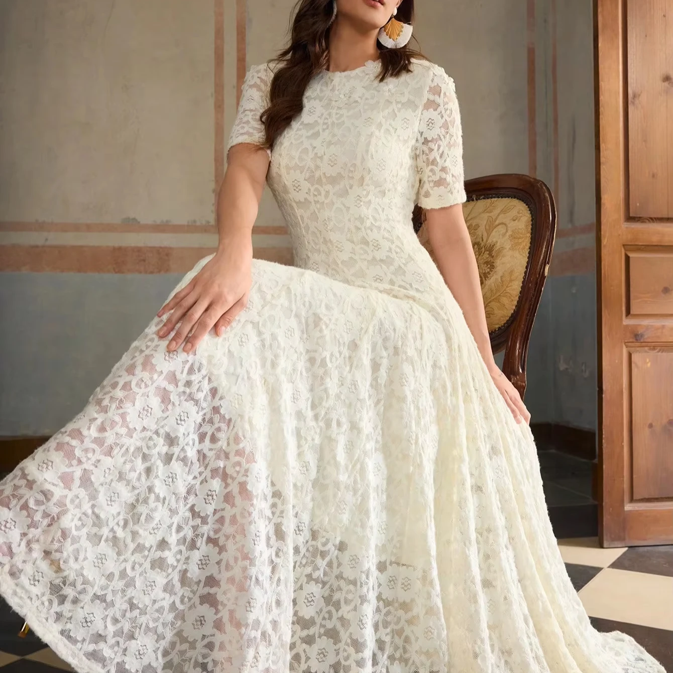 Brand Custom Women's Vintage White Pink Lace Dress Allover Crochet Embroidery Floral Pattern Flare Sleeves Ruffle Maxi Dress