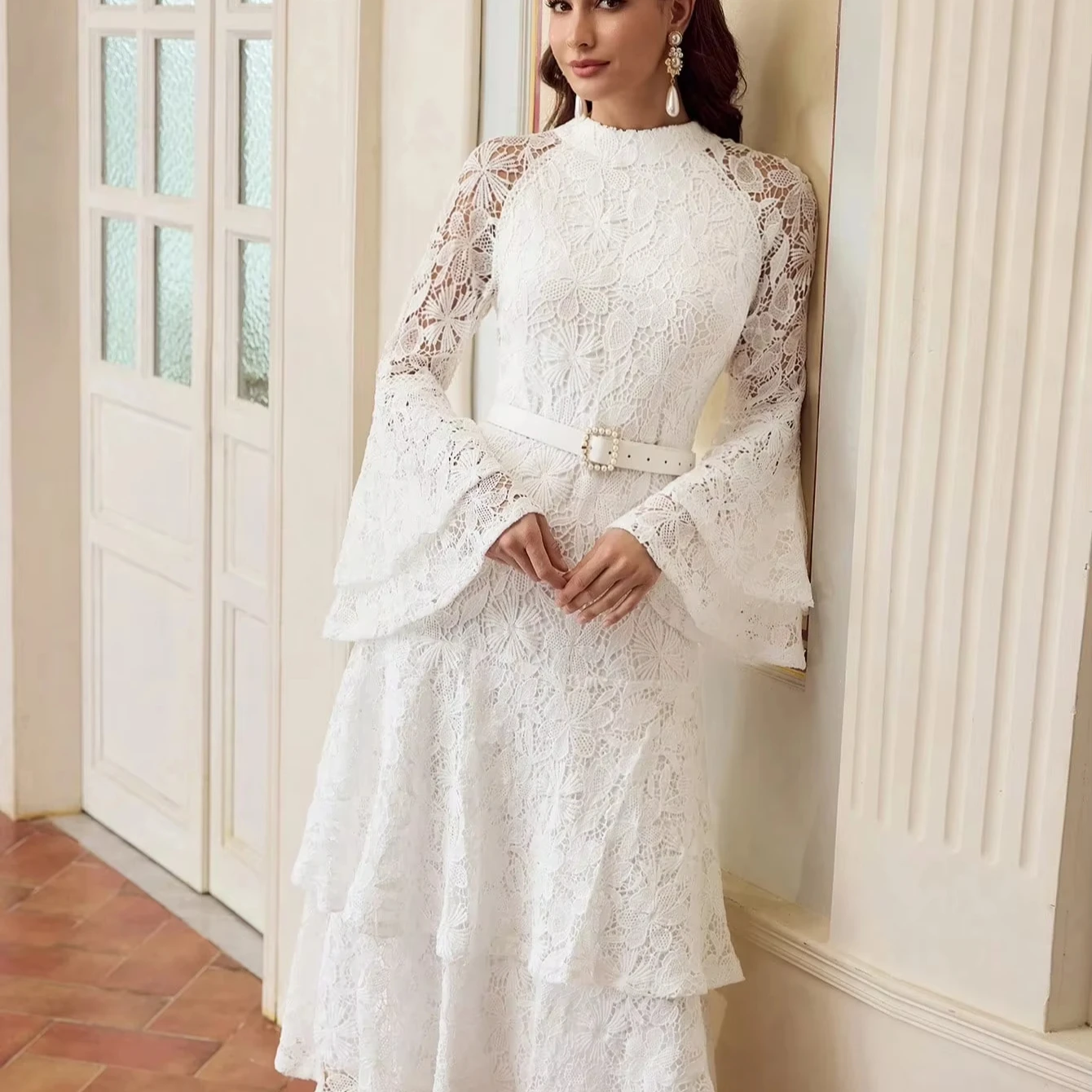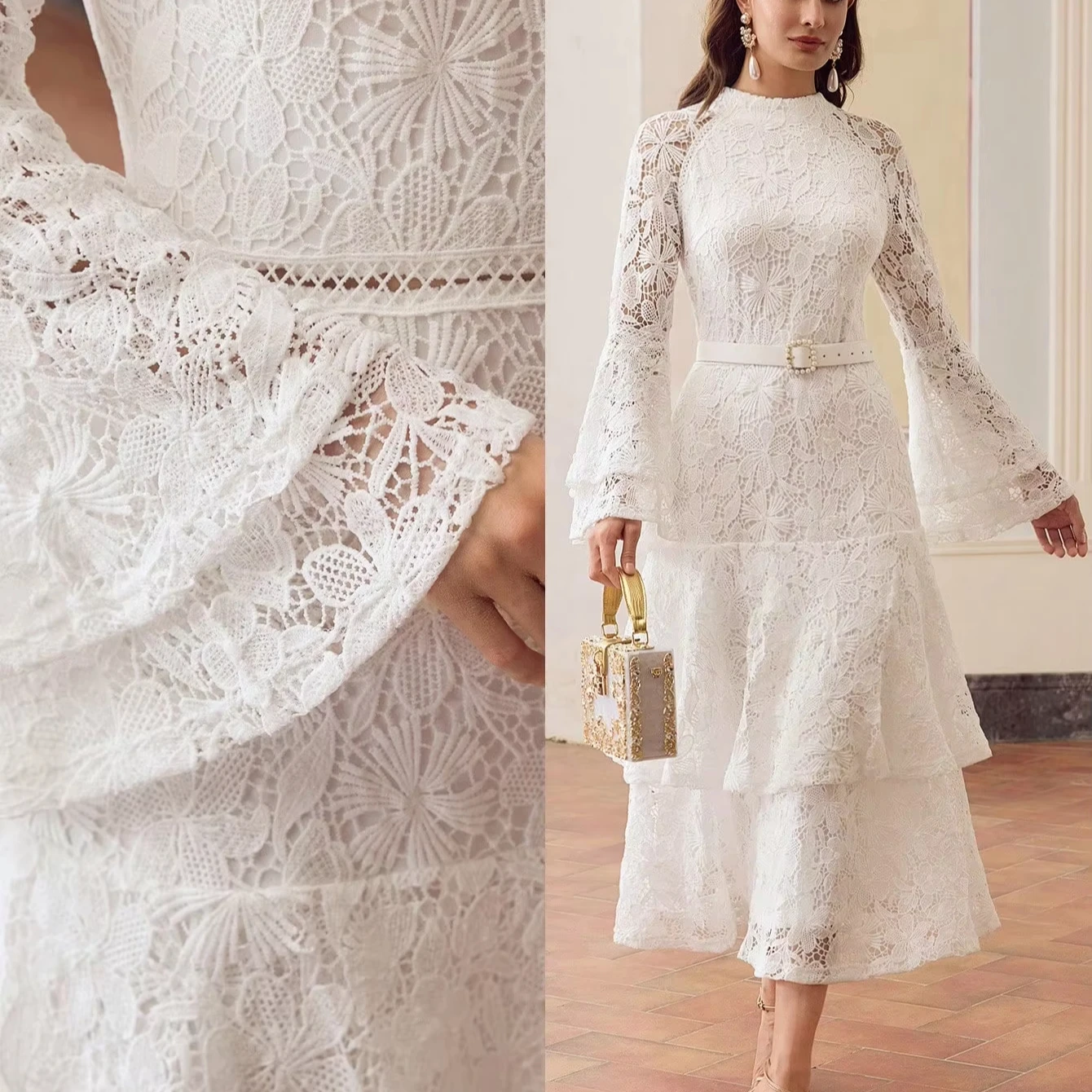 ZYHT 15325 Wholesale Spring Trendy Fashion Long Sleeve Dinner White Lace Black Velvet Elegant Party Dress Women Evening Dresses