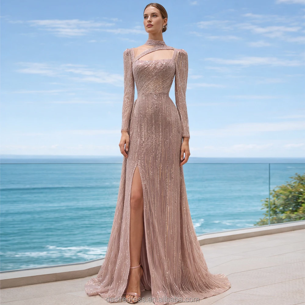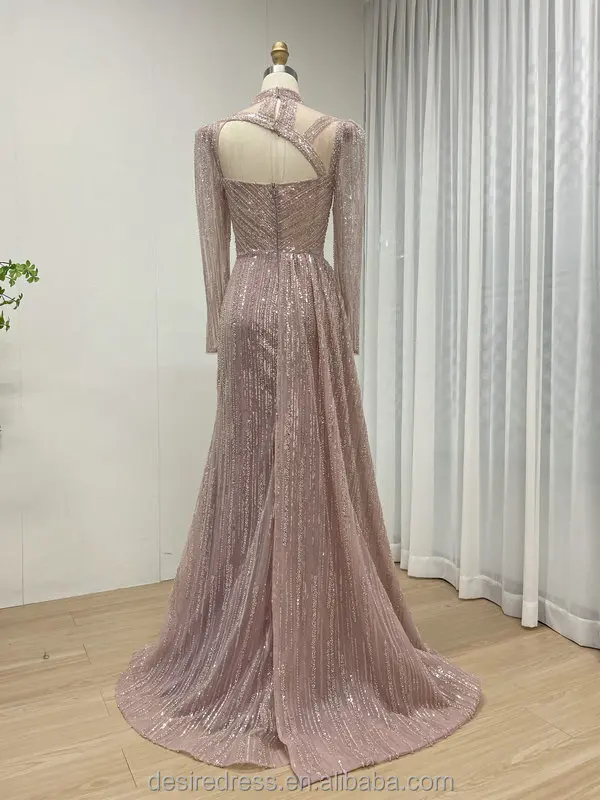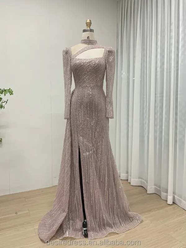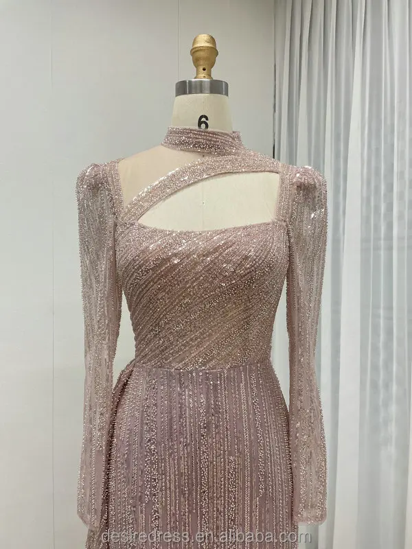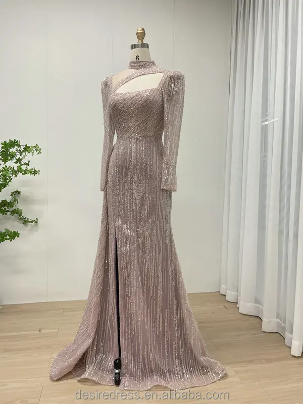 MB40316 Newest Design Hot Selling Exquisite Beaded Embroidery Elegant High Slit Pink Long Sleeve Muslim Long Sleeve Dresses Gown