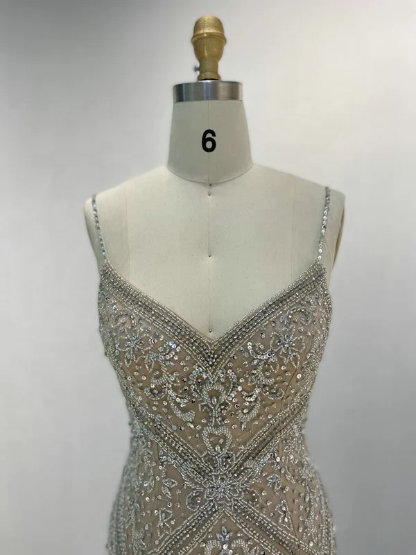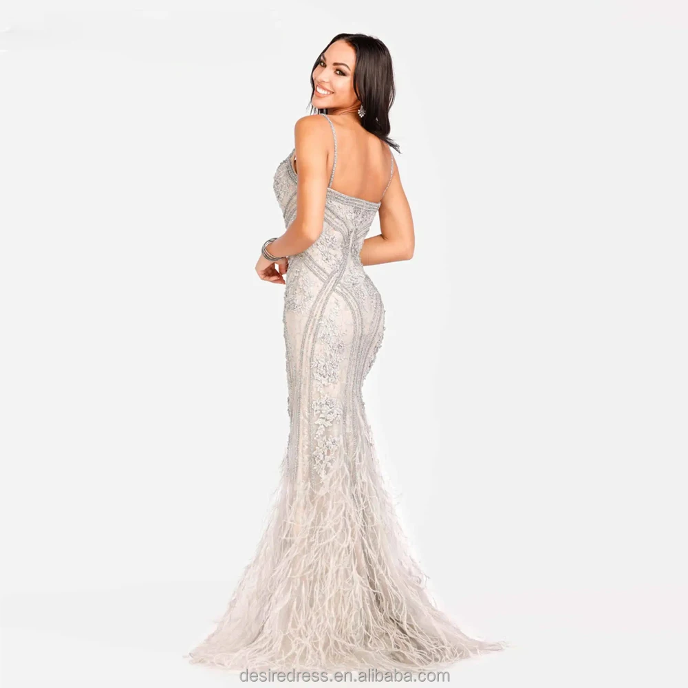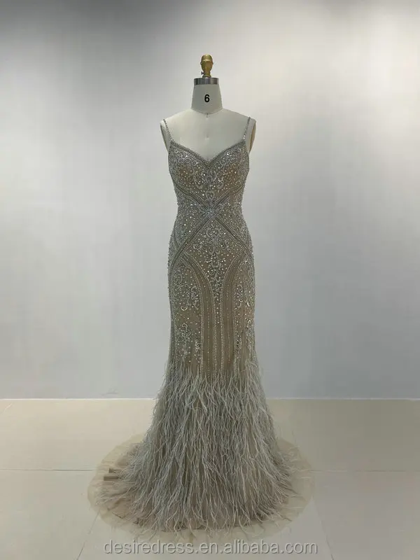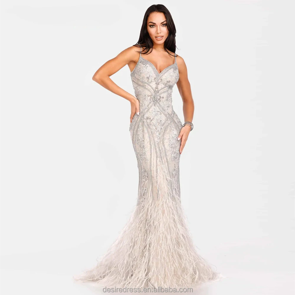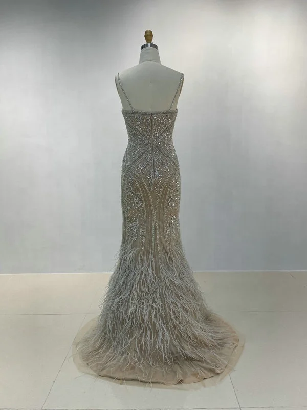 MB20018 Champagne Sleeveless Spaghetti Strap Mermaid Beaded Long Evening Dresses With Feathers Wedding Party Gowns for Women