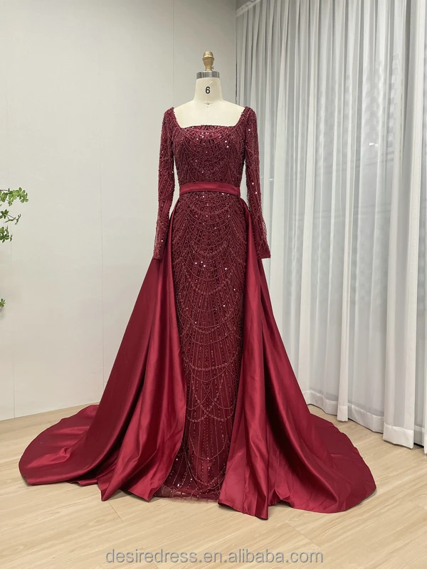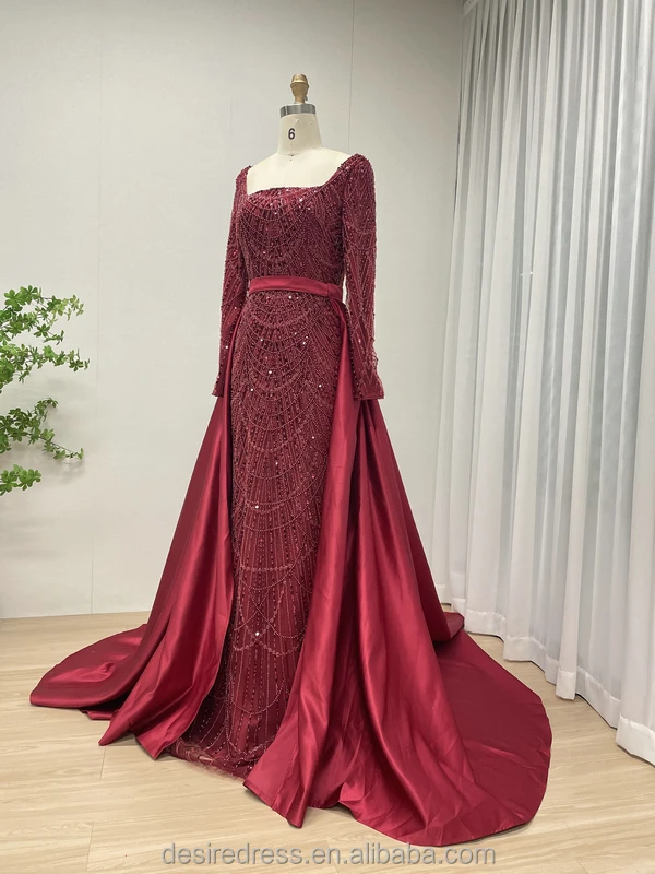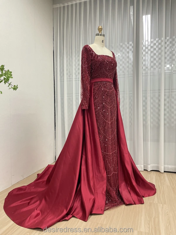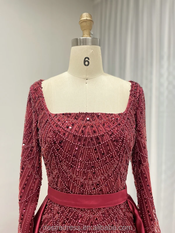 MY30153 Dubai Muslim Red Long Sleeves Evening Dress Beaded Square Neckline Plus Size Women Train Overskirt Wedding Party Gowns