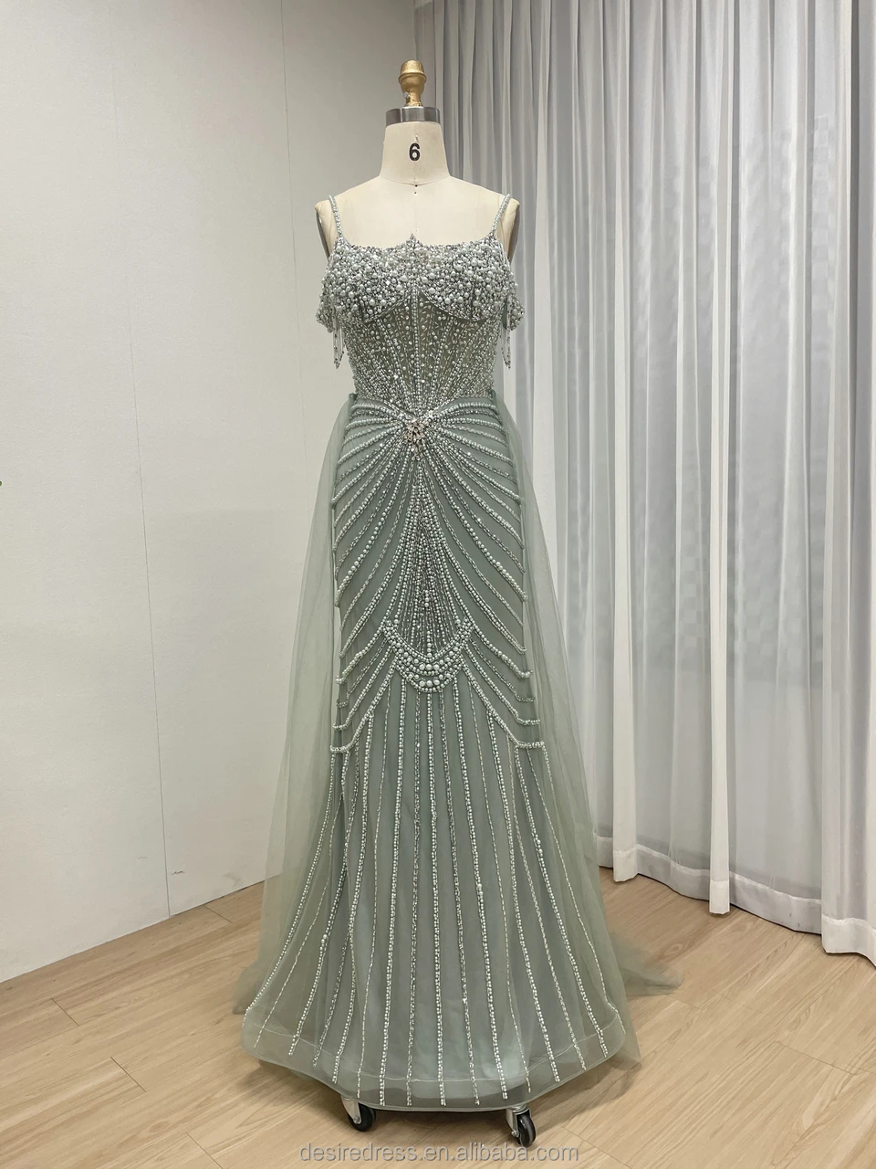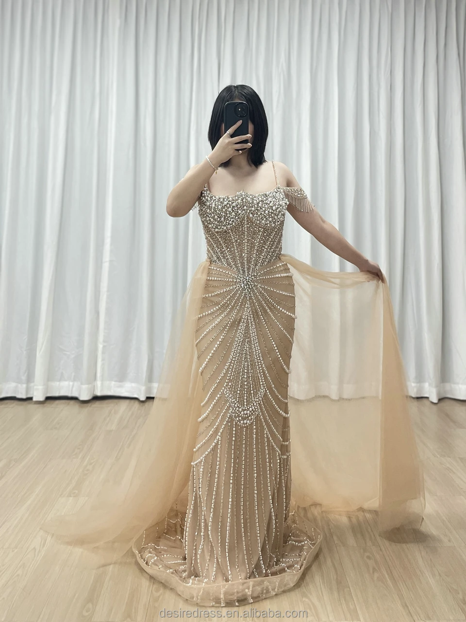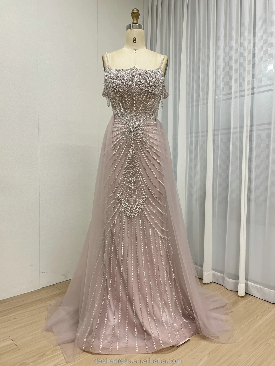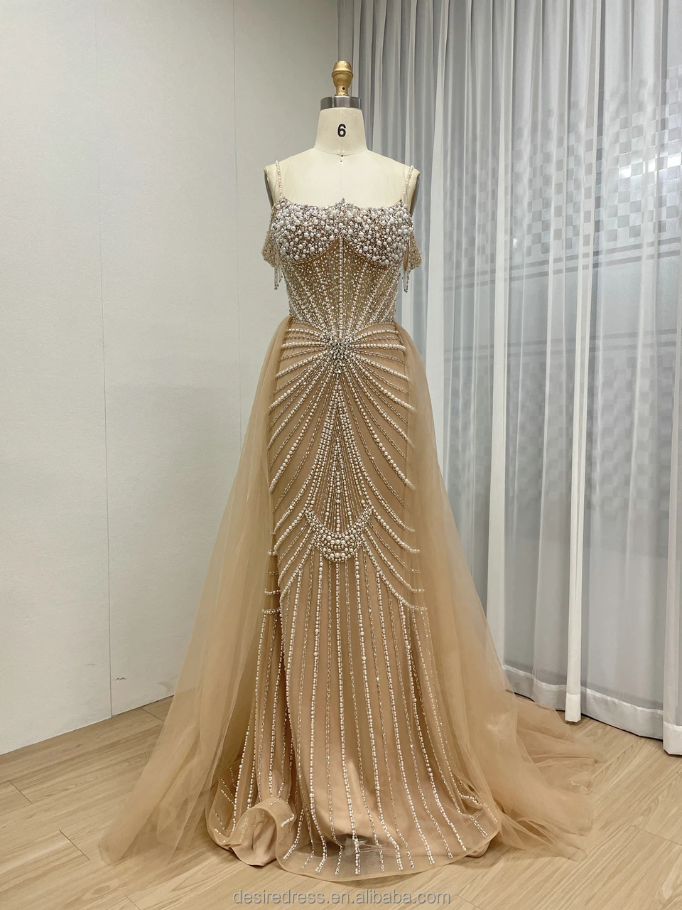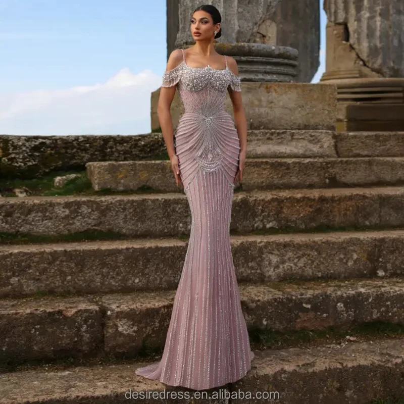 MY30160 Champagne Spaghetti Strap Mermaid Luxury Beaded Crystal Evening Gown with Overskirt Elegant pink Party Dresses for Women