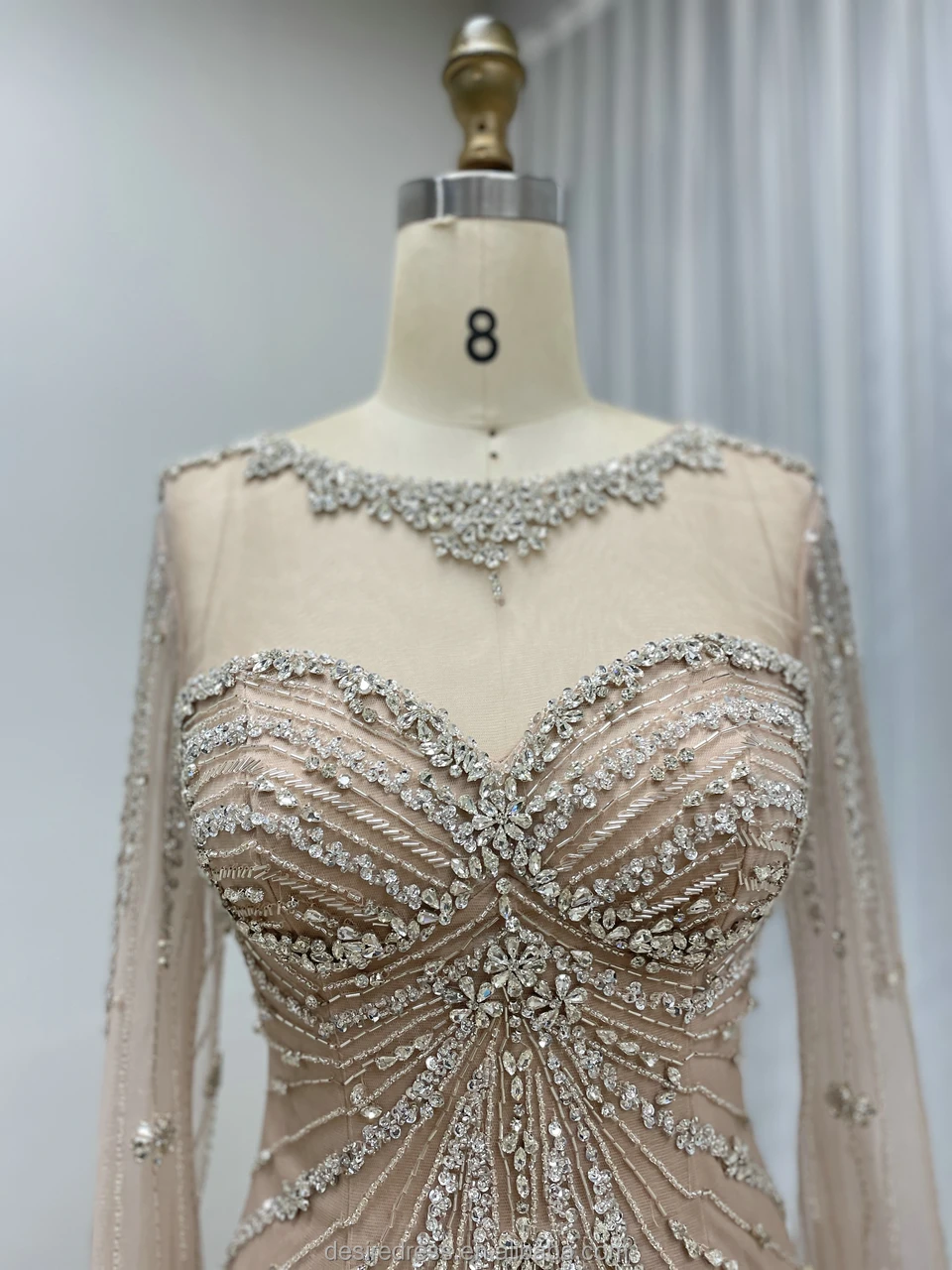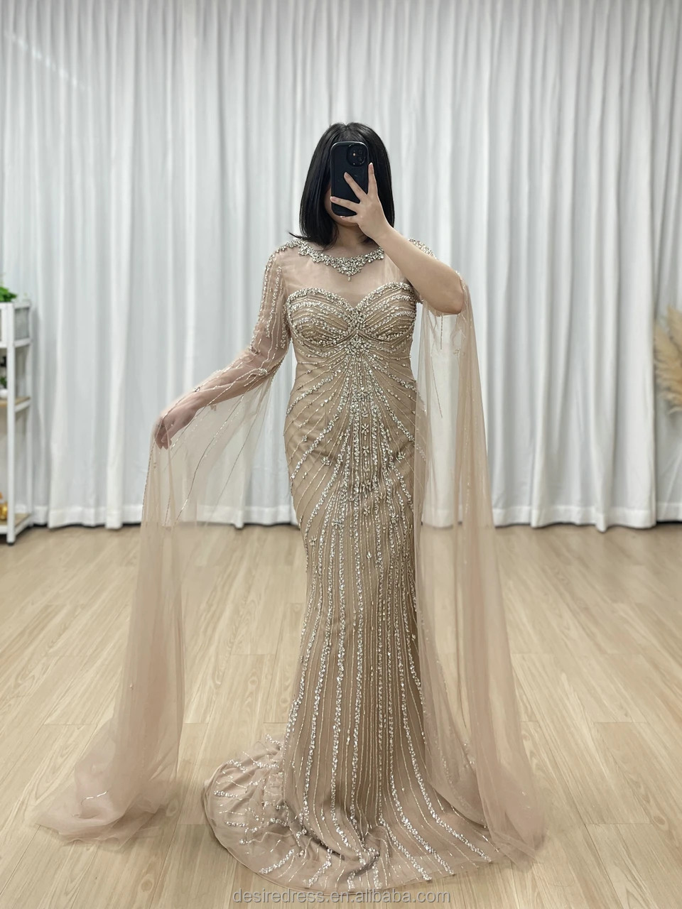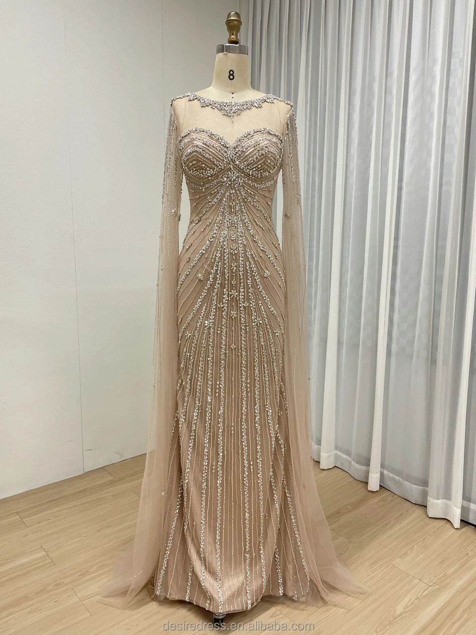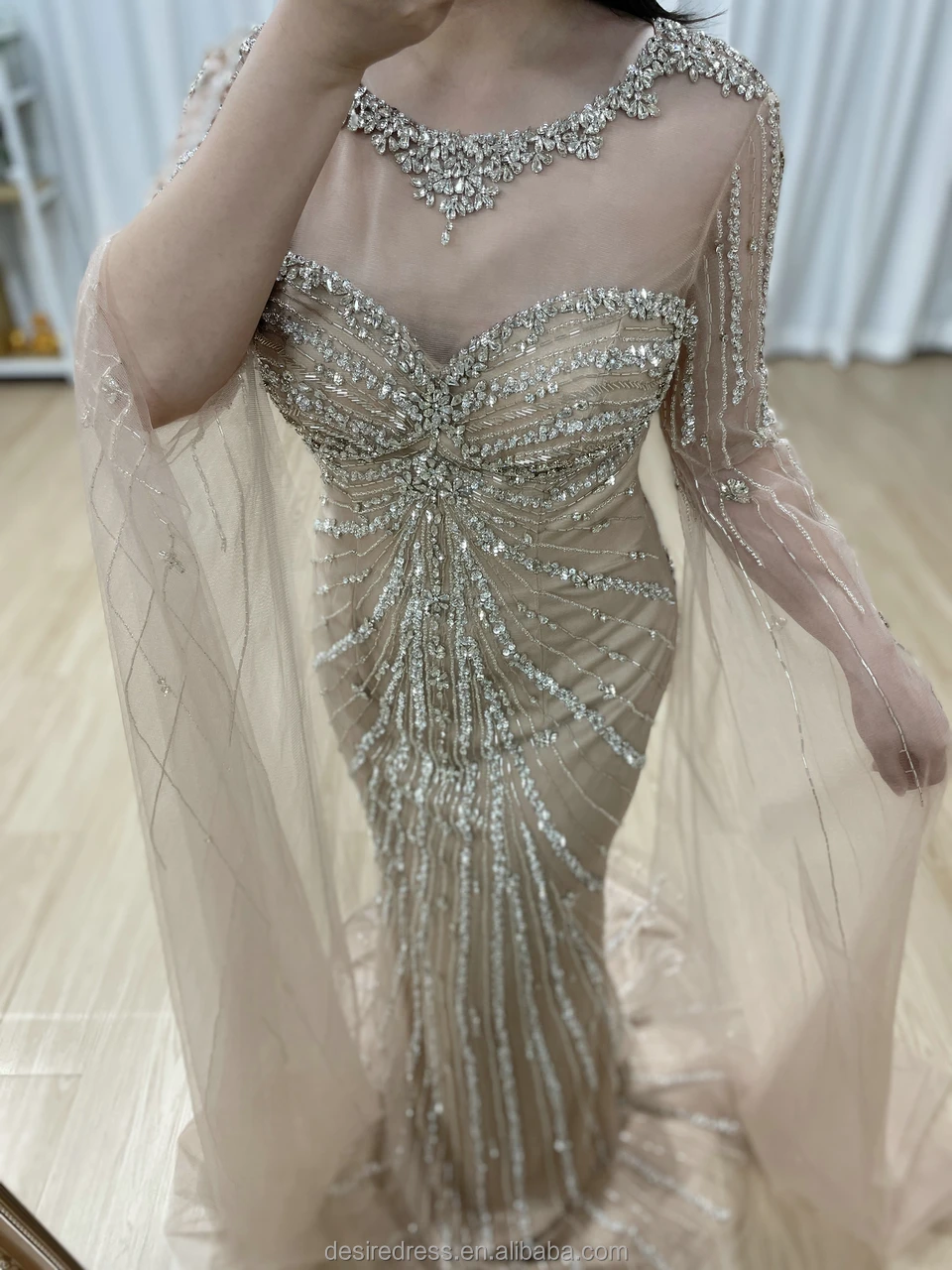 MC20121 Luxury Arabic Caramel Cape Sleeves Green Mermaid Evening Dresses Beaded Crystal Formal Party Gowns for Women Lady