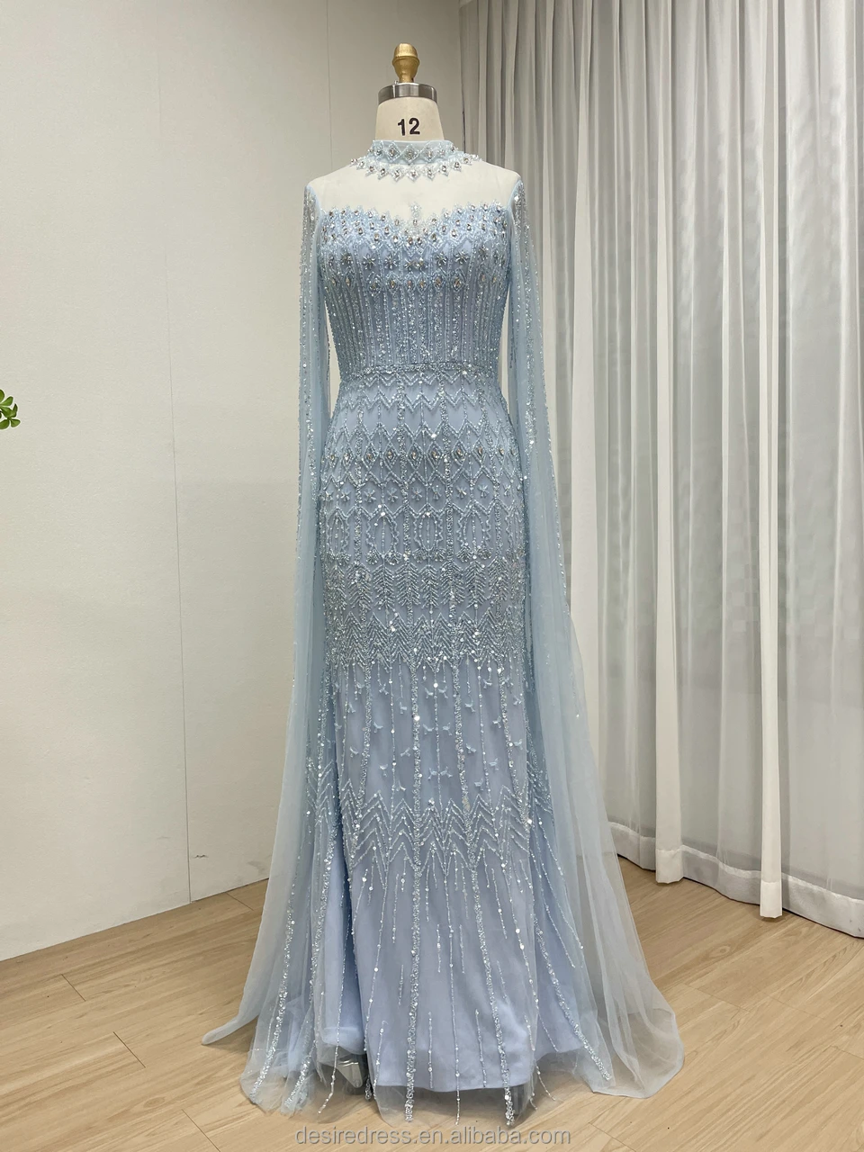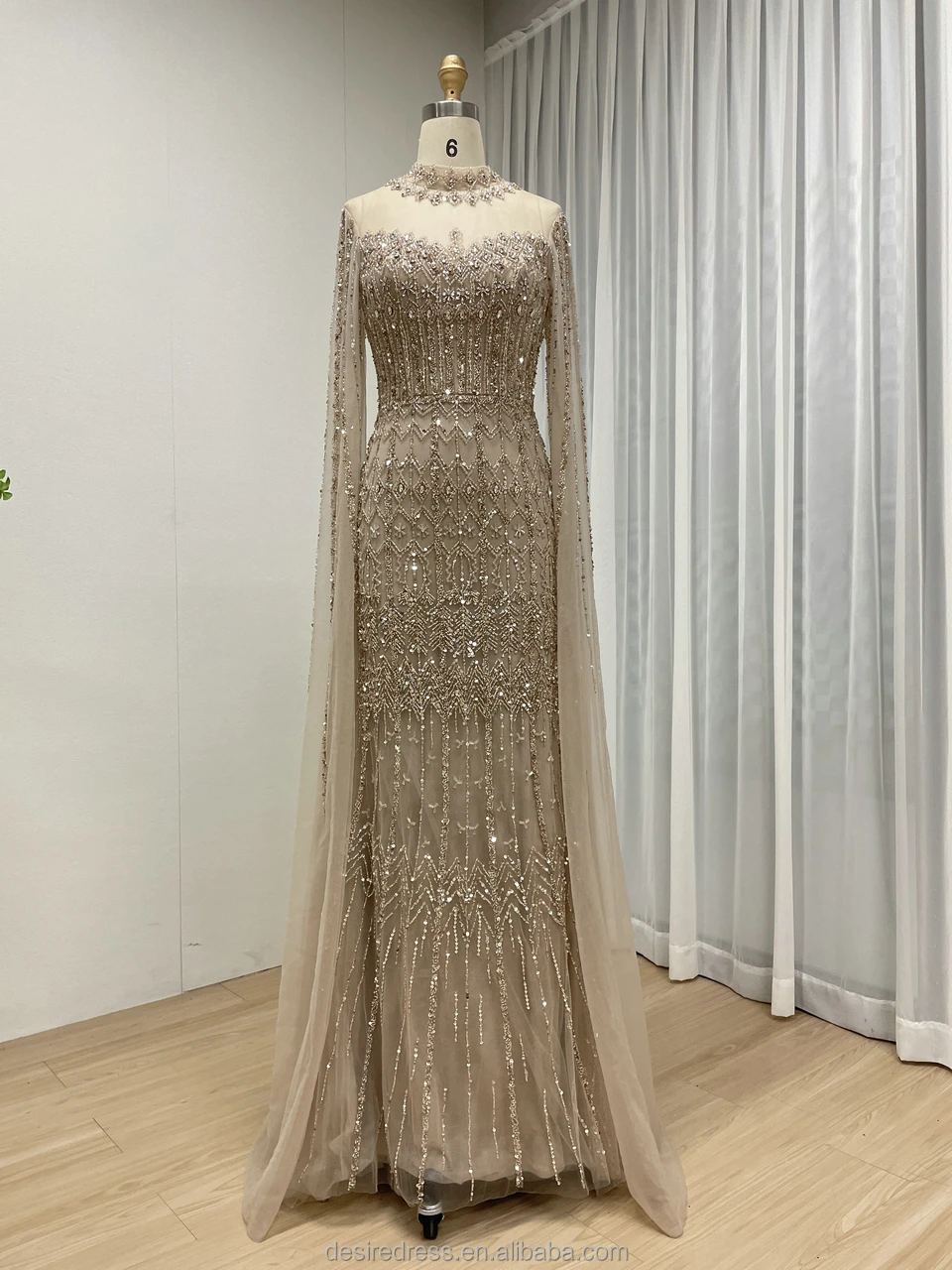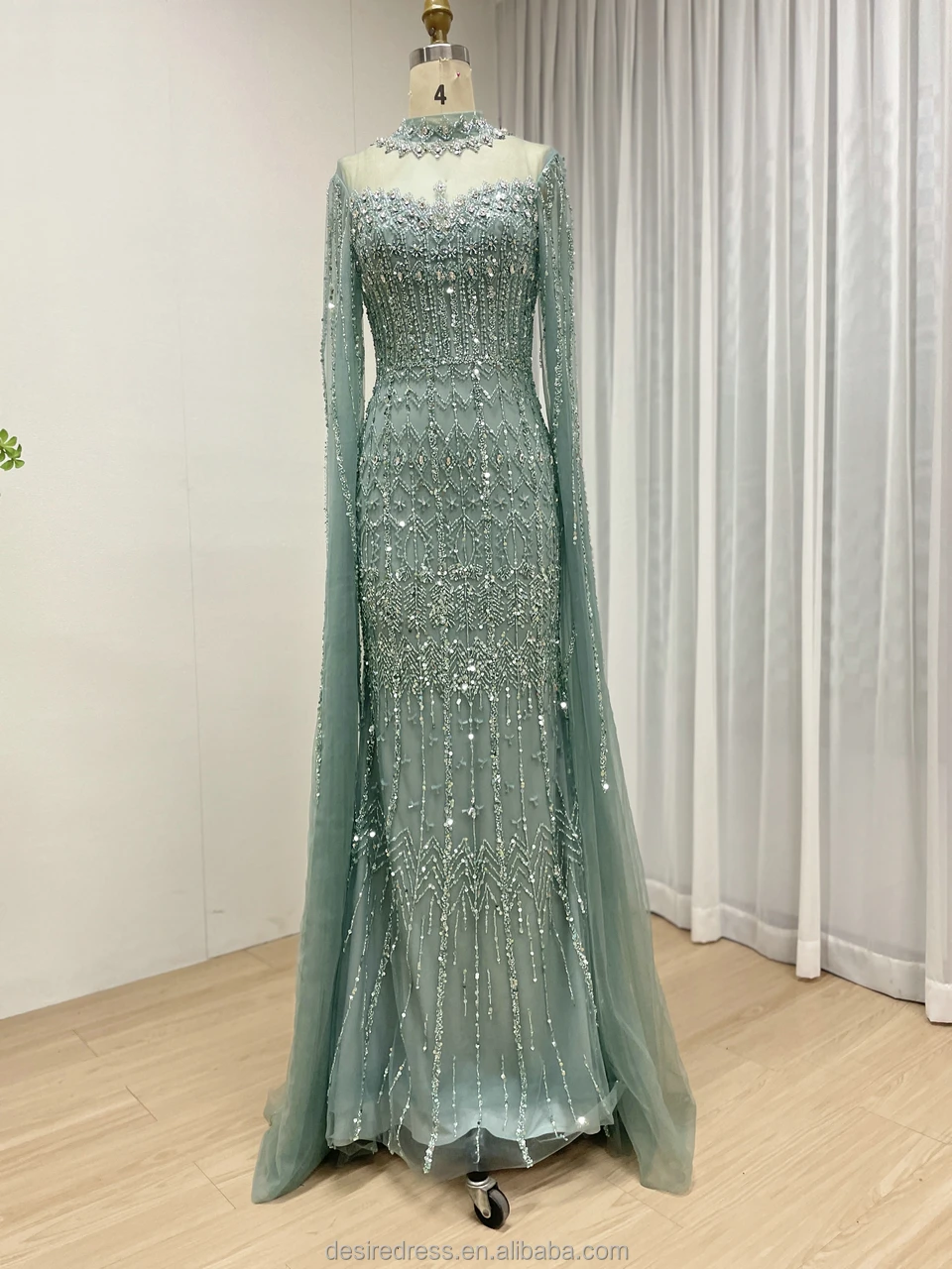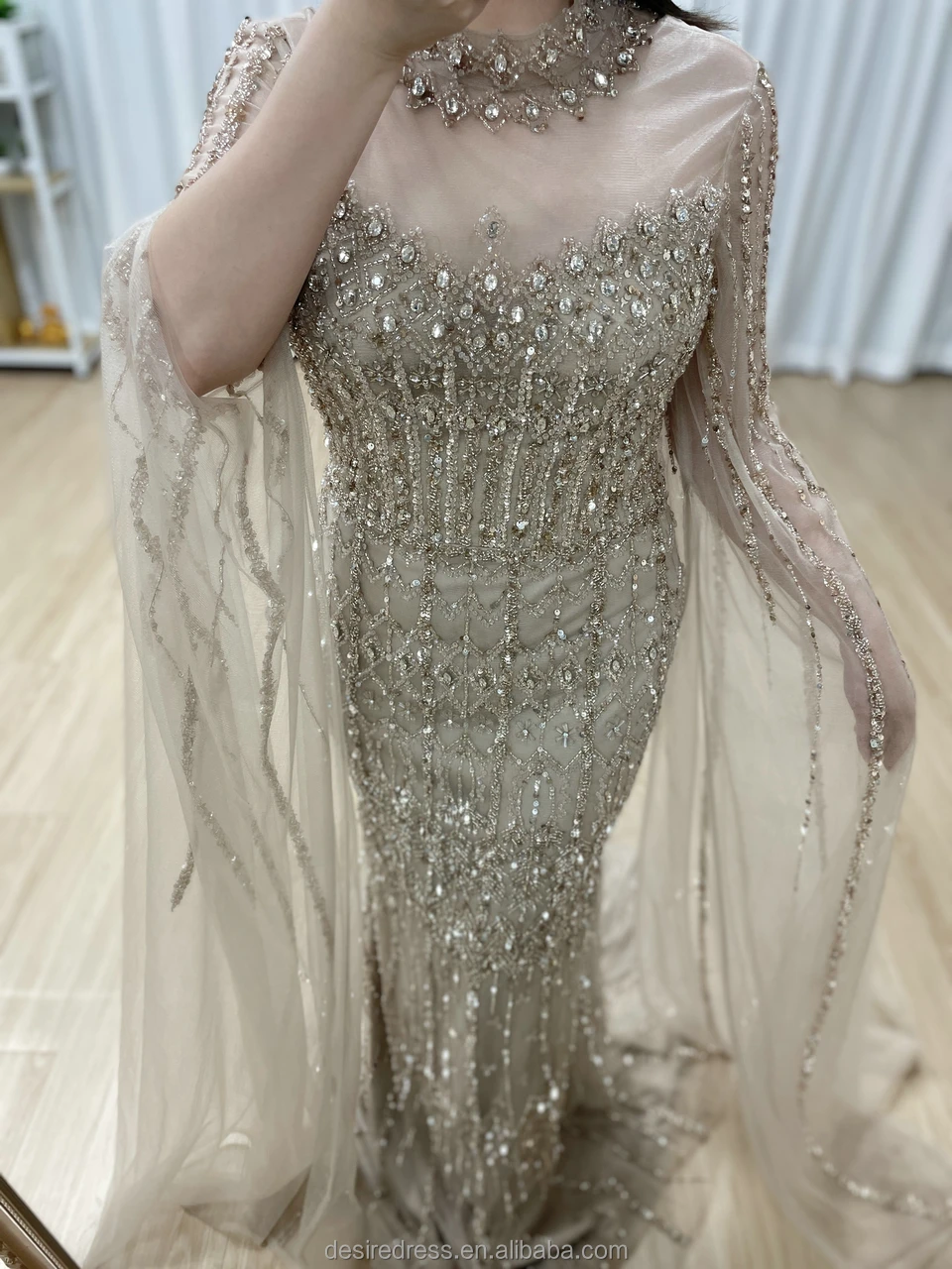 MC20120 Caramel/Blue/Green Luxury Arabic Beaded Mermaid Evening Dresses With Long Cape Sleeves High Neck Prom Party Formal Gowns