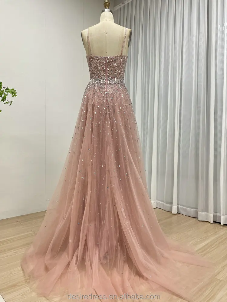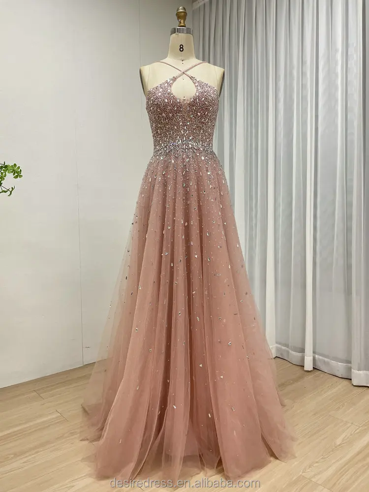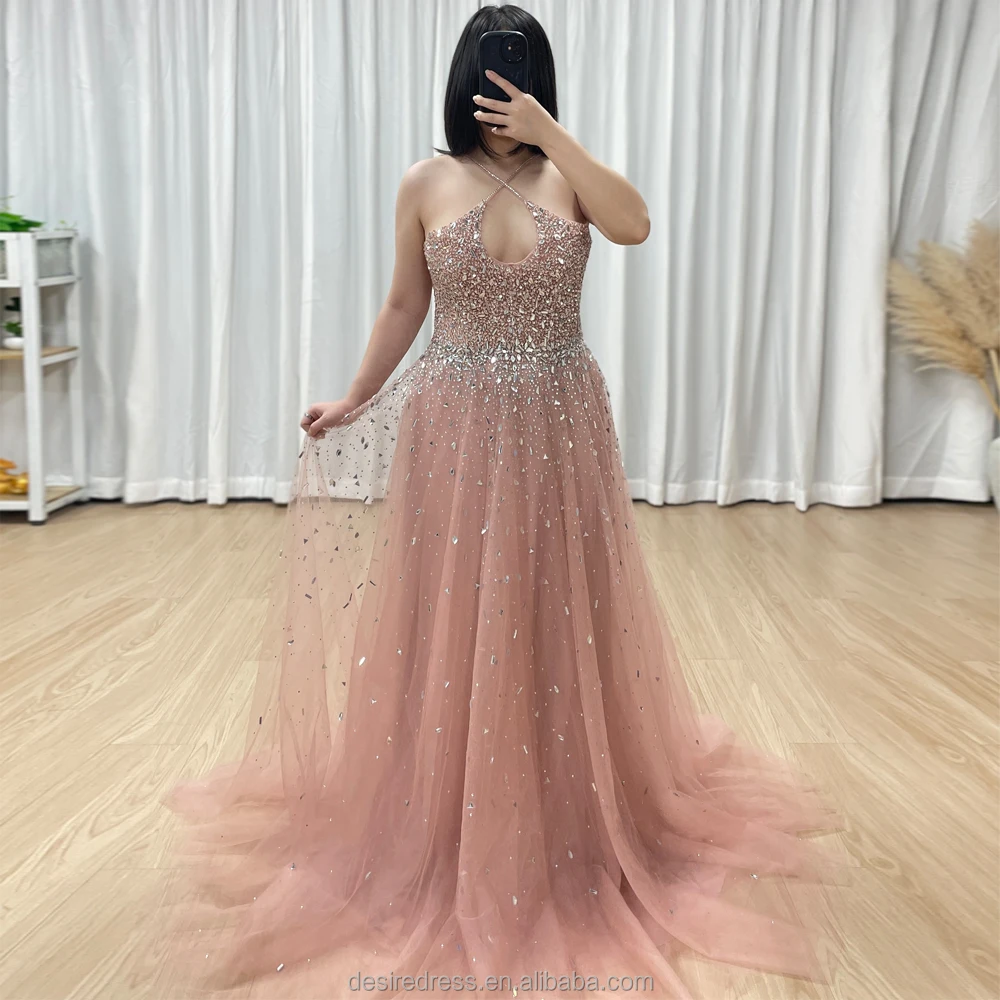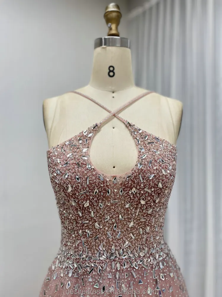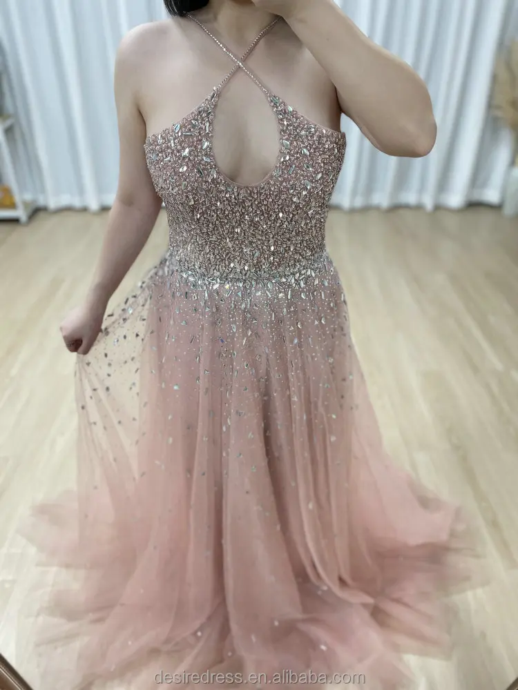 MB40317-2 Elegant Sparkly pink Evening Dress With Keyhole Bodice Crystal Embellishment Long Flowing Train for Prom Party Events