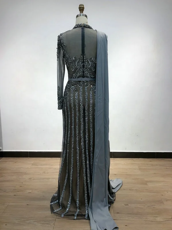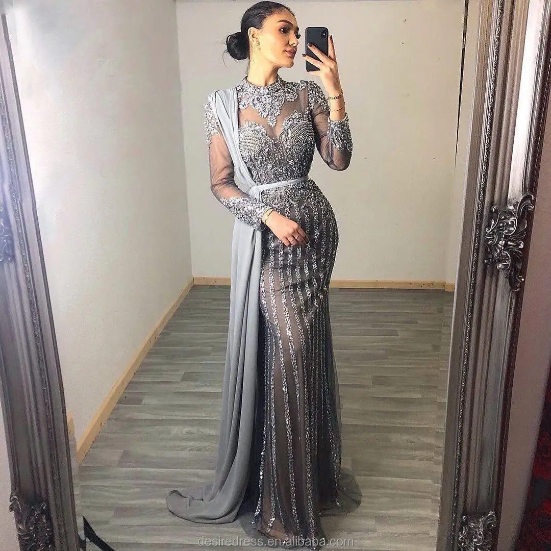 DTX036 Arrival High Neck Muslim Long Sleeves Evening Dresses Dubai Women Crystals Sequin Mermaid Prom Dresses Luxury for Wedding