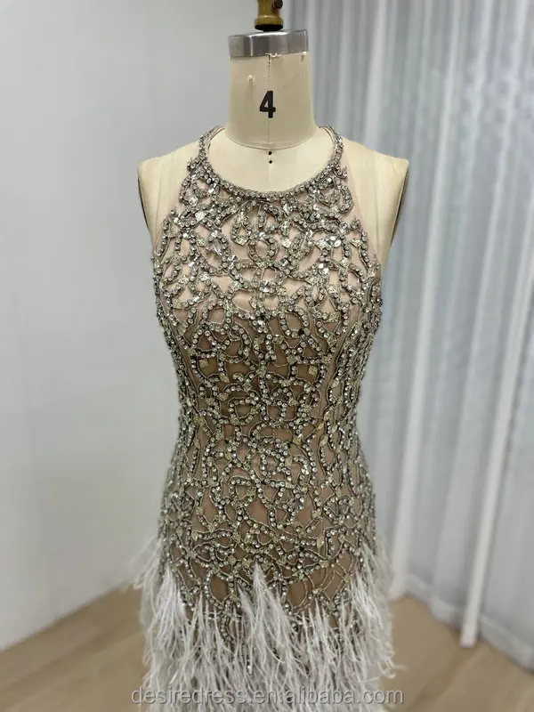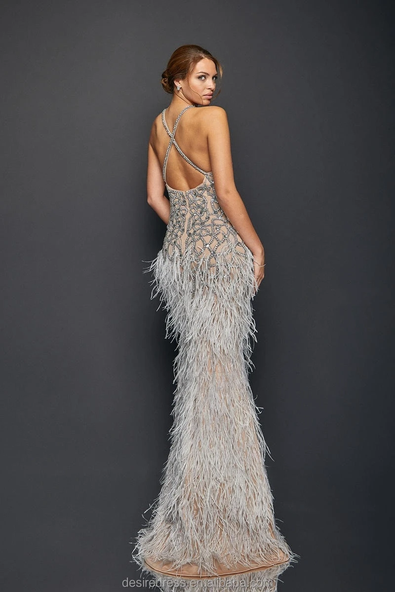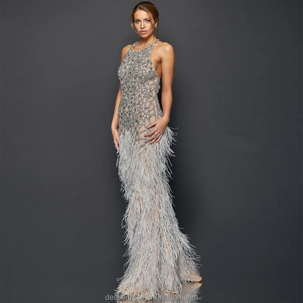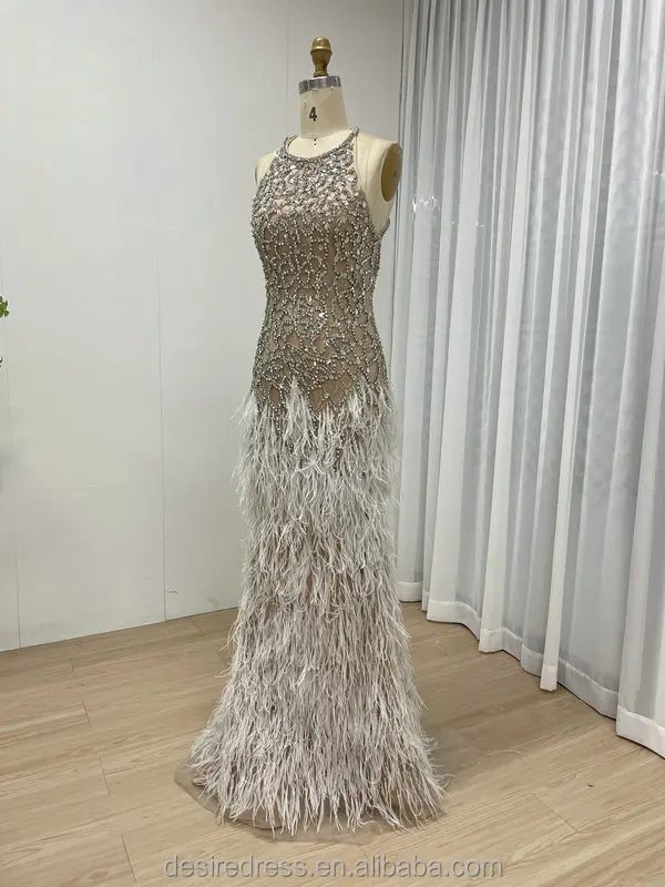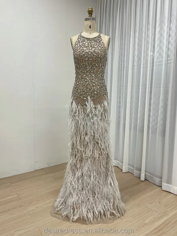 MB40416 Exquisite Luxury Bead Diamond Sexy Sleeveless Backless Feather Bottom Embellished Prom Evening Gowns for Formal Occasion