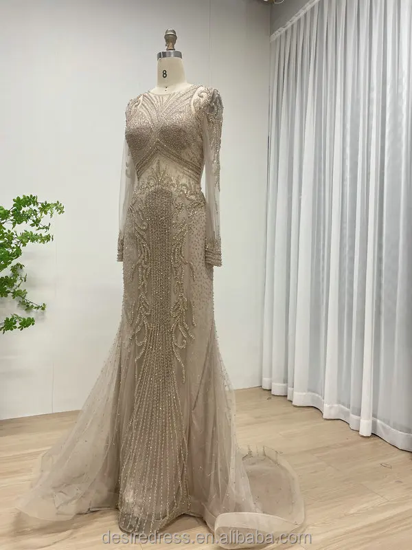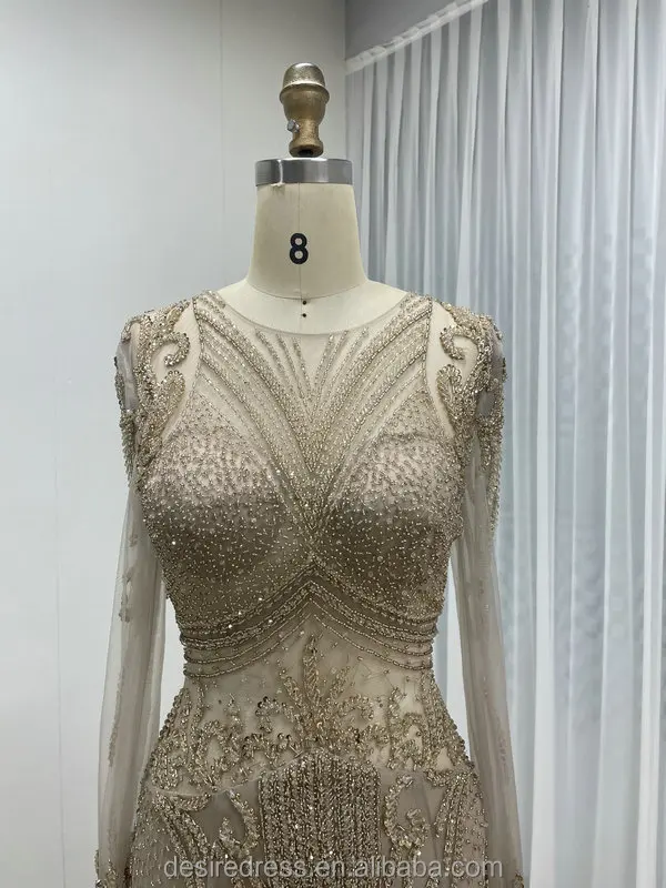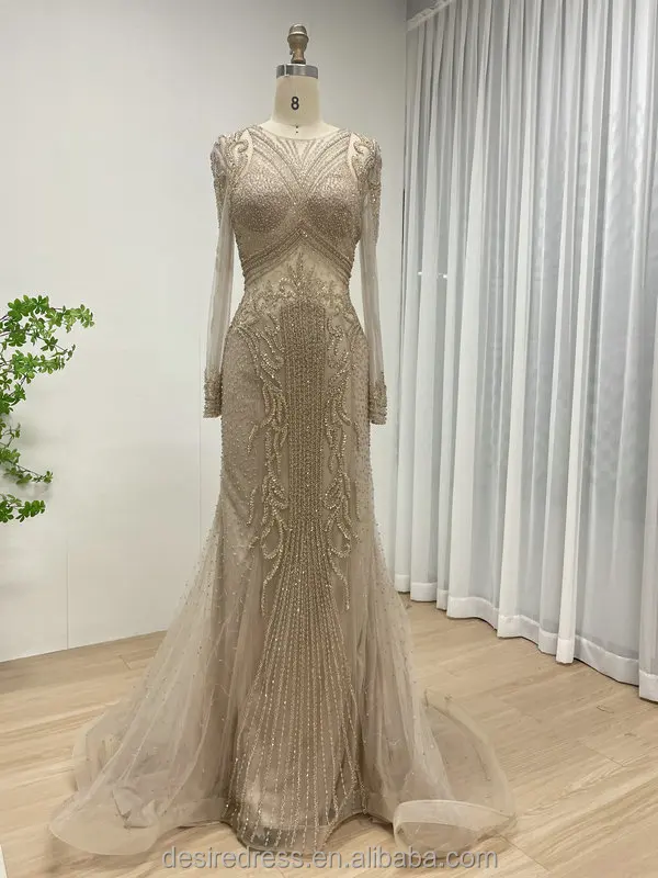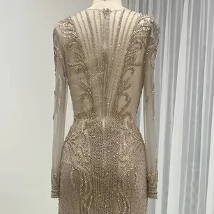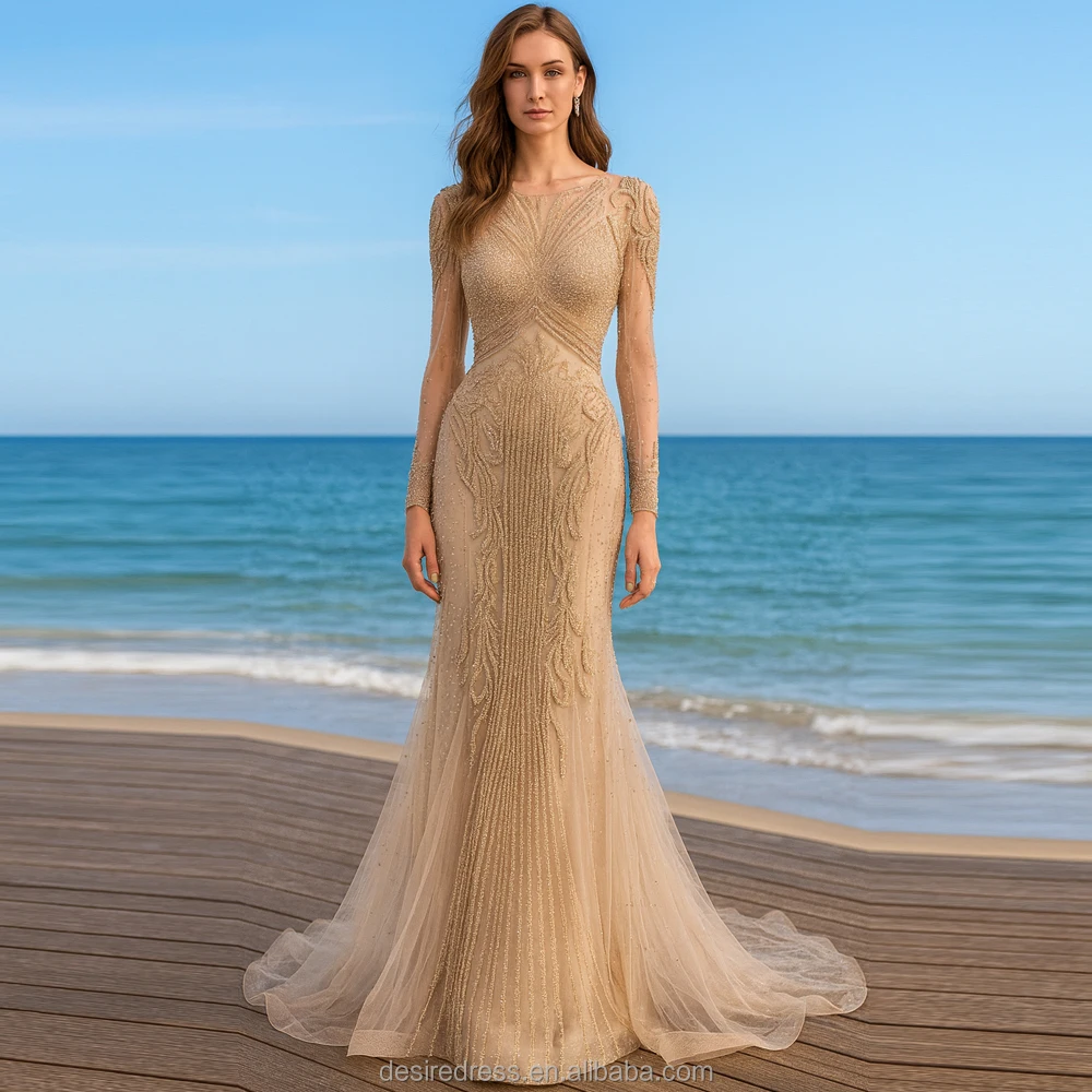 DSL62101-2 Hot Selling Exquisite Caramel Elegant Luxury Sexy See Through Beaded Embroidery Long Sleeves Vintage Evening Dresses