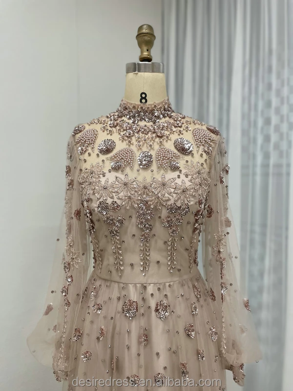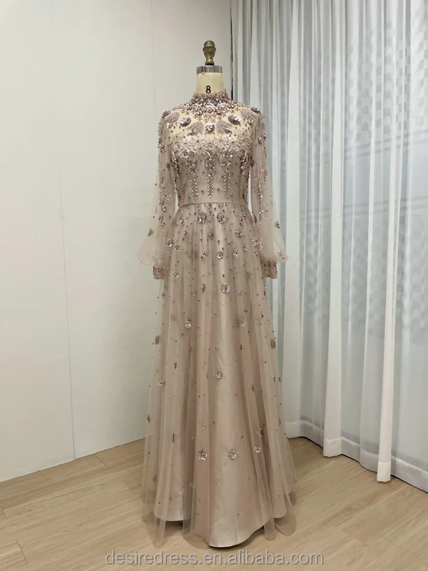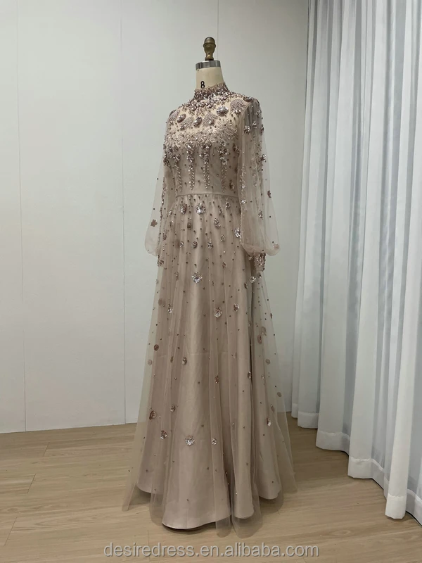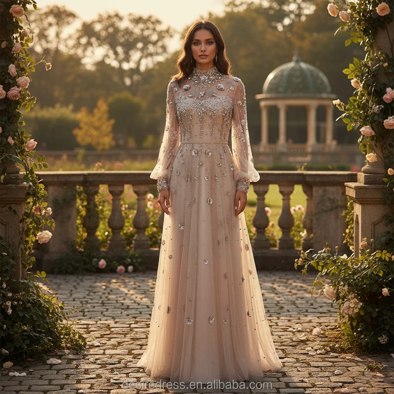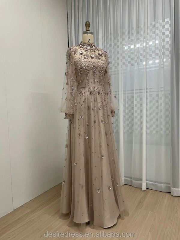 MY30117 Muslim High Neck A-Line Long Sleeves Luxury Beaded Evening Gowns Elegant Party Dress for Women Mother of the Bride Dress