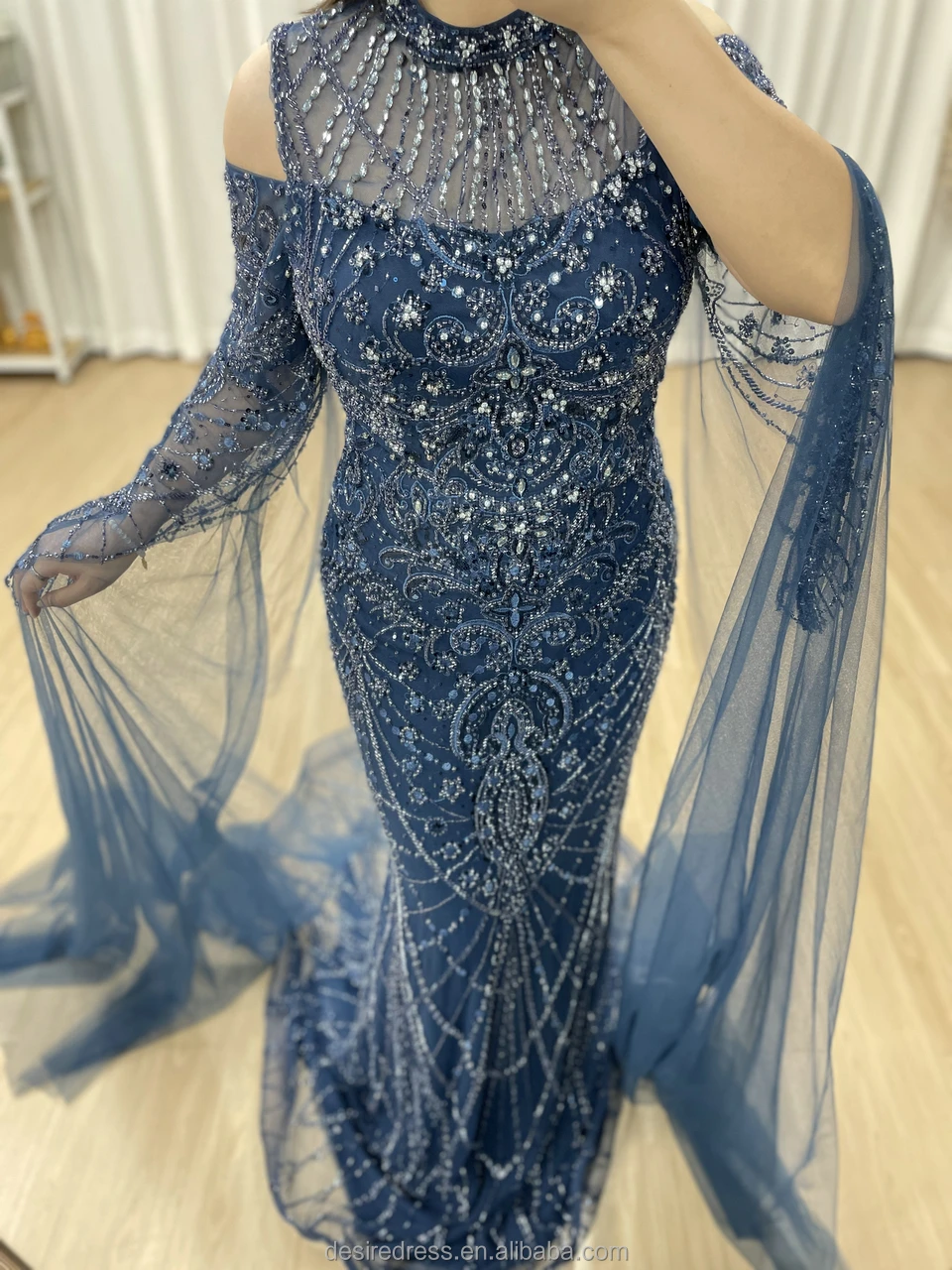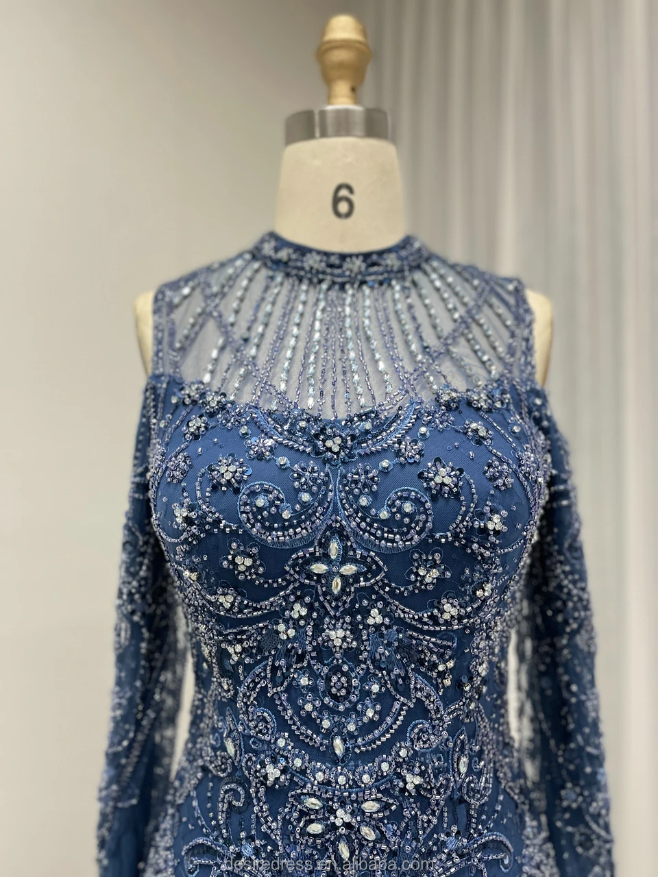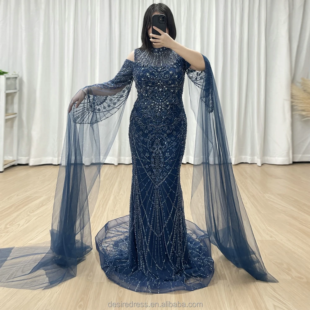 MY30195 Formal Blue Long Sleeve High Neck Mermaid Wedding Party Dresses Elegant Beaded Evening Dresses Mother of the Bride