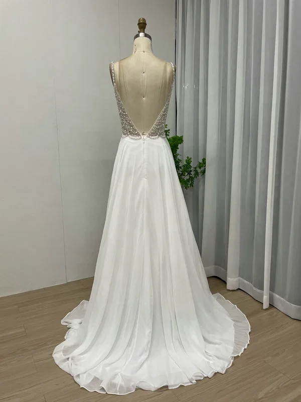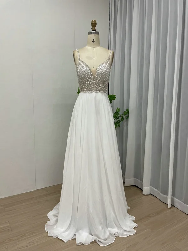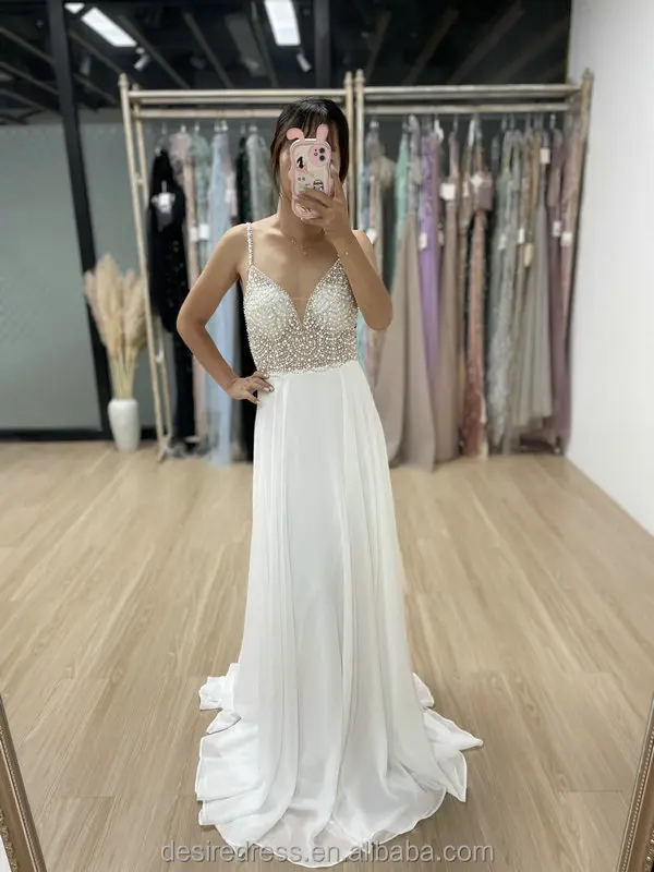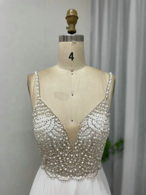 MB40050 White Beaded Sequin V Neck Spaghetti Straps Backless Bridal Wedding Dress Elegant Vestido De Novia Plus Size Prom Gown