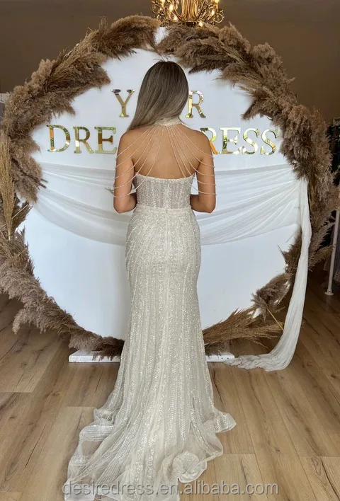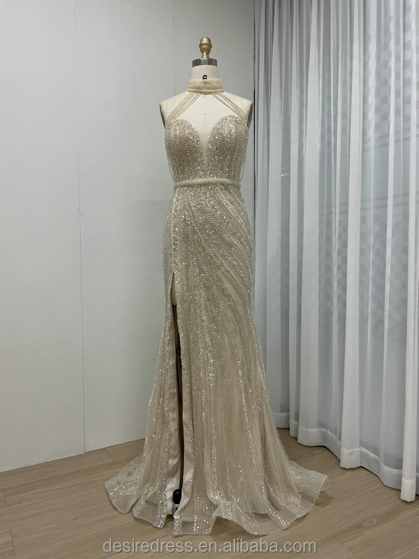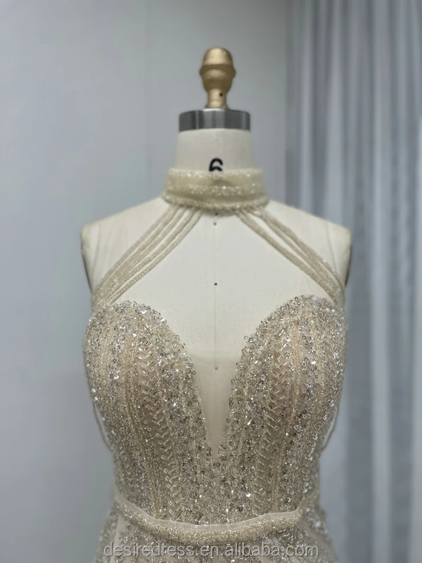 MB40281 Formal Champagne Halter Neck Sleeveless Casual Mermaid Pearls Beaded Luxury Long Evening Dresses Party Gowns for Women