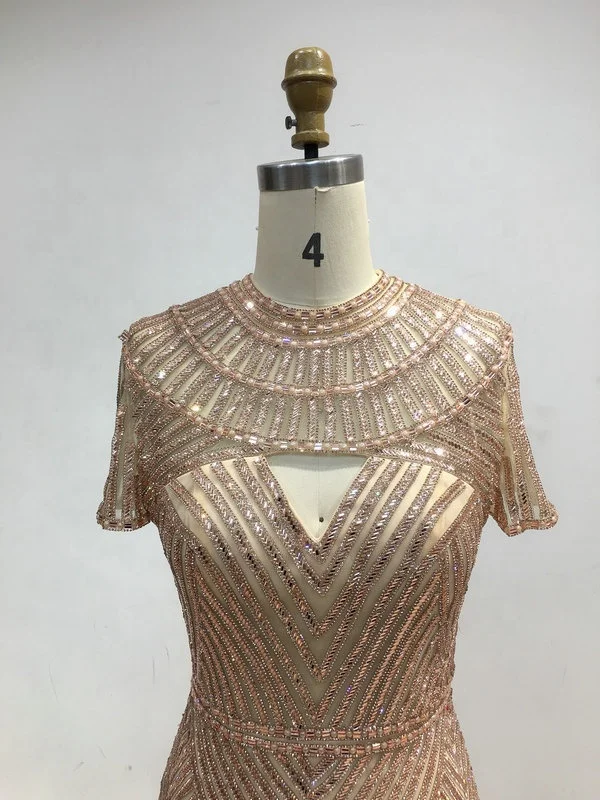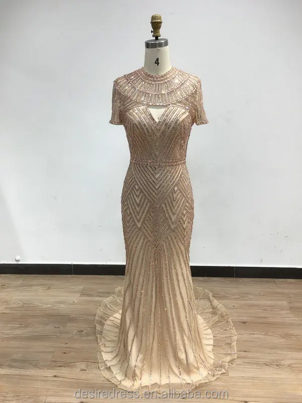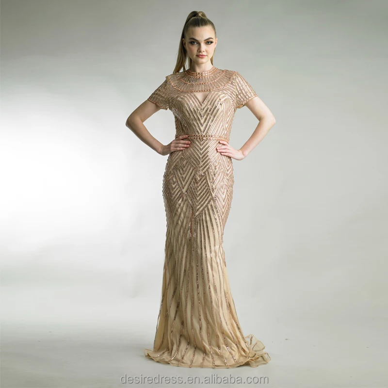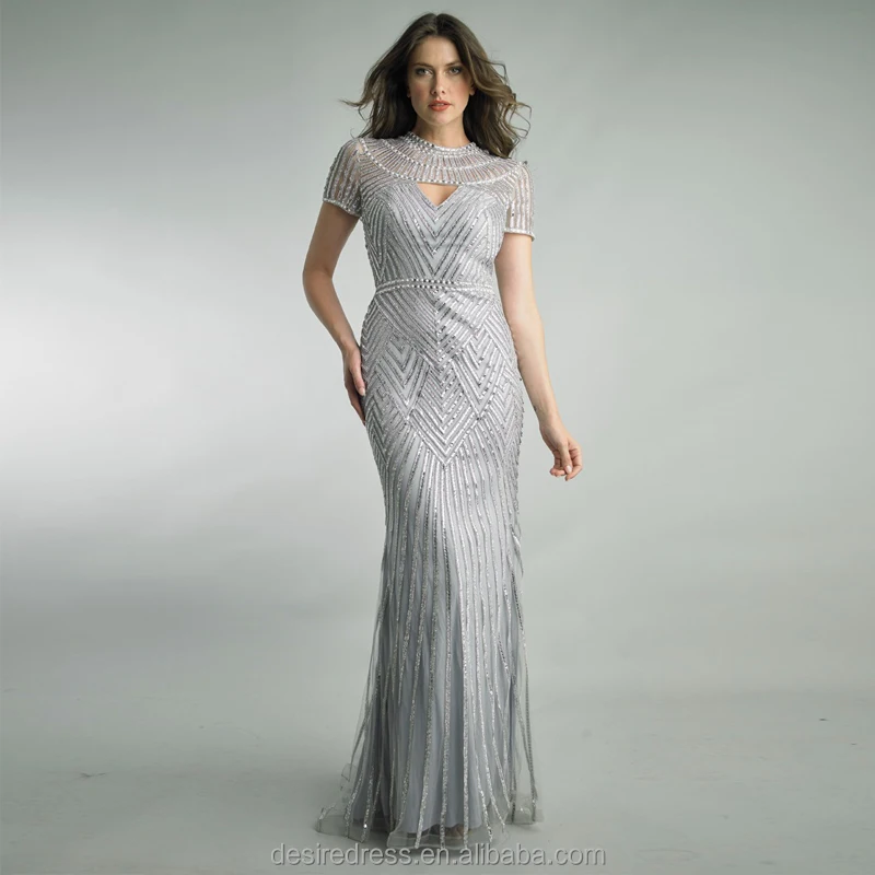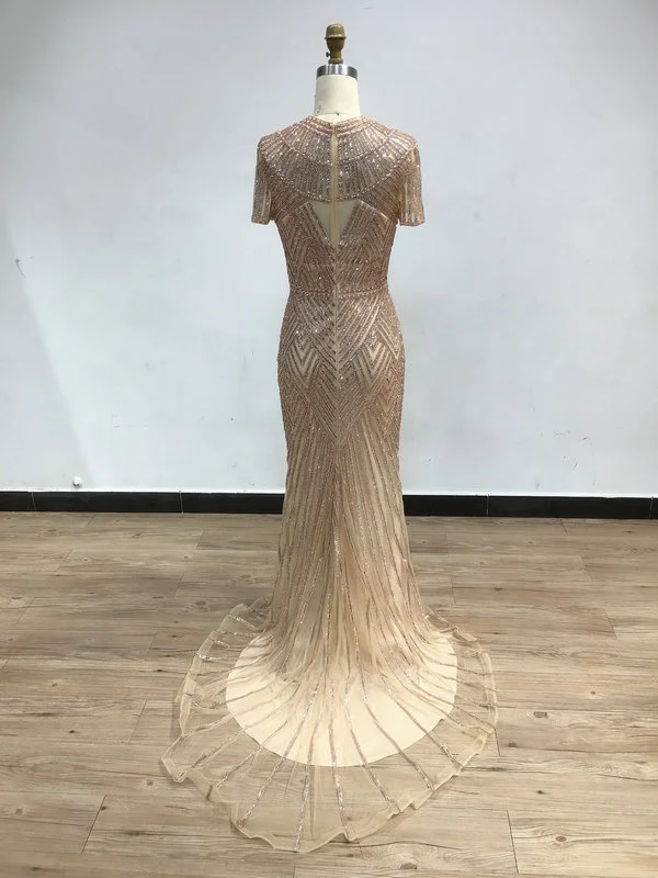 DSW008 Luxury Silver Gold Mermaid Evening Dress for Women Wedding Dress for Bride Elegant Cap Sleeves Beaded Formal Party Gowns
