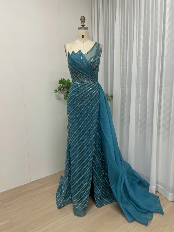 ZYHT 73903 Gemstone Crystal 3D Flower Decoration Ruched One Shoulder High Slit Long Sleeve Maxi Simple Elegant Evening Dress