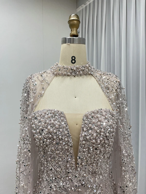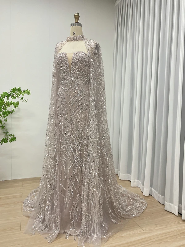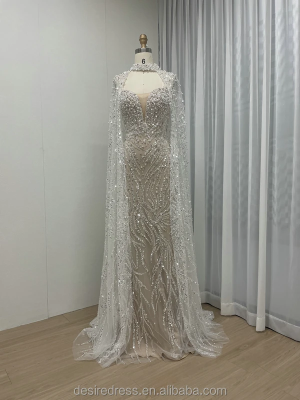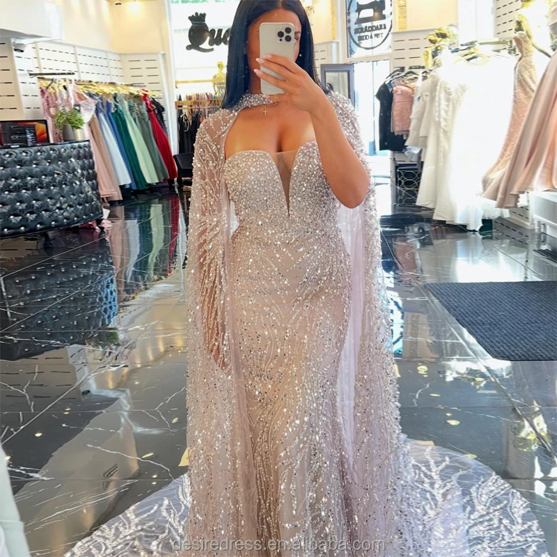 MY30130 Stunning Luxury Sexy V Neck Tulle Strapless Beaded Bodice Mermaid Sheath Prom Dress With Cape and Halter Evening Dress