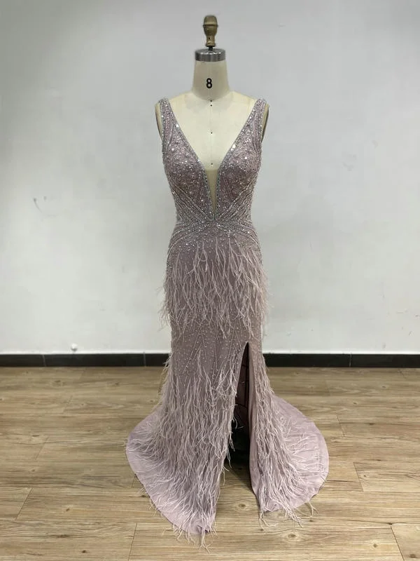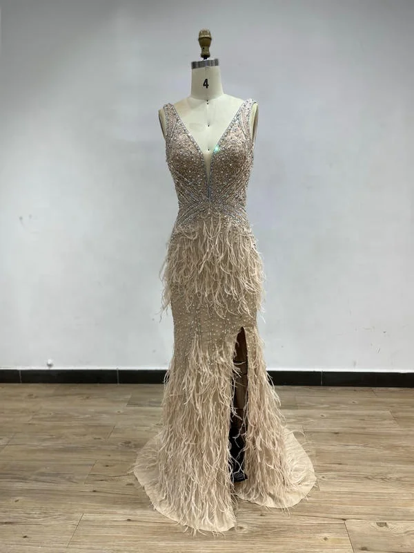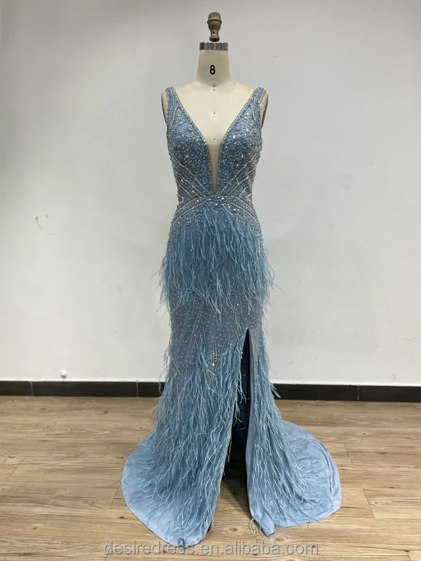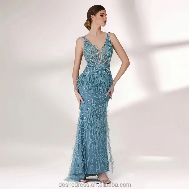 DDS041 Elegant Blue Wedding Dresses for Bride Feather Beaded Spaghetti Strap Sexy Slim Evening Dress for Women Party Club Night