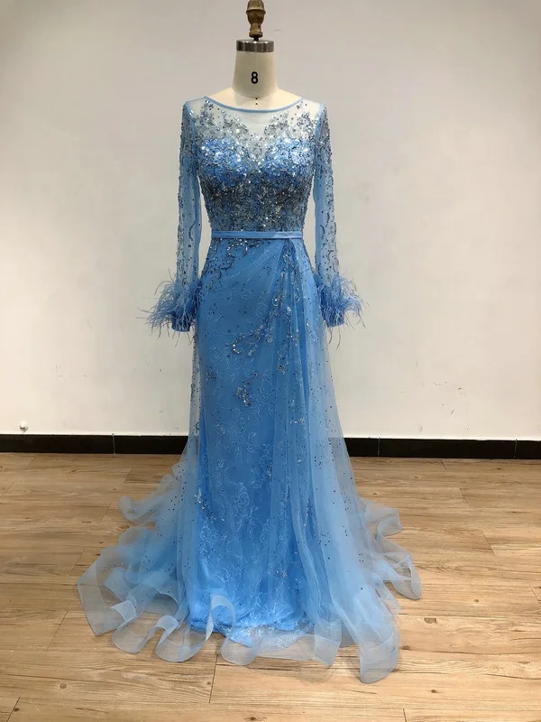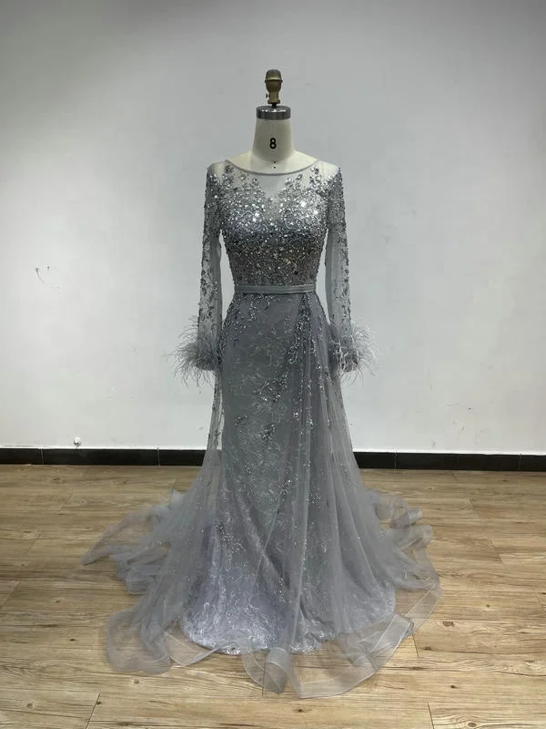 DKD013 Wine Red Wedding Guest Dress Luxury Dubai Feathers Beaded Evening Dresses O Neck Long Sleeves Long Party Gowns for Women