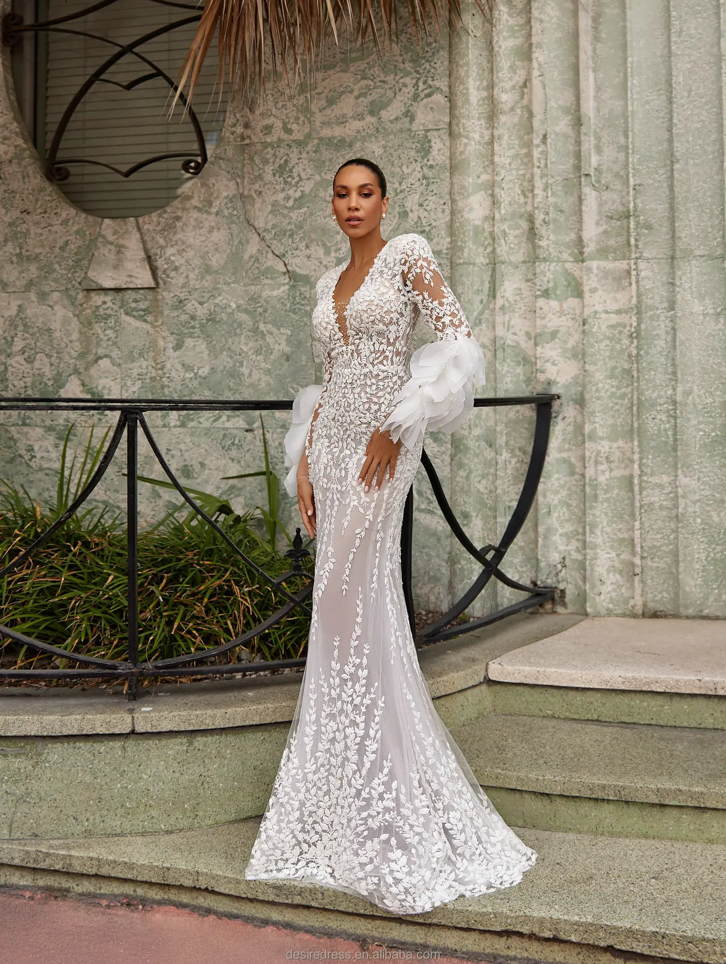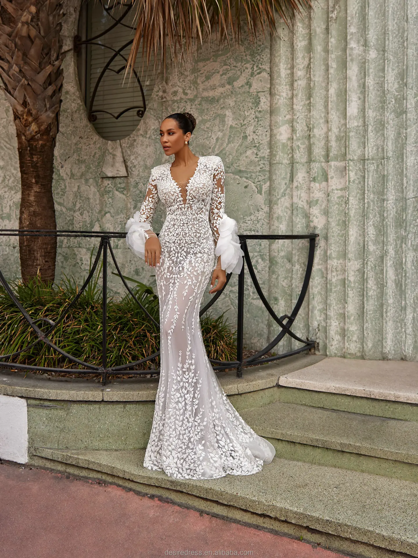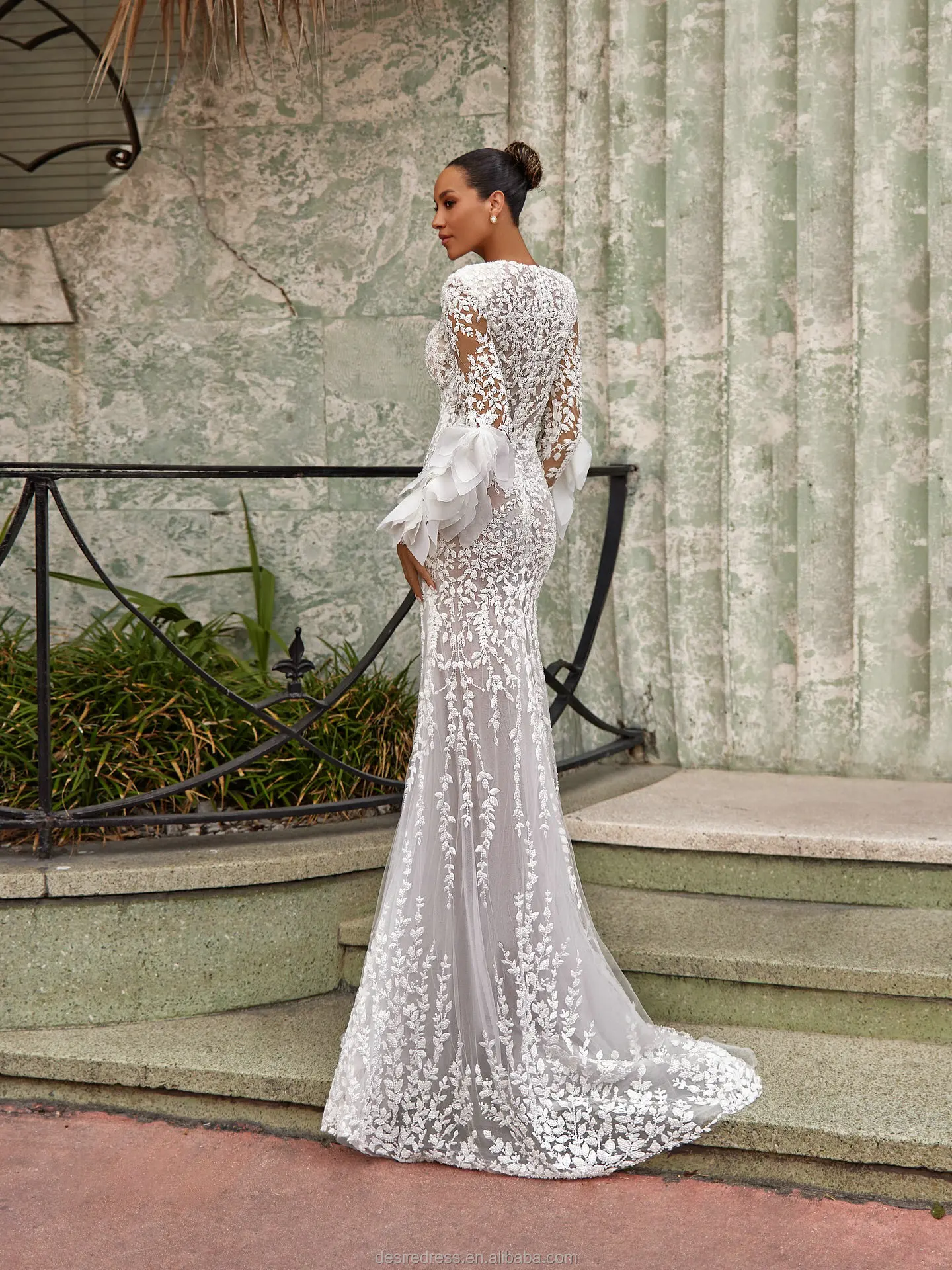 MD50080 Luxury White Lace Mermaid Evening Dresses Long Sleeves Sheer Floral Embroidered Formal Party Gowns With Puff Cuff Design