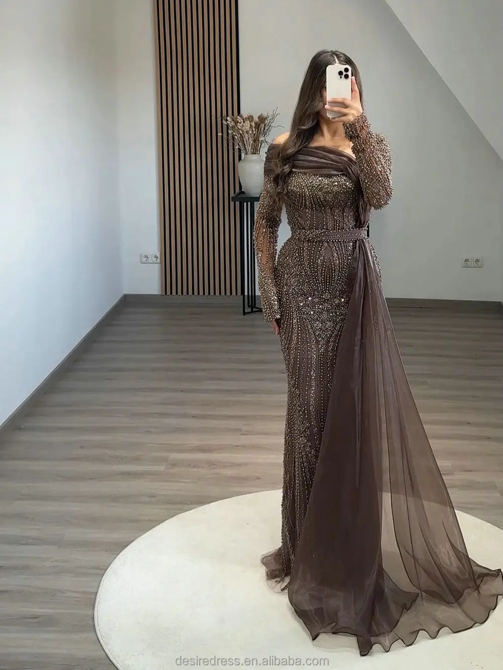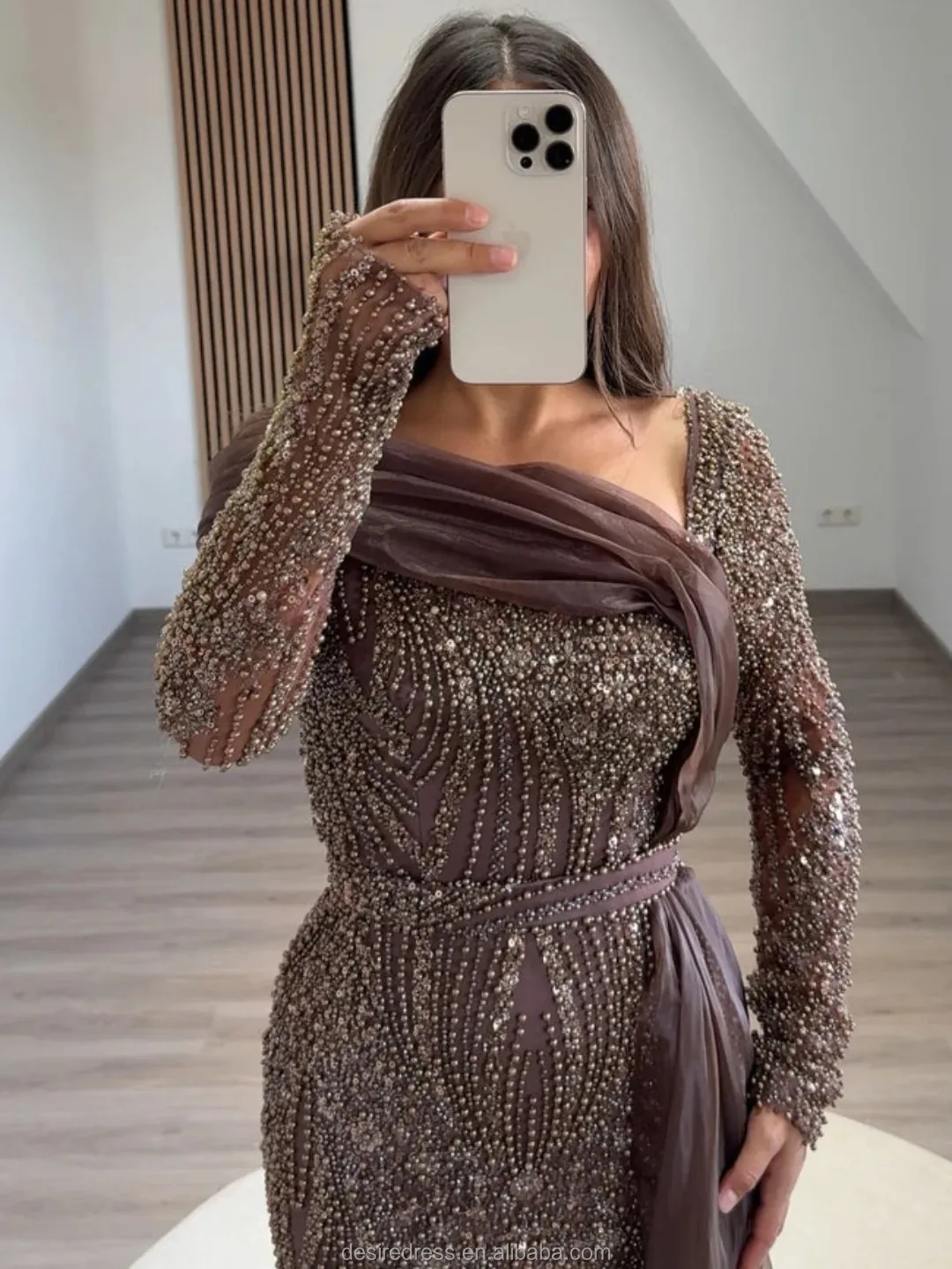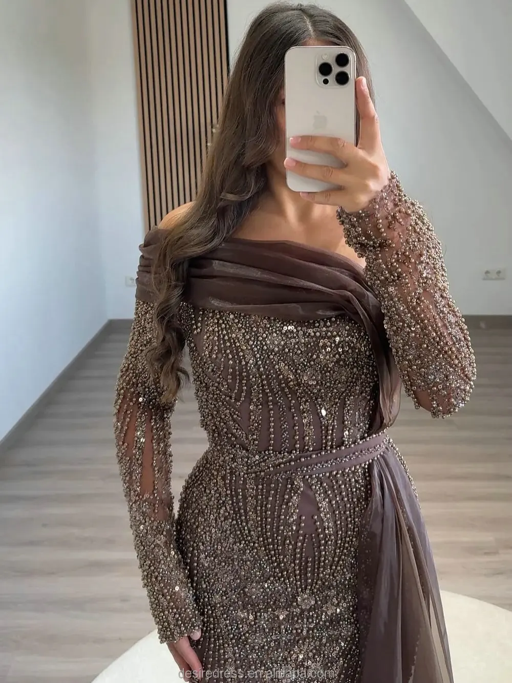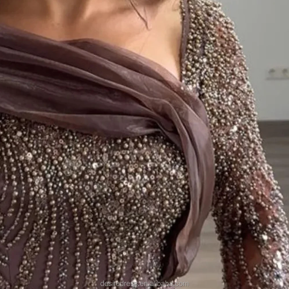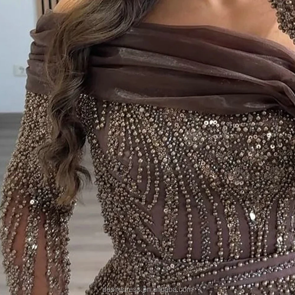 MD50076 Modest Trendy Brown Long Sleeve Evening Dress Gown With Sophisticated Beaded and Elegant Side Skirt for Formal Occasion