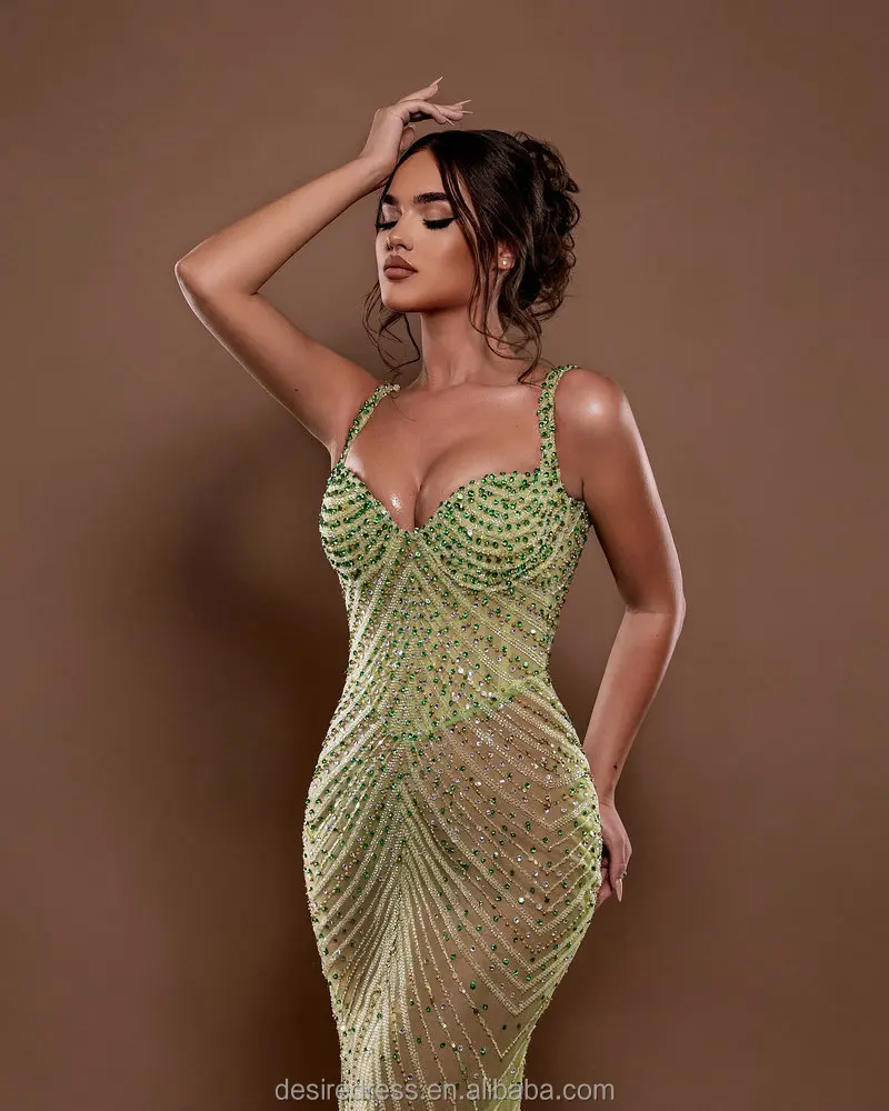 MD50059 Sexy Sheer Sequined Prom Dress Spaghetti Strap Mermaid Lime Green Beading Feathers Perfect for Engagement Birthday Party