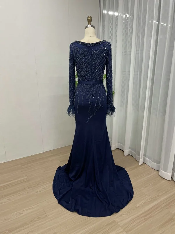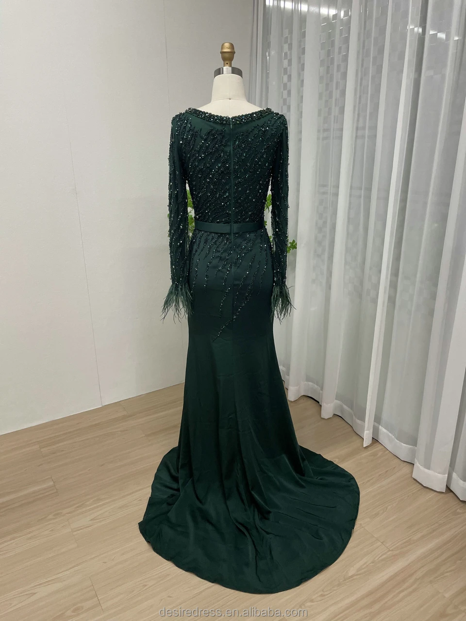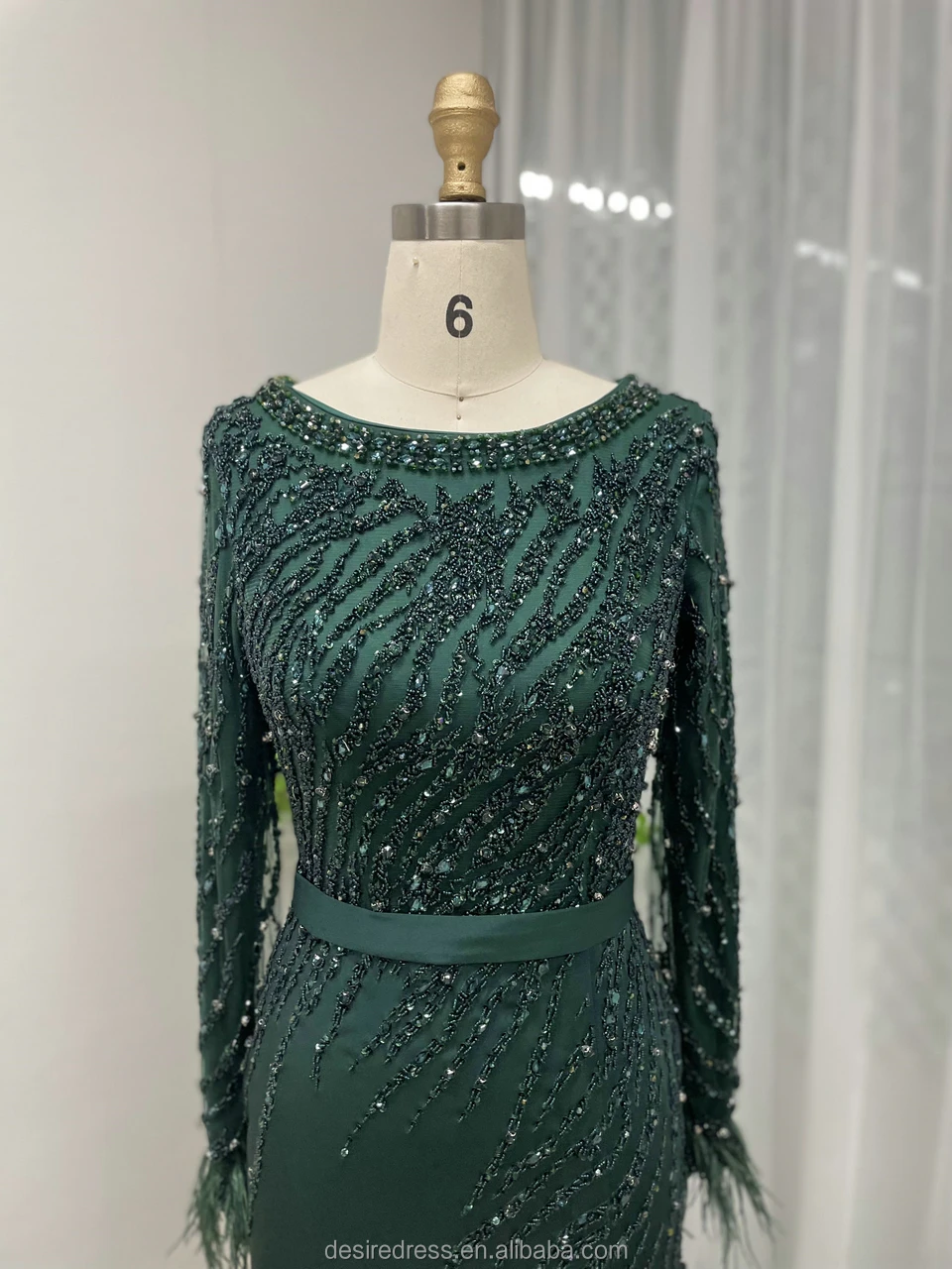 DXM008B Elegant Boat Neck Formal Gowns Muslim Evening for Women Mother Bride Pearls Feather Long Sleeves Floor-Length Sweep