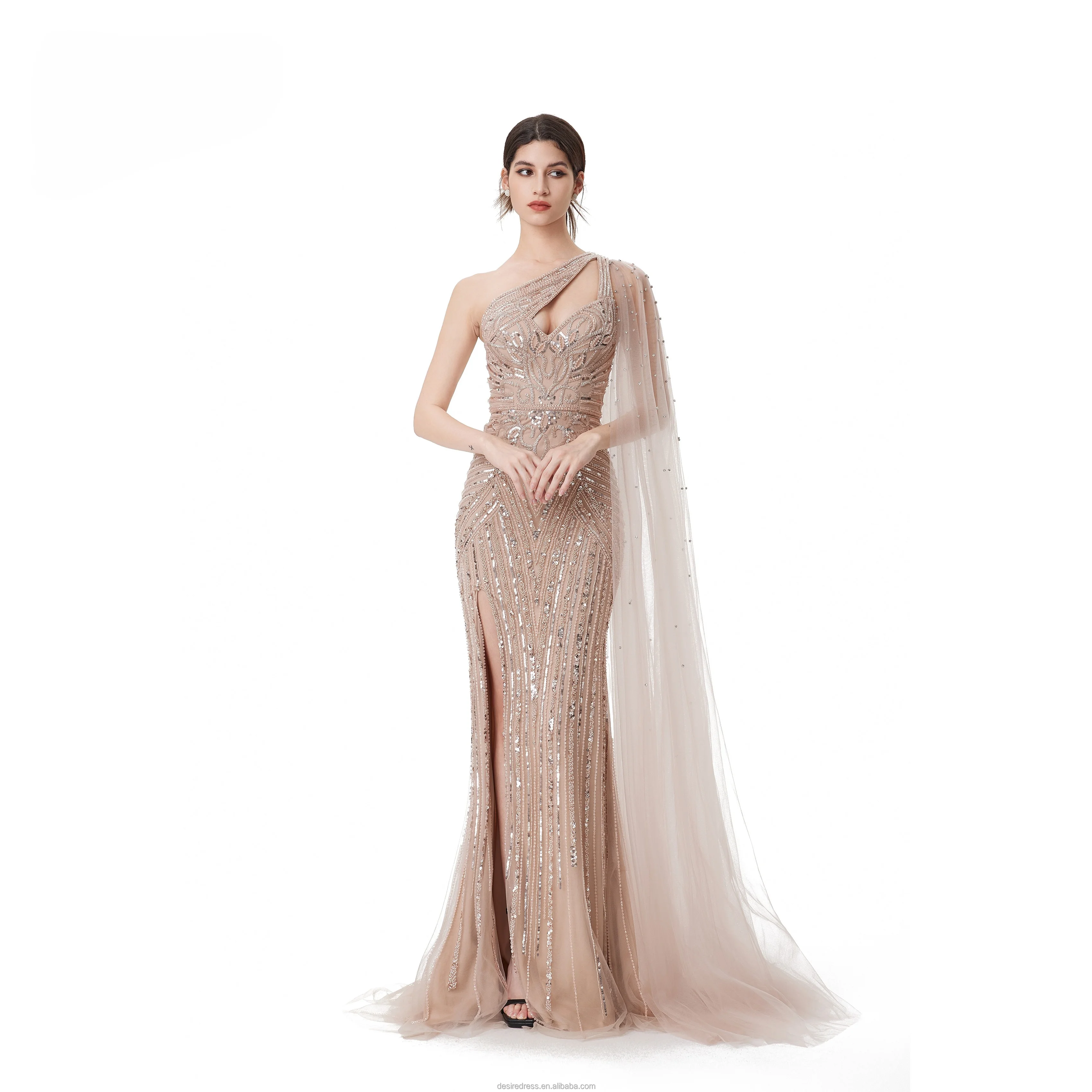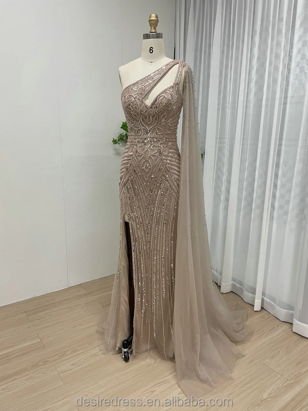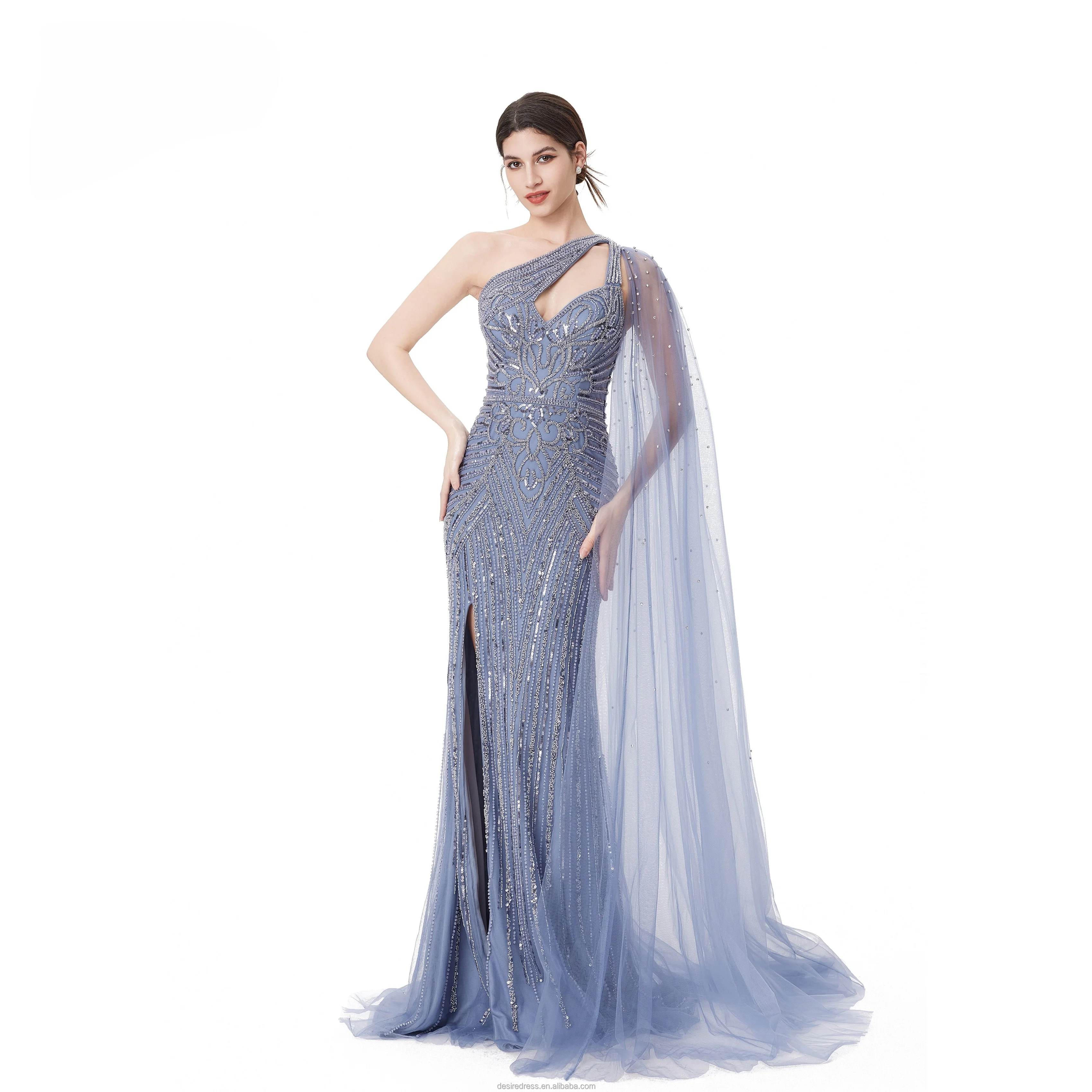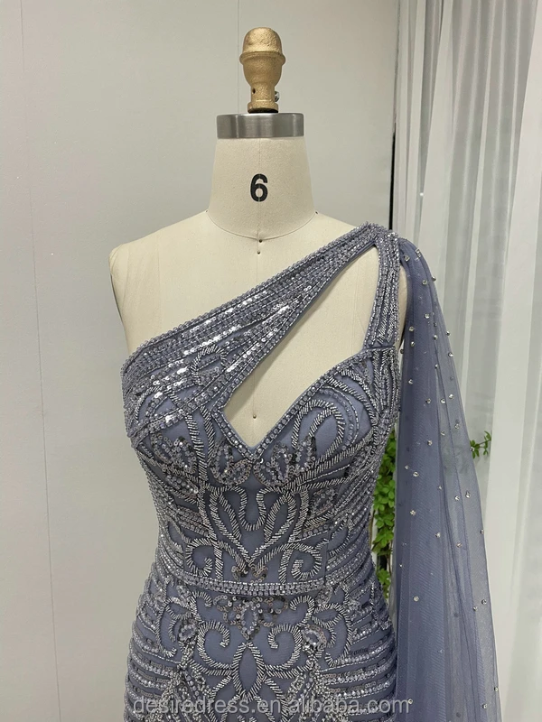 MB40152 Exclusive Blue One Shoulder Cape Sleeve Beading Sequin Luxury Couture Dress With High Slit Mermaid Evening Dresses