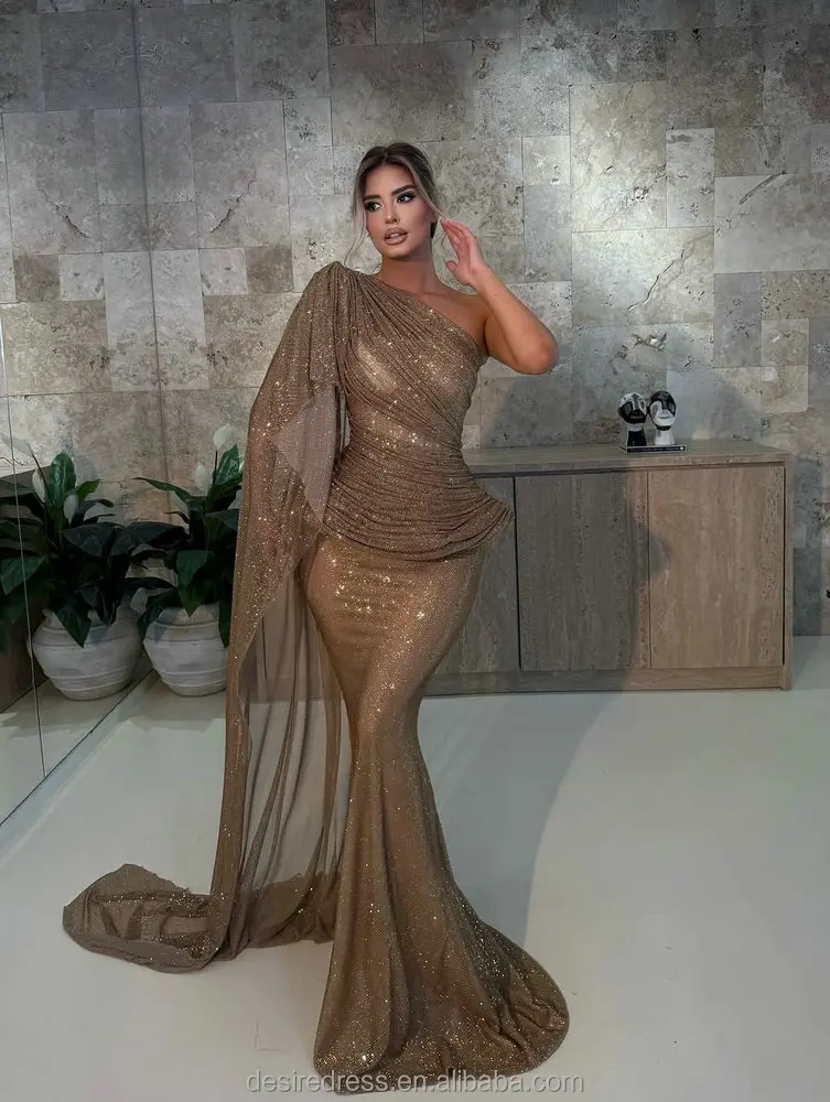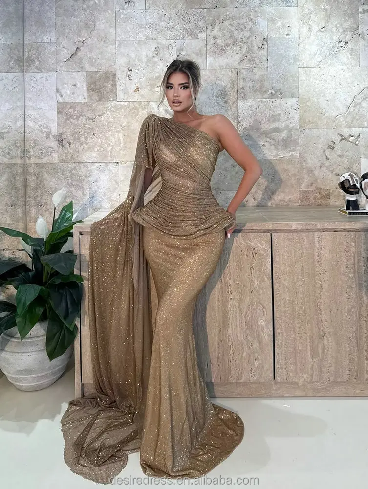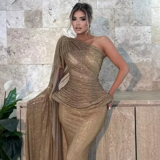 MD50025 Glamorous Stunning Gold One Shoulder Evening Dress Shiny Sequins Mermaid Long Formal Gown With Draped and Classy Sleeve