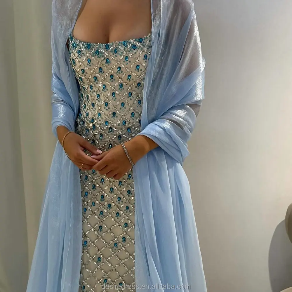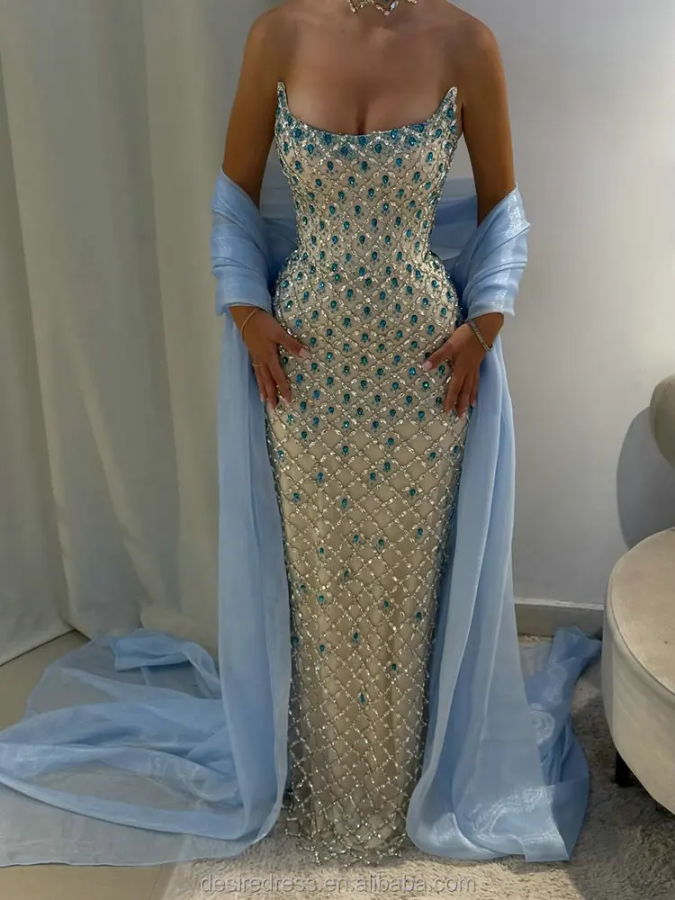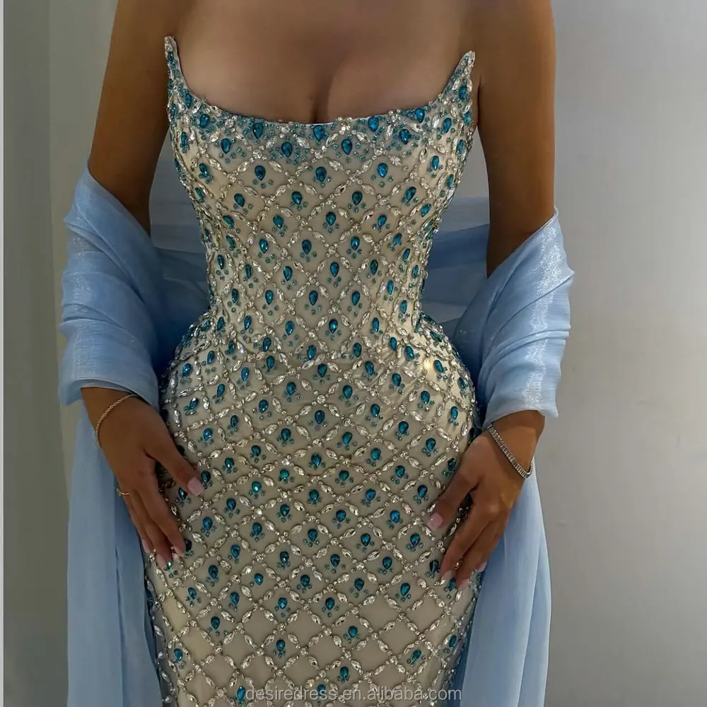 MD50022 Sparkly Dazzling Blue Crystal Beaded Strapless Evening Dresses With Fitted Mermaid Silhouette Elegant Prom Pageant Gowns