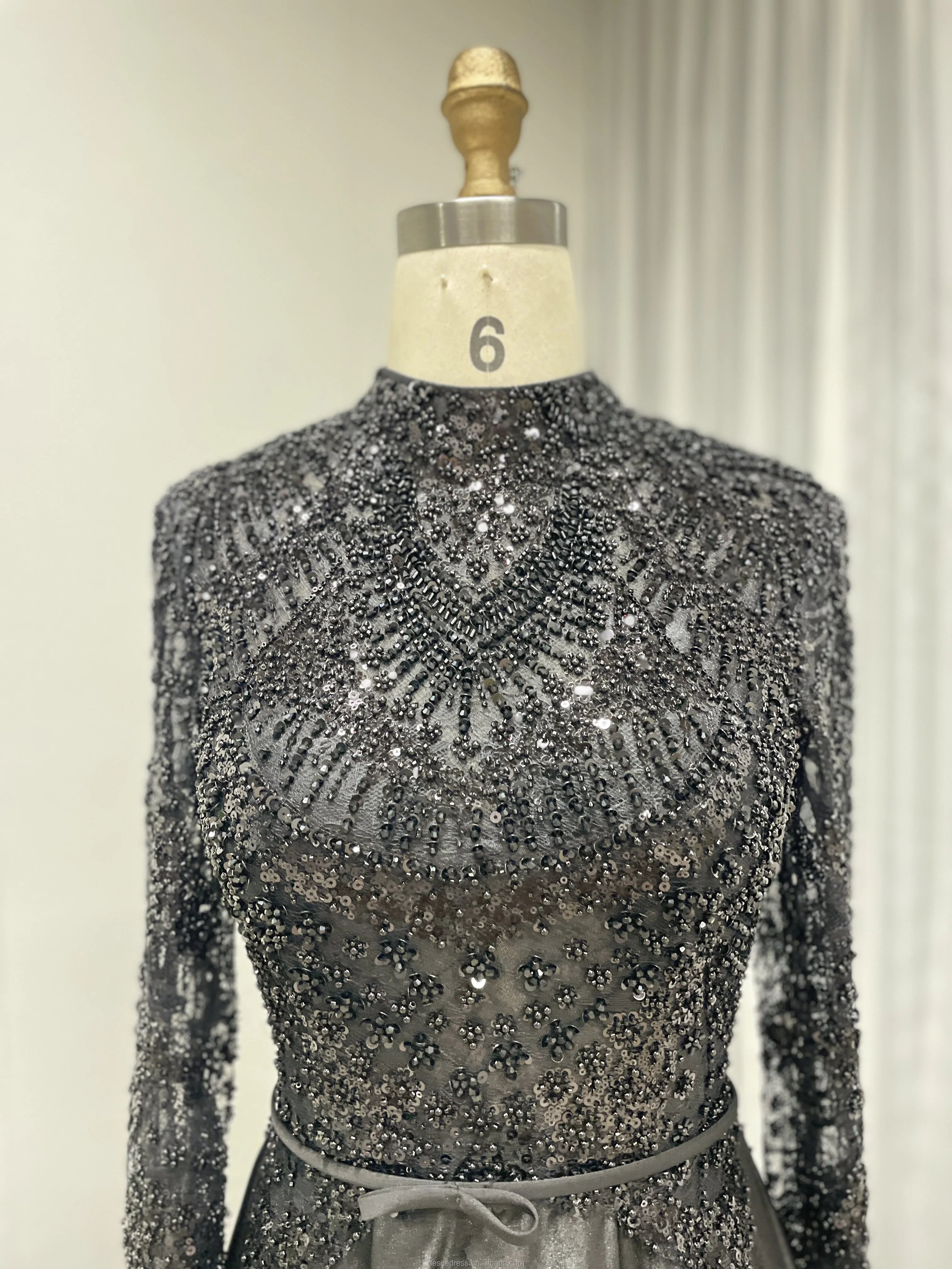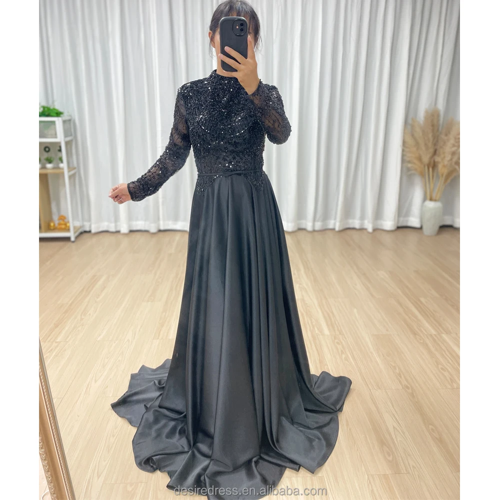 MB40439 Elegant Black Sequin Long Sleeve Evening Dresses With Exquisite Bead Modest High Neck Gown for Prom Gala Mother of Bride