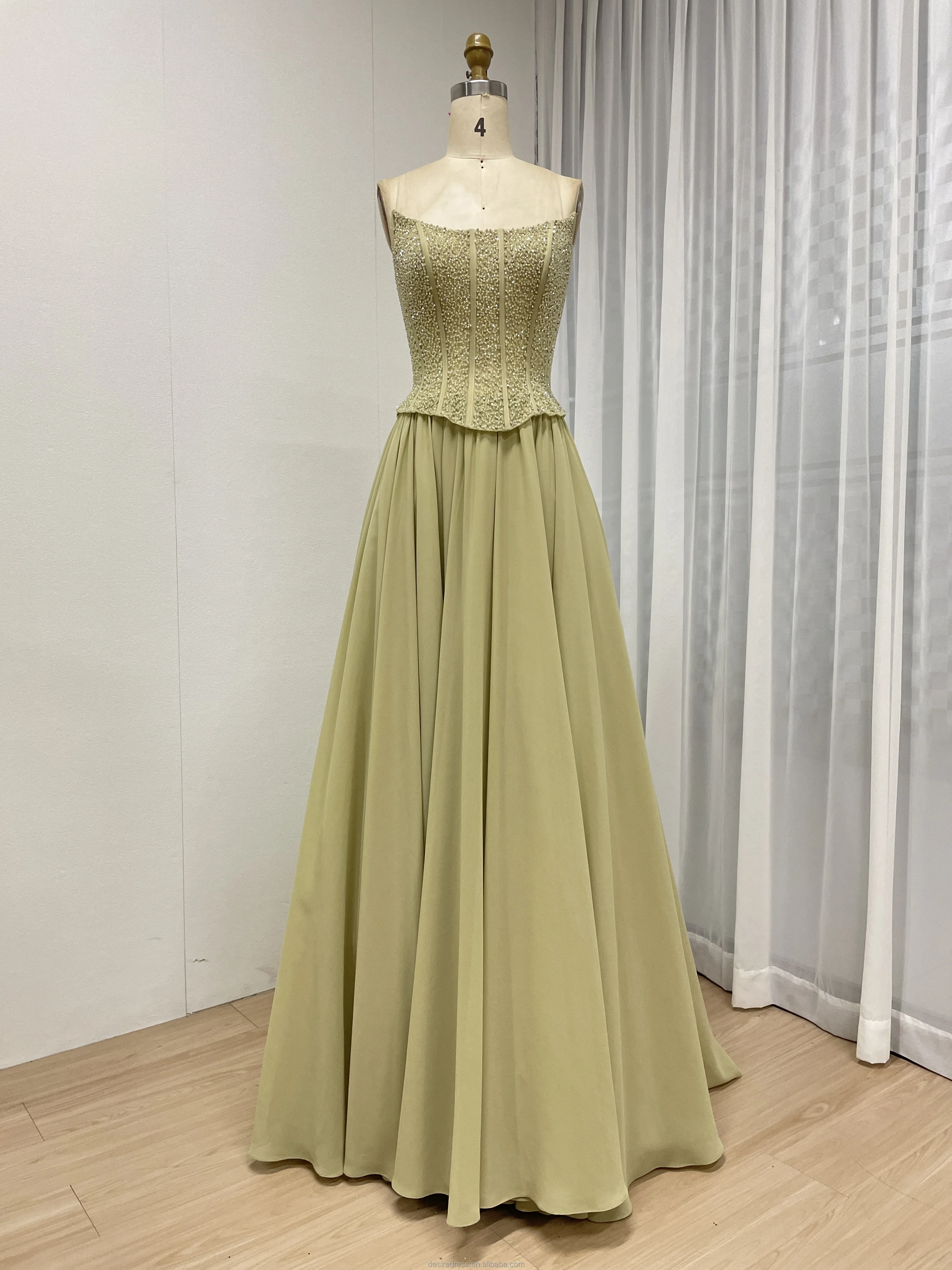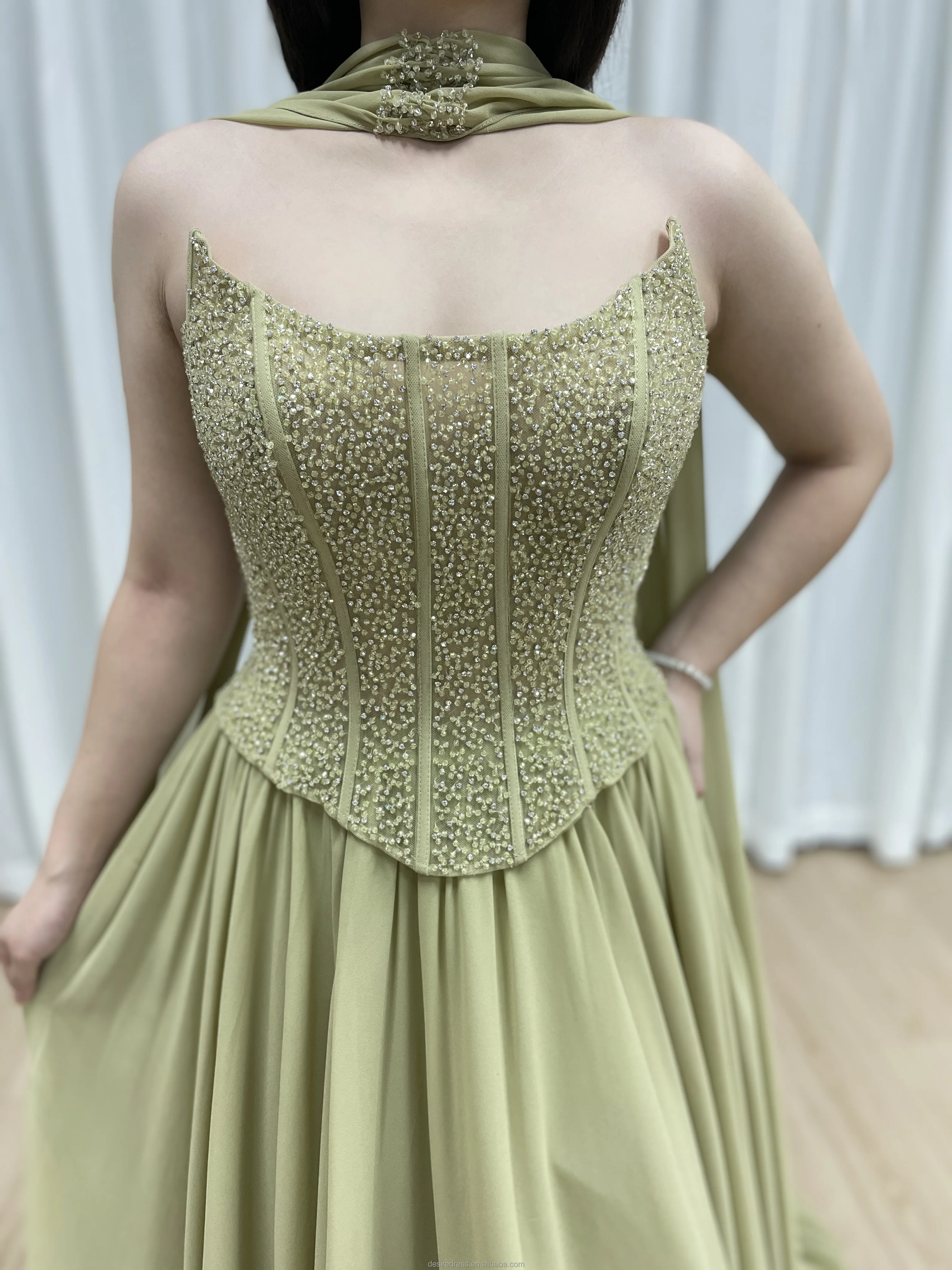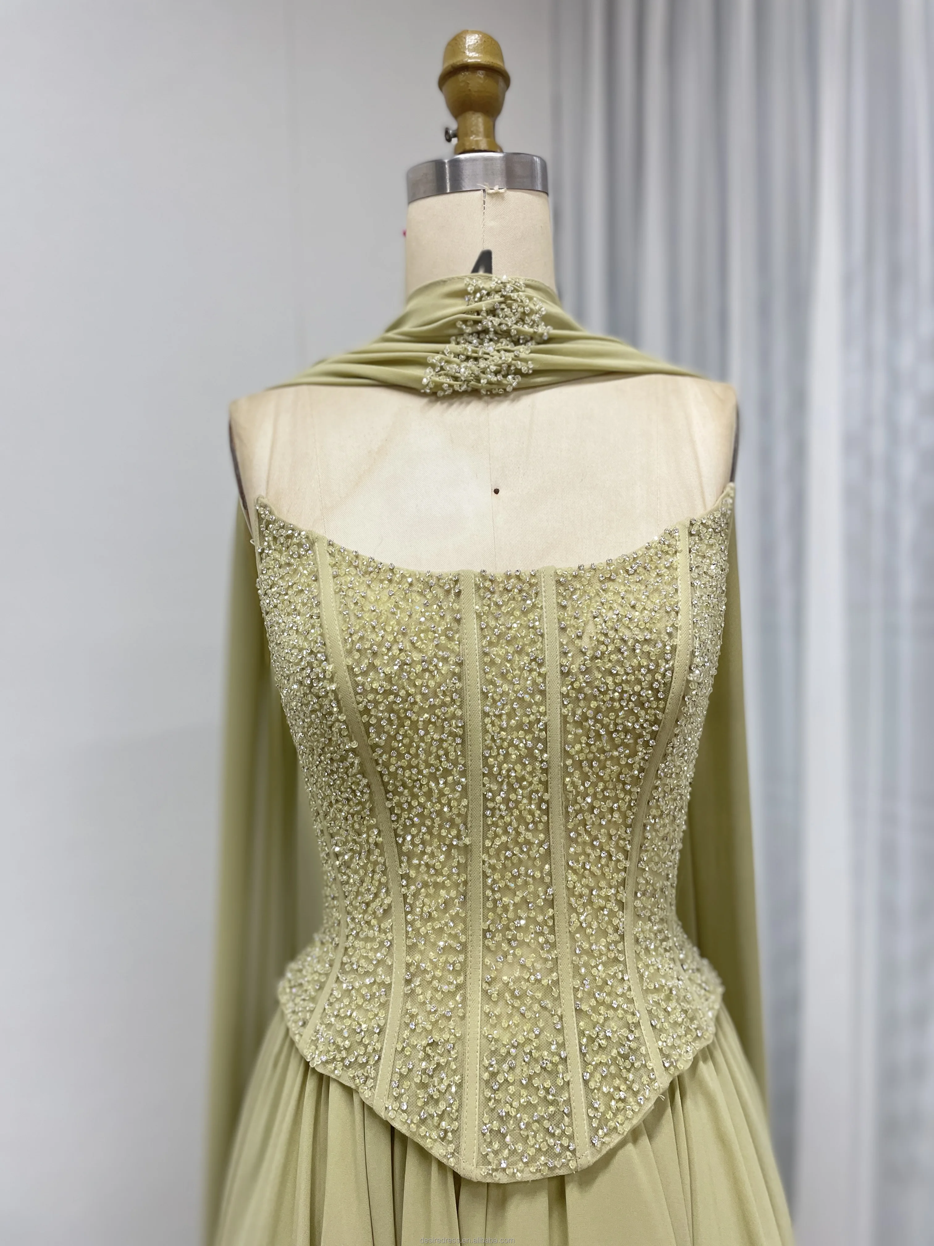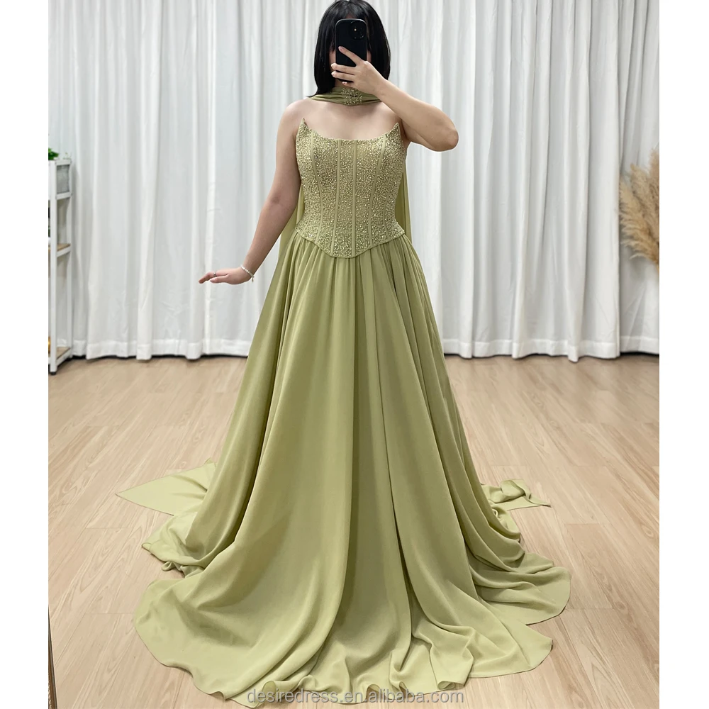 MB40438 Luxury Timeless Trendy Sage Green Beaded a Line Evening Gown With Elegant Scarf Long Dress for Gala Prom or Formal Party