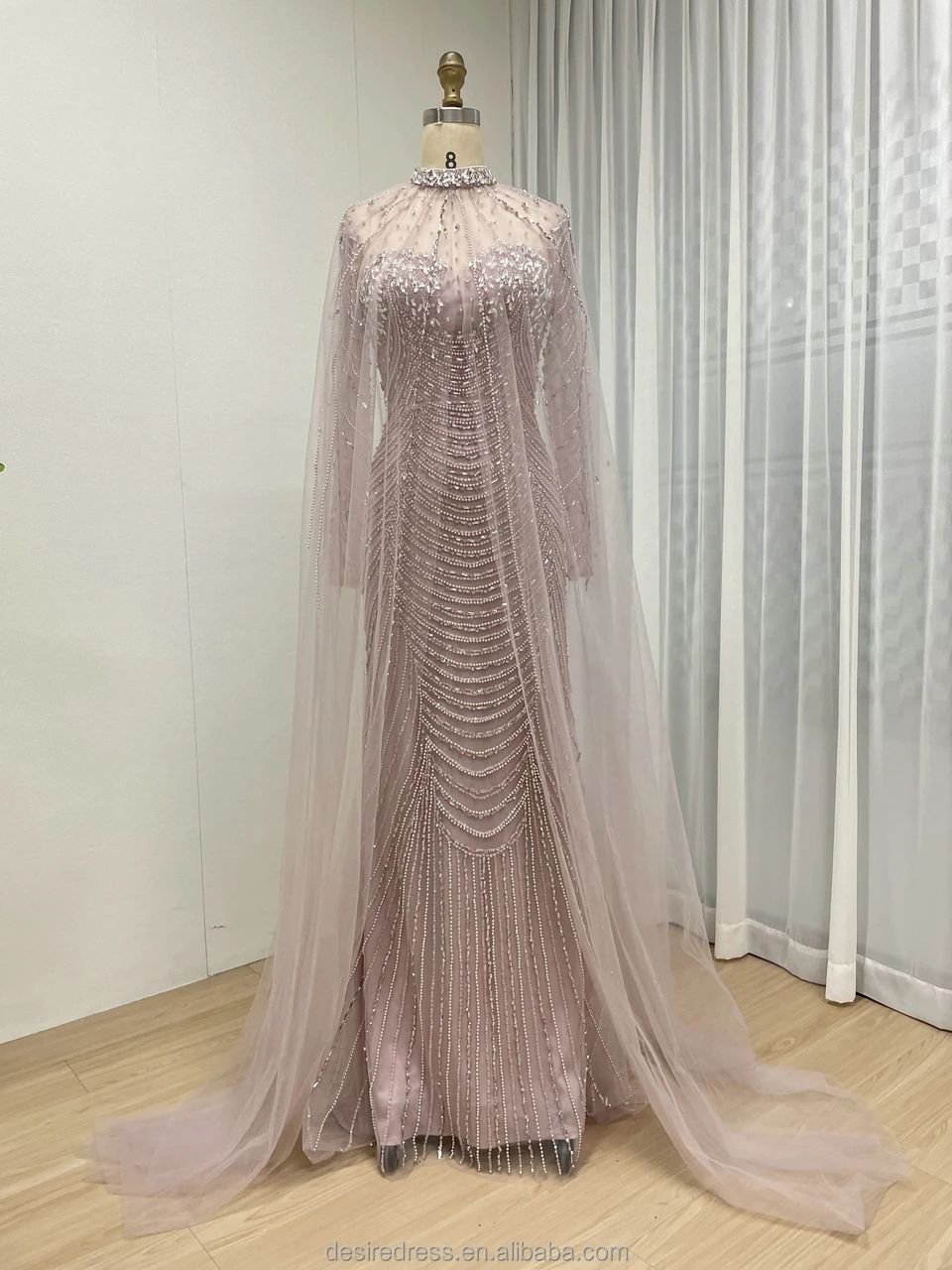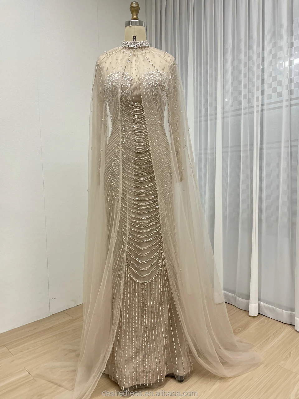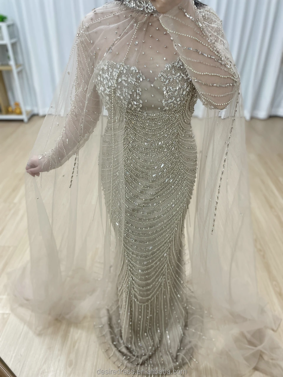 MC20102 Elegant Caramel Long Sleeves Mermaid Beaded Evening Dress with Cape Saudi Arabic Wedding for Bride Party Gowns for Women