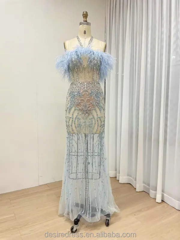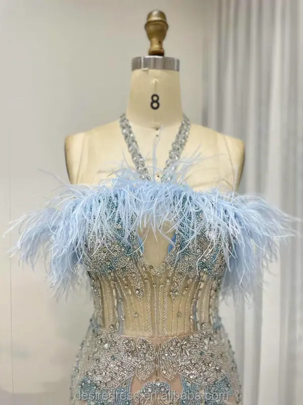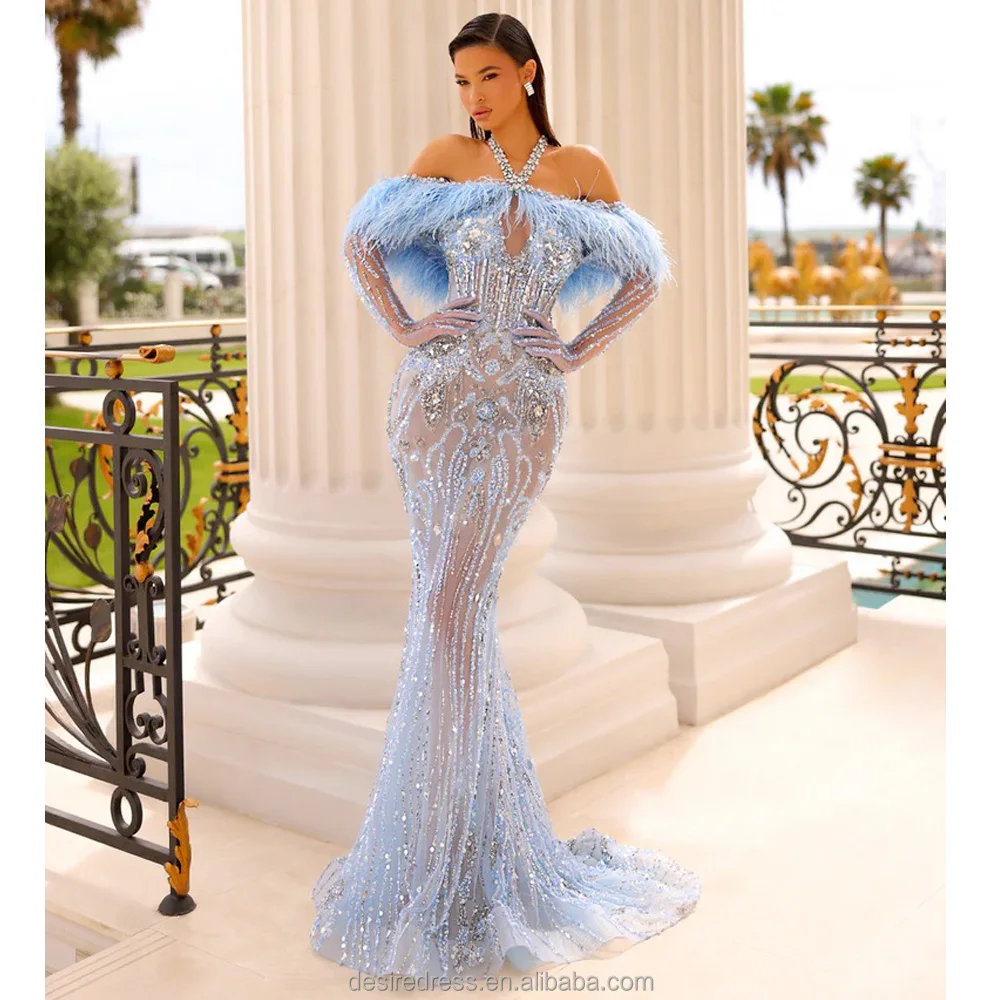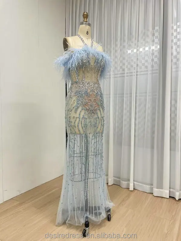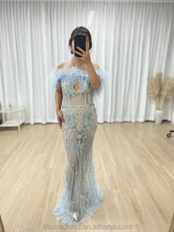 MB40417 Chic Graceful Feather Neckline Sexy Halter Sheer Prom Evening Dress Embellished With Luxurious Hand Beading for Parties