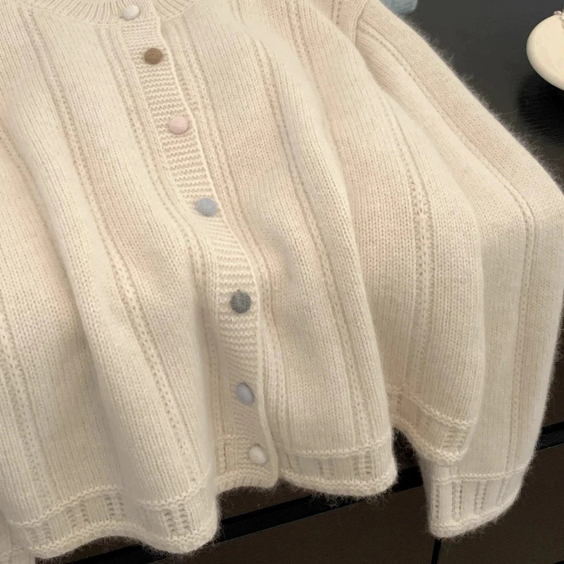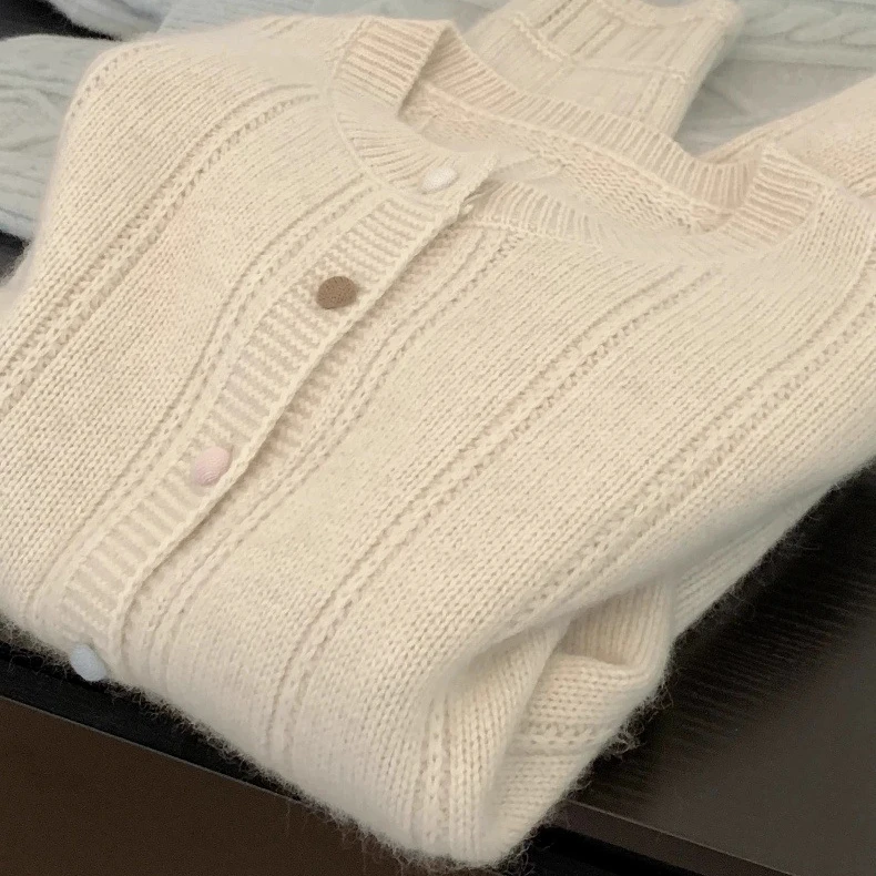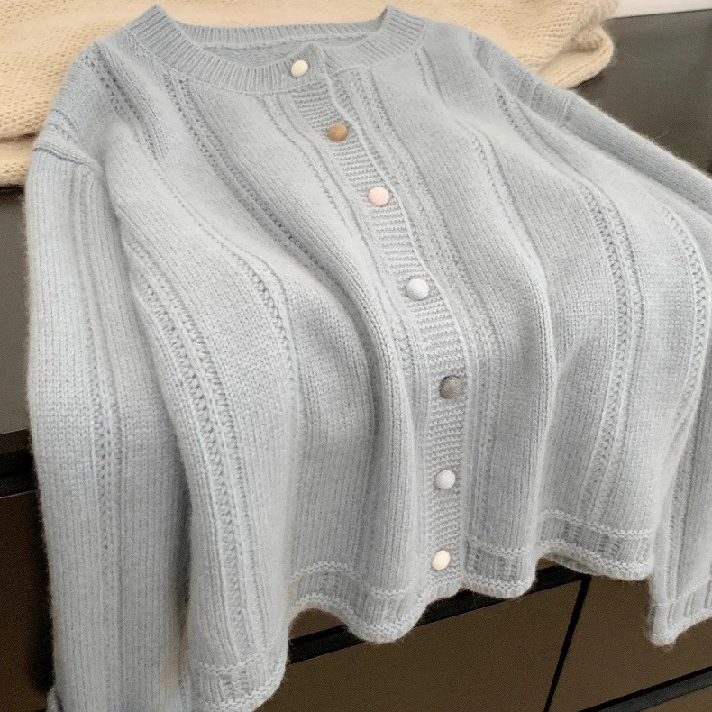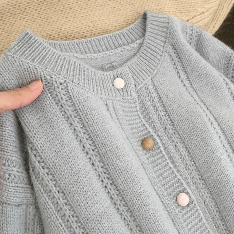 Autumn Winter Layering Women's Breathable Thick Crew Neck Long Sleeve French Pink Solid Button Knit Cardigan