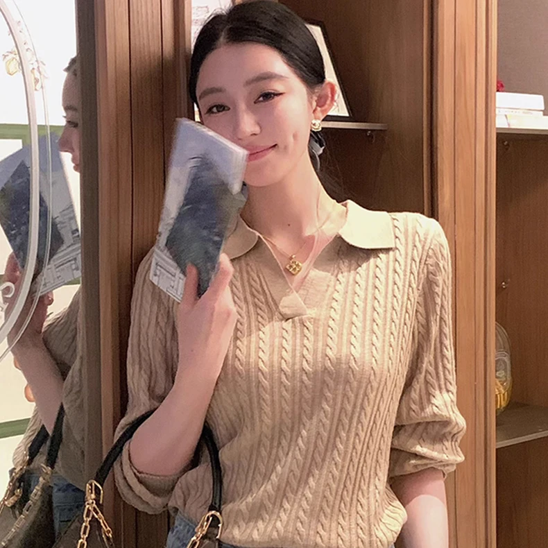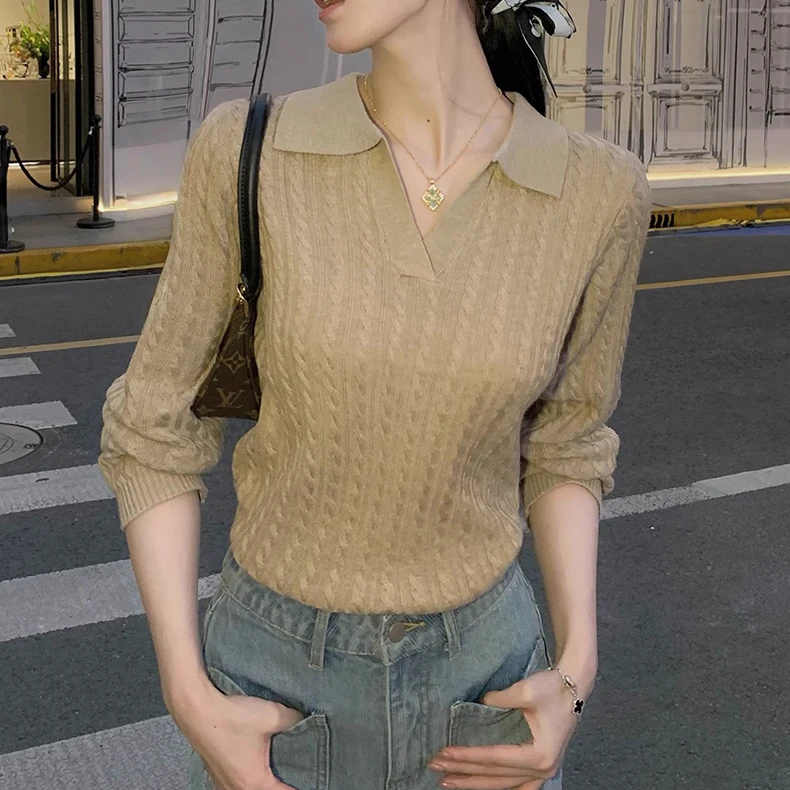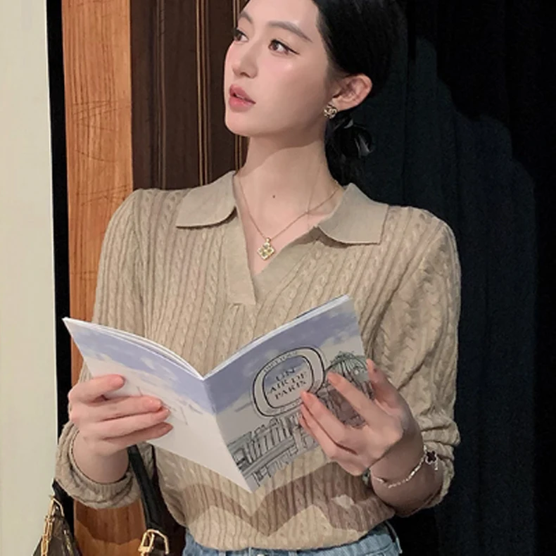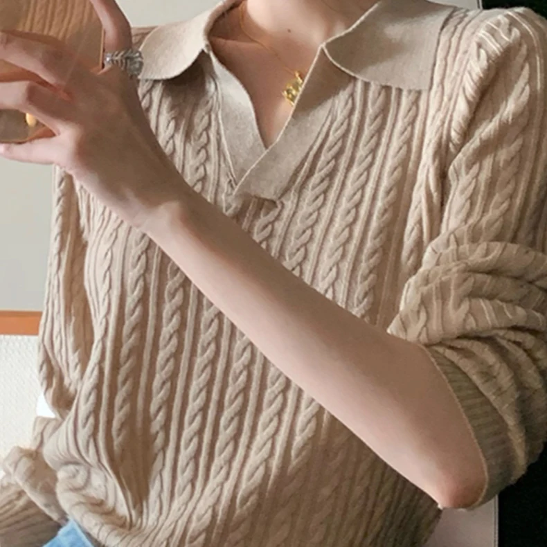 Khaki for Neck Casual Thick Knit Sweater Women Autumn/Winter Vintage Cable-Knit Layering Fashion Long-Sleeve