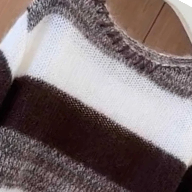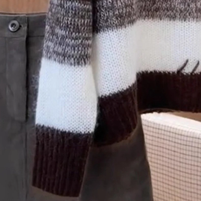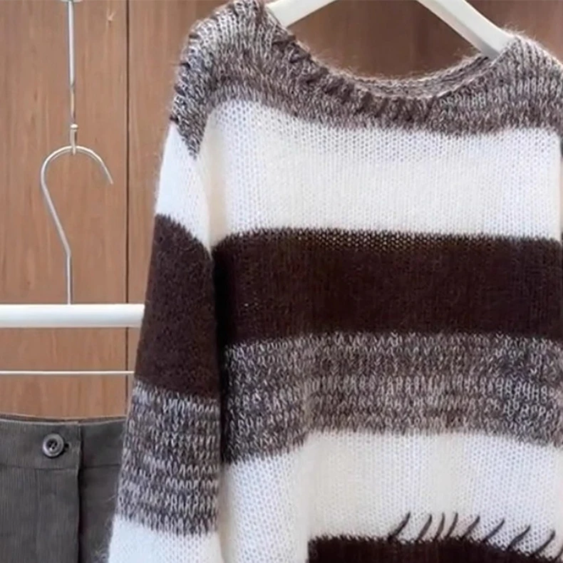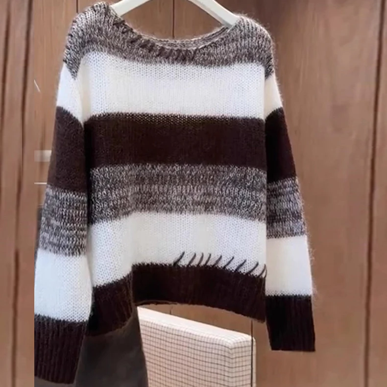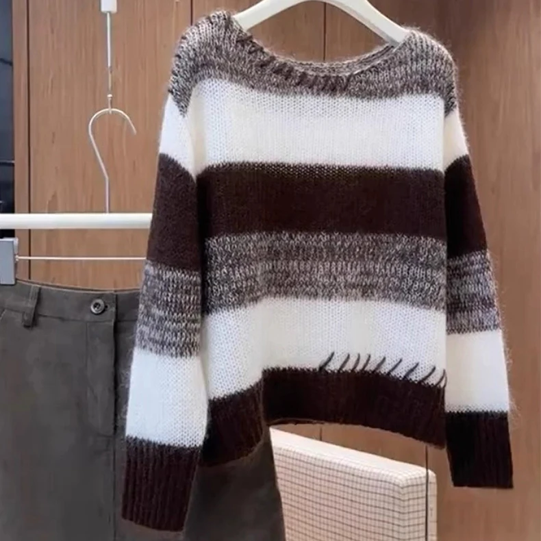 Casual Slouchy Wool Anti-Pilling Breathable Coffee-Colored Striped Crew Neck Long-Sleeve Knit Sweater Women Soft Flattering