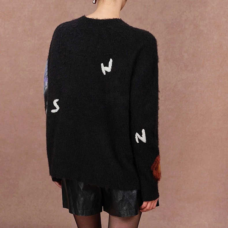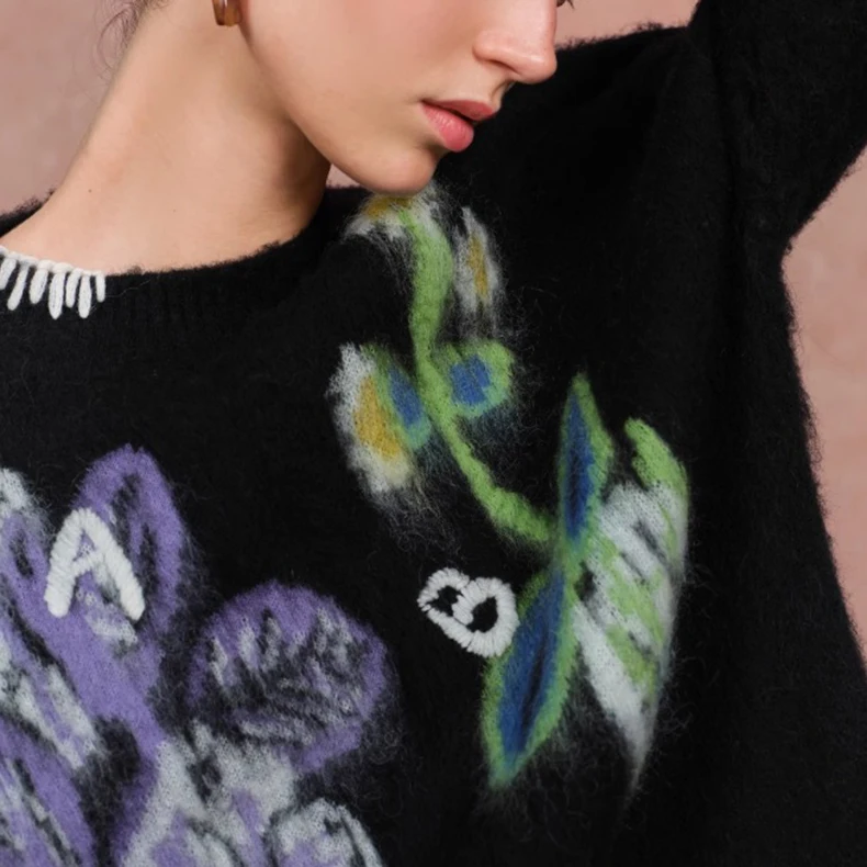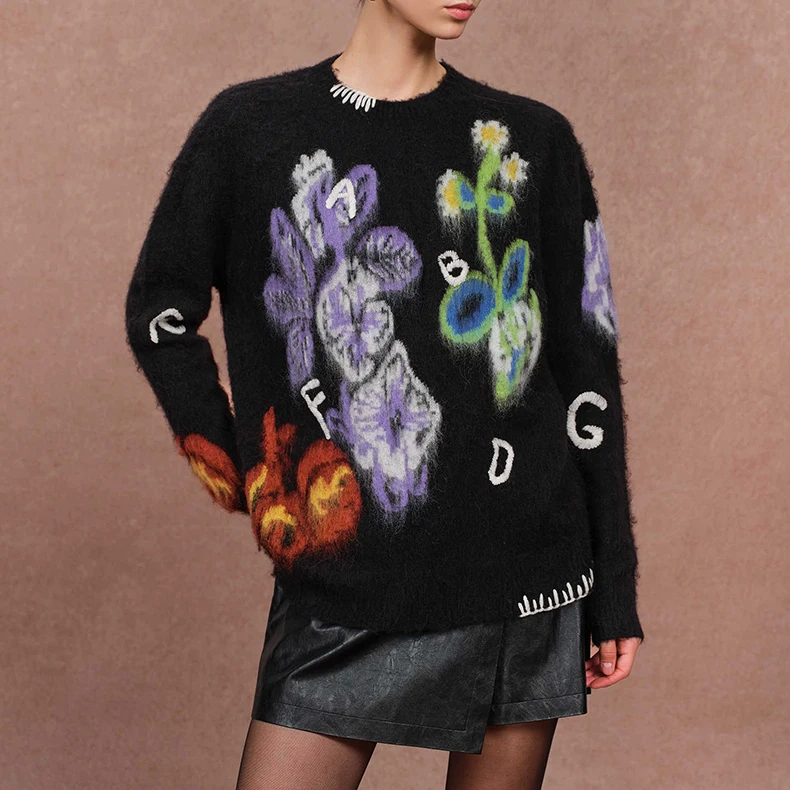 Women's Casual Thin Wool Jacquard Pullover Sweater with Floral Pattern Winter Knit Outerwear