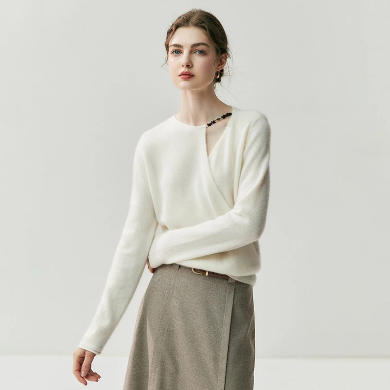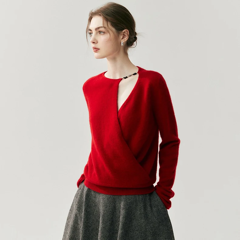 French-Style Asymmetrical Cross-Neck Casual Thin Cashmere Knit Women's Solid Color Oversized Pullover Base Layer Sweater