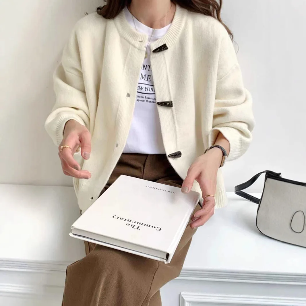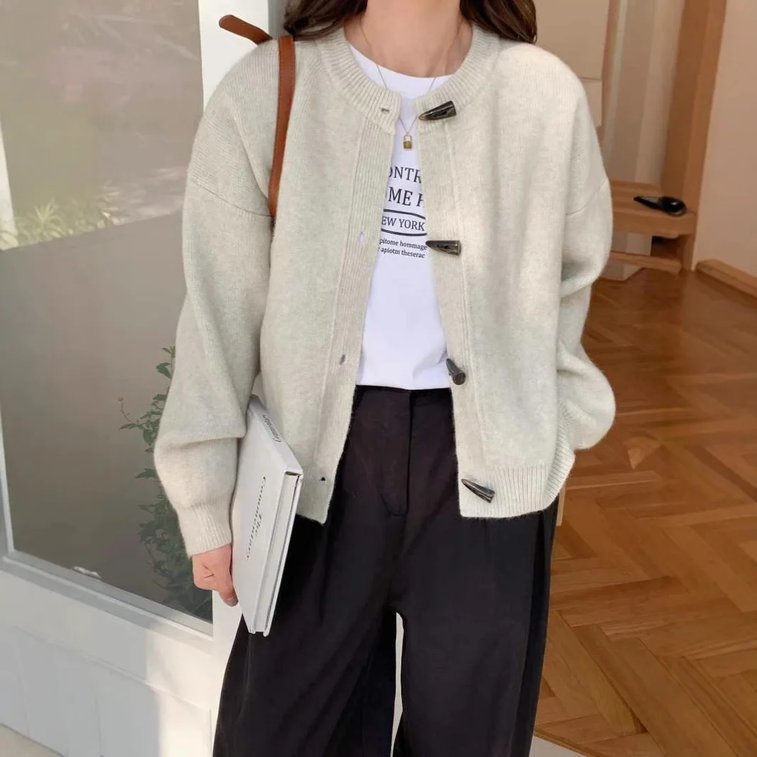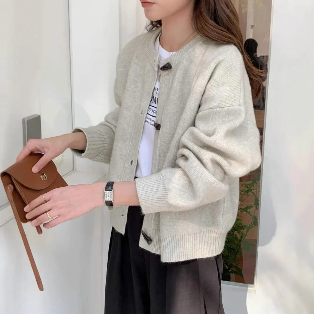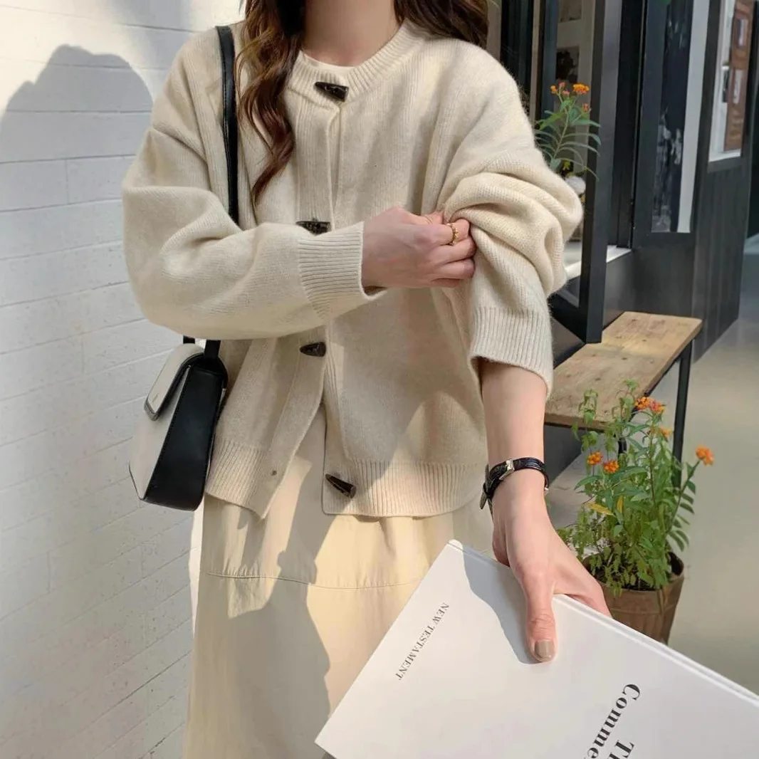 Sheep's Wool Solid Breathable Cardigan Jacket Women's Loose-Fit Horn Button Sweater Autumn/Winter Thickened Outerwear Wool Knit